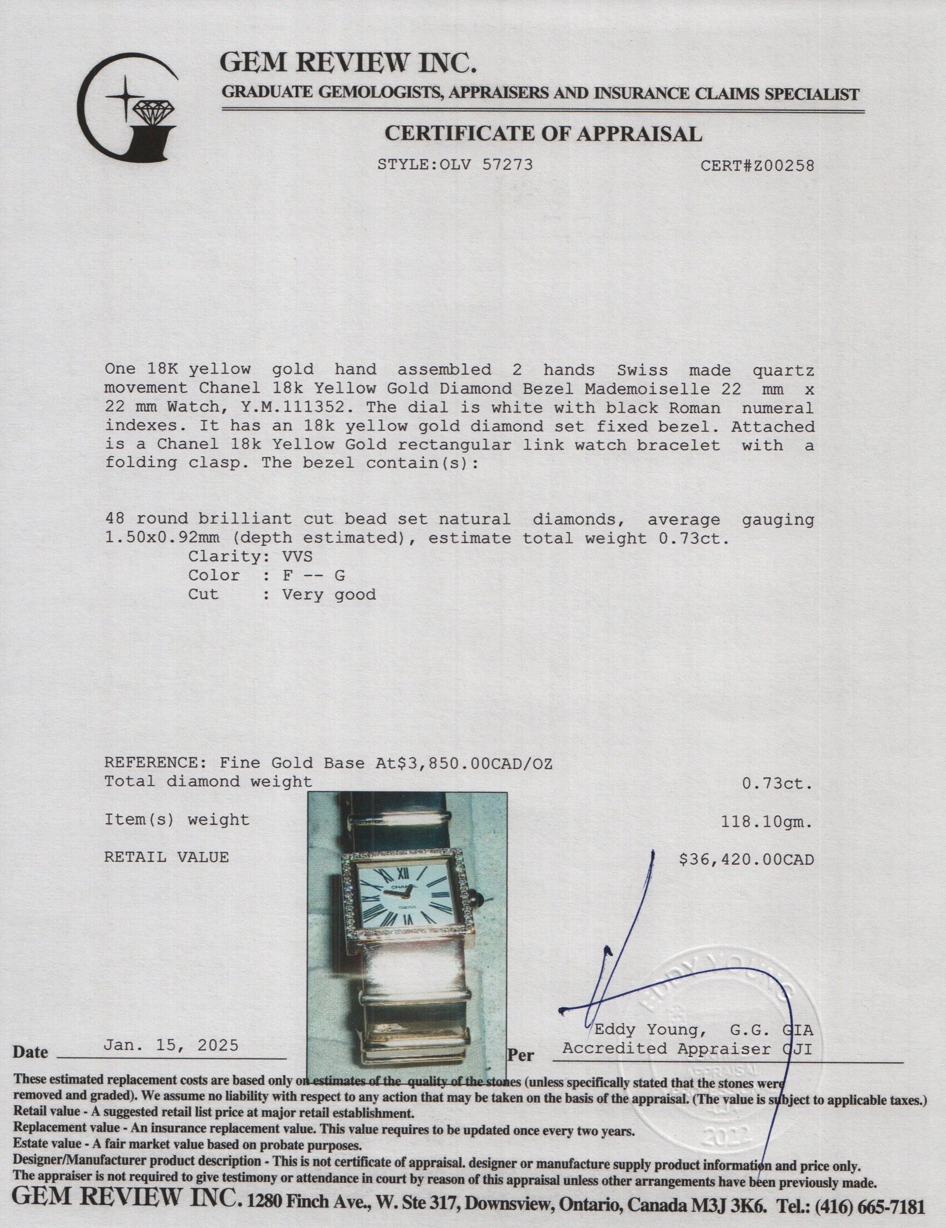 Chanel 18k Yellow Gold Diamond Bezel Mademoiselle Watch
