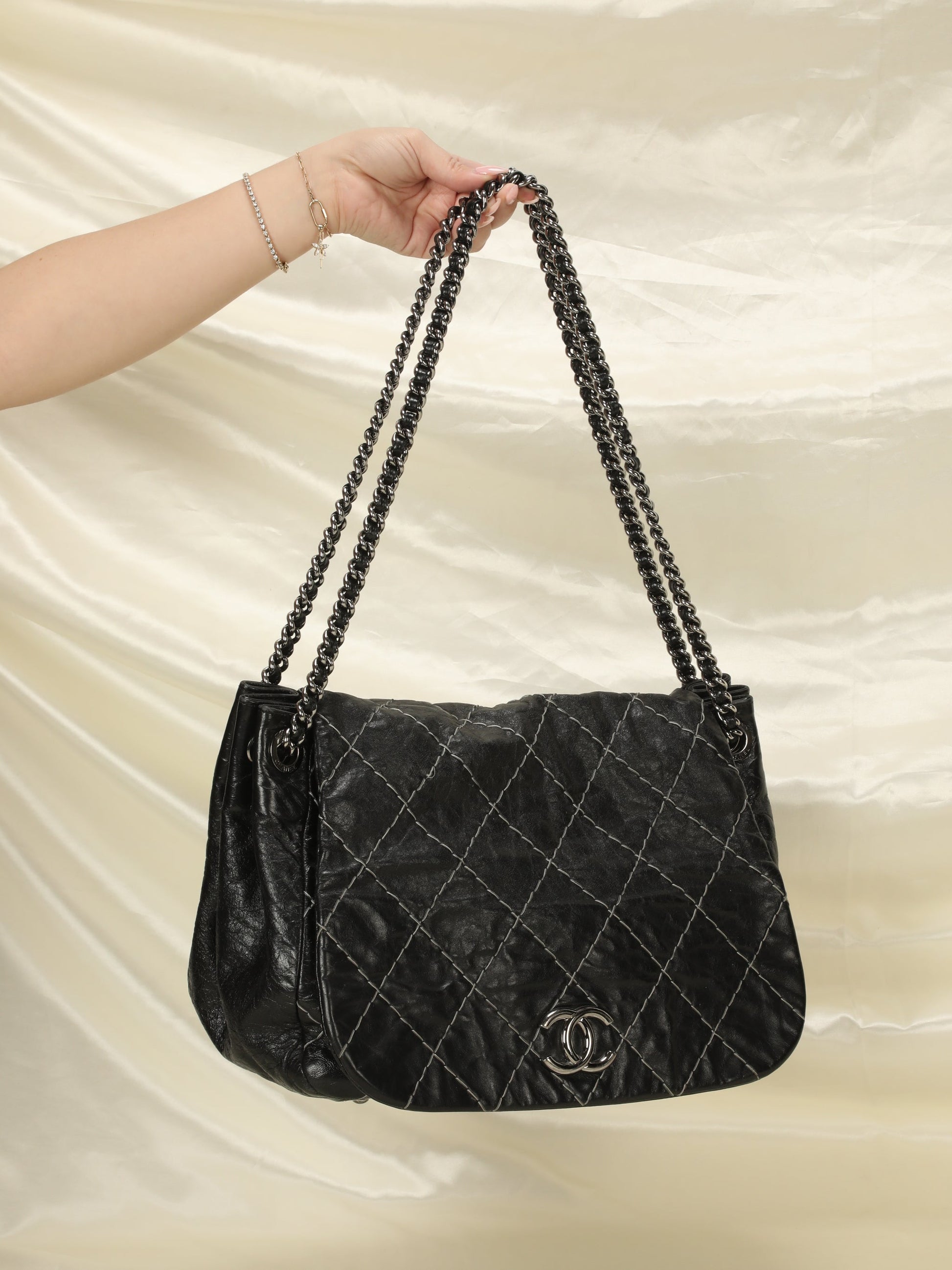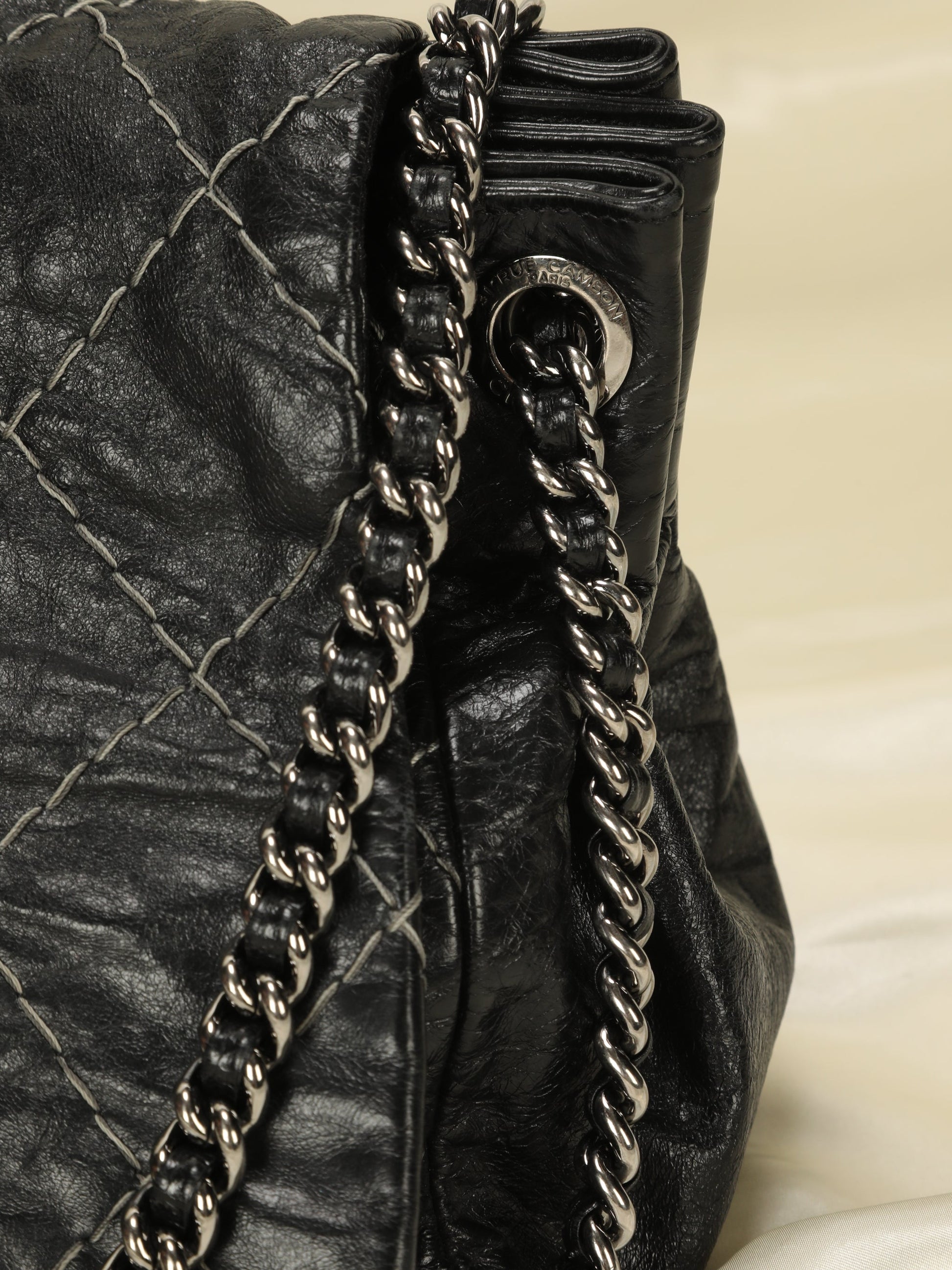 Crafted in Chanel's calfskin material, this shoulder bag proves durable. The intricate stitching along with the edgy chain allows for this piece to stand out. Perfect for elevating your outfit when on-the-go! Extremely spacious and can hold everything you need for the day! 2900+!