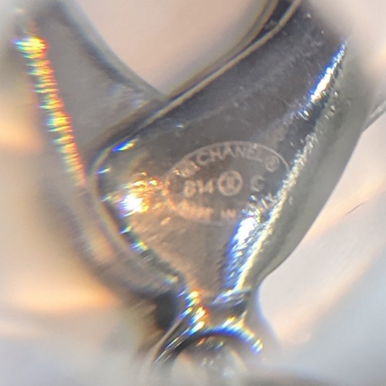 This necklace is a chain interspersed with white rhinestone tabs. A piece of chain sports the CC emblem of the brand, and the necklace also hangs at the end of the chain another big CC emblem, all rhinestones.