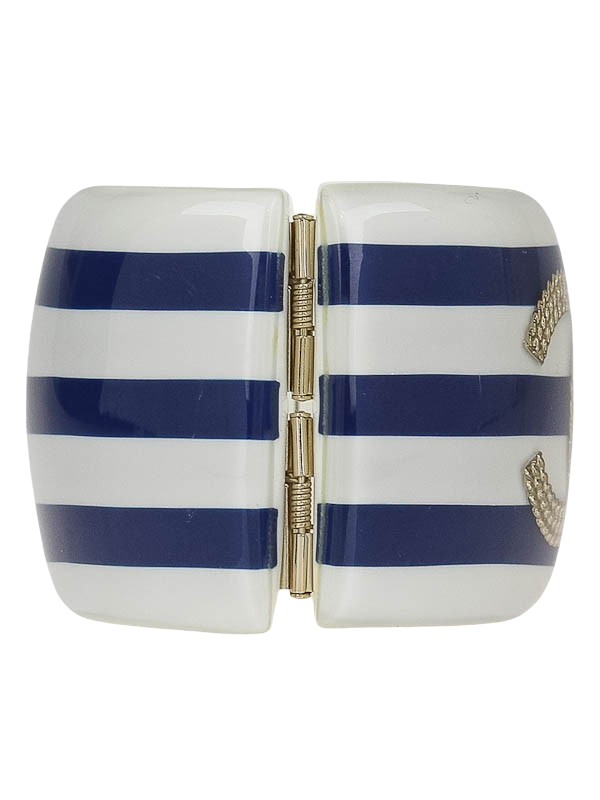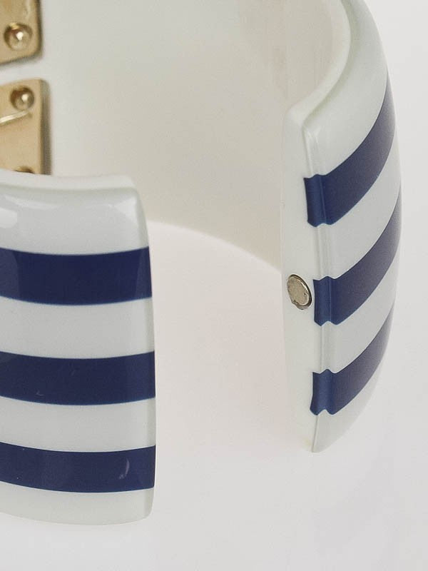 DESCRIPTION: Chanel cuff in resin featuring blue and white stripes with inlaid braided CC logo