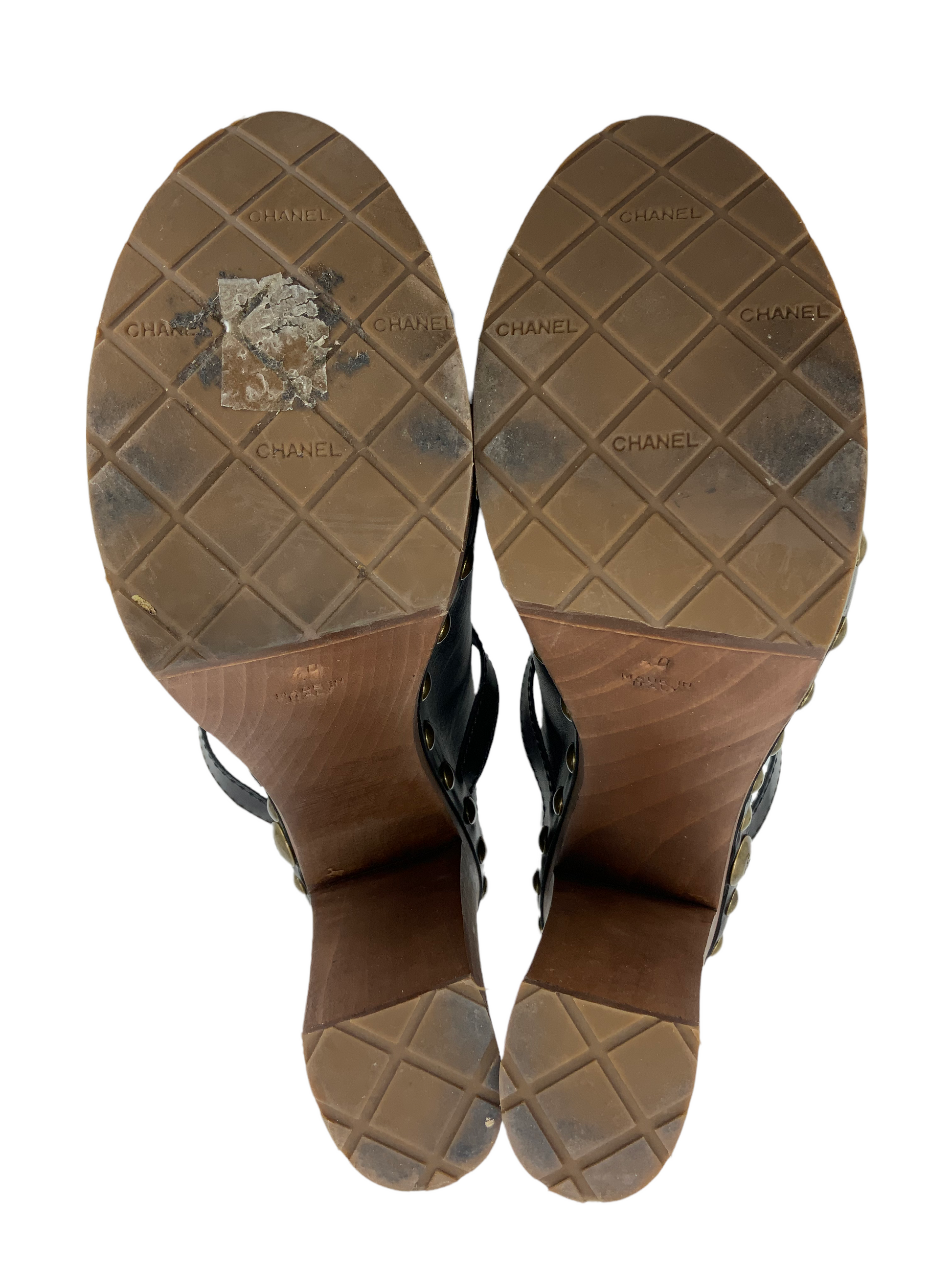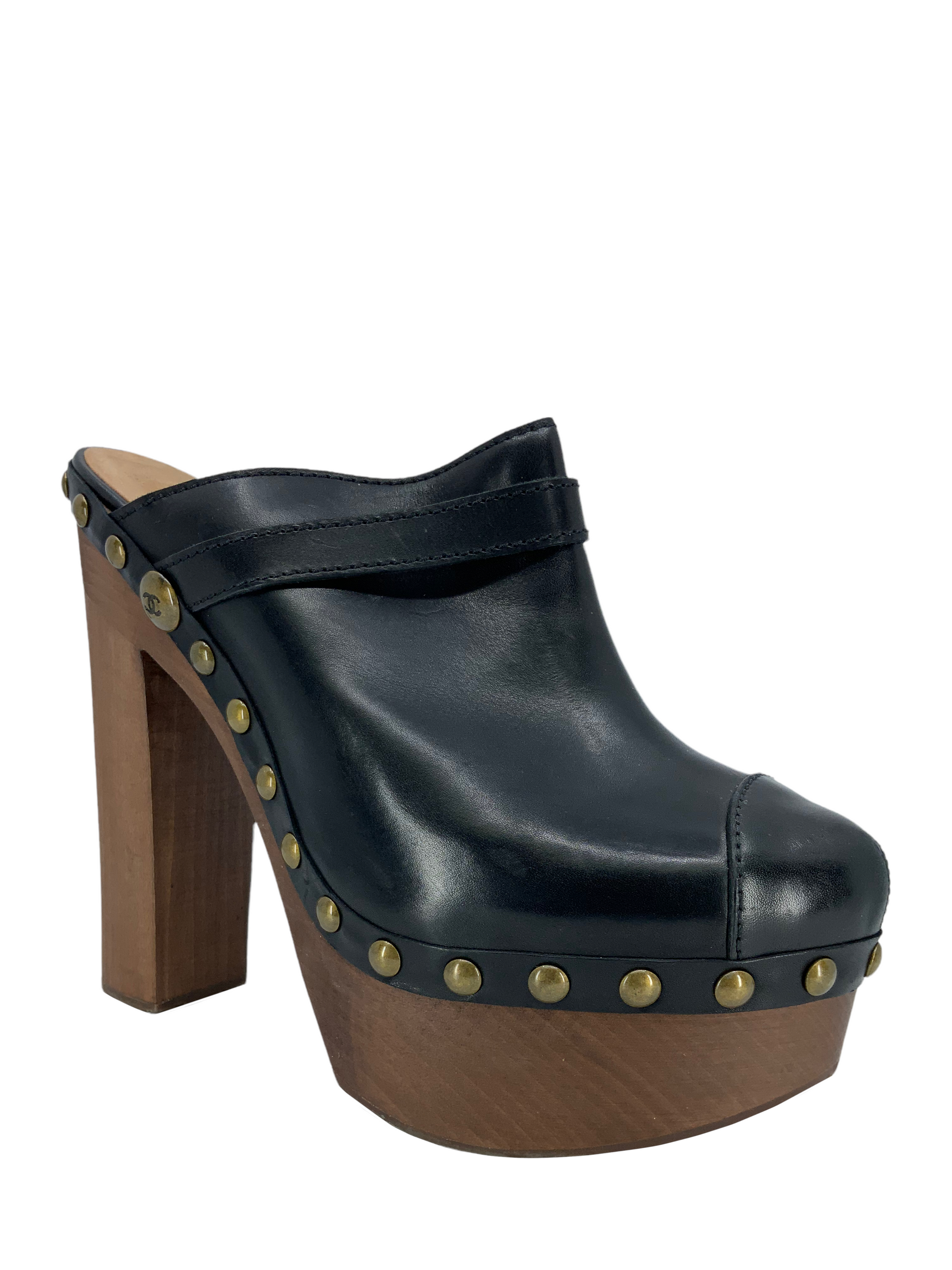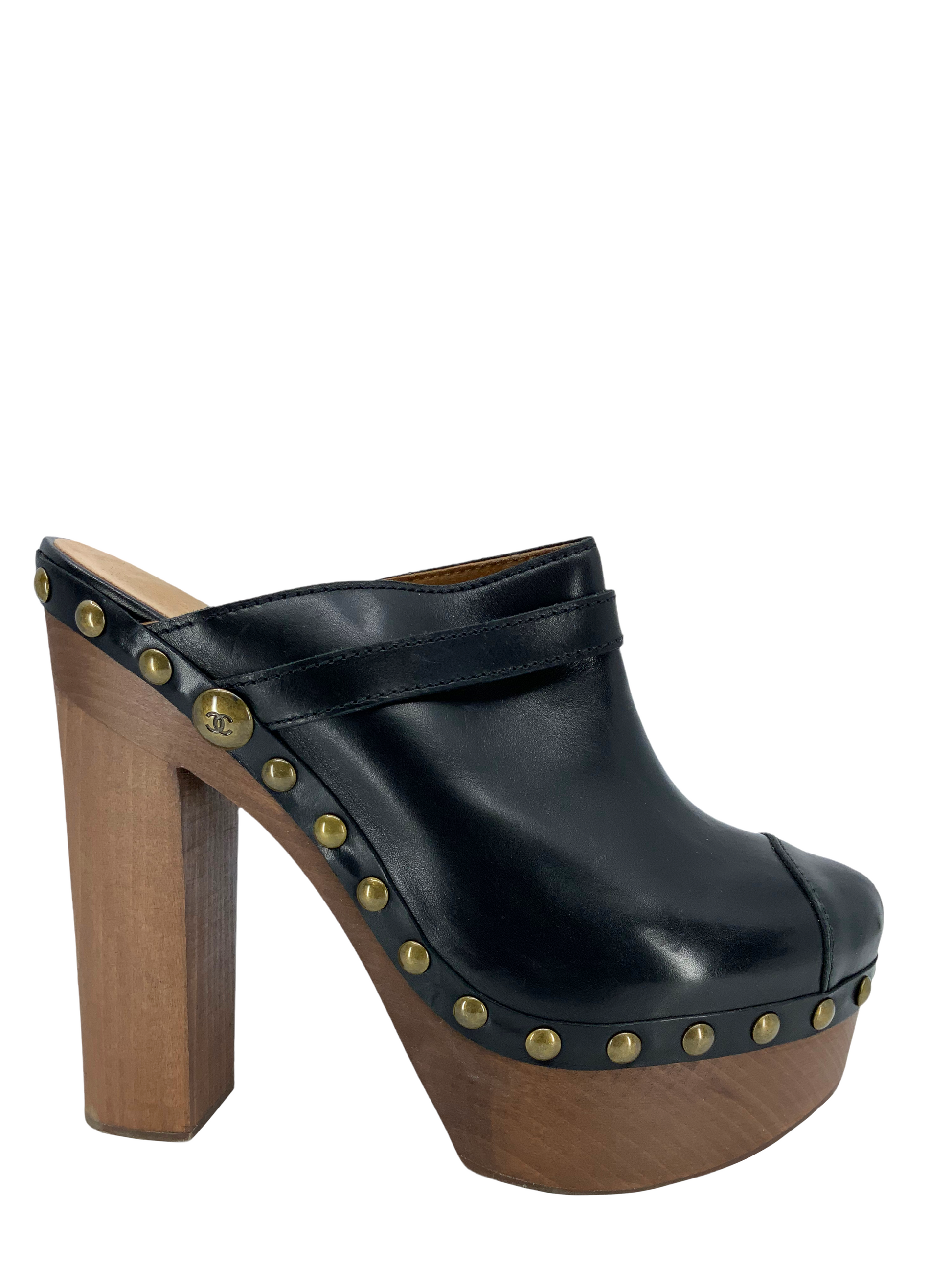CHANEL Studded Leather Wooden Platform Mule Clogs Size 10