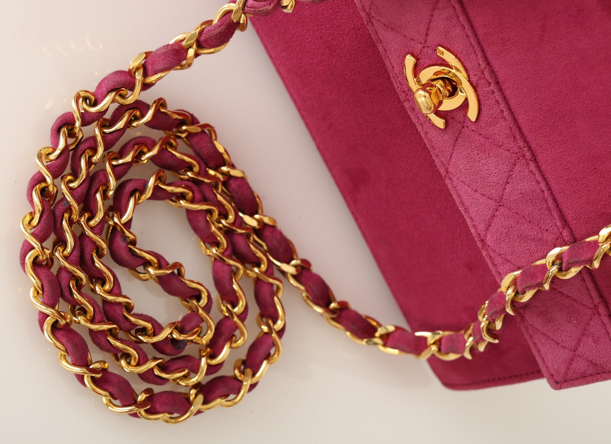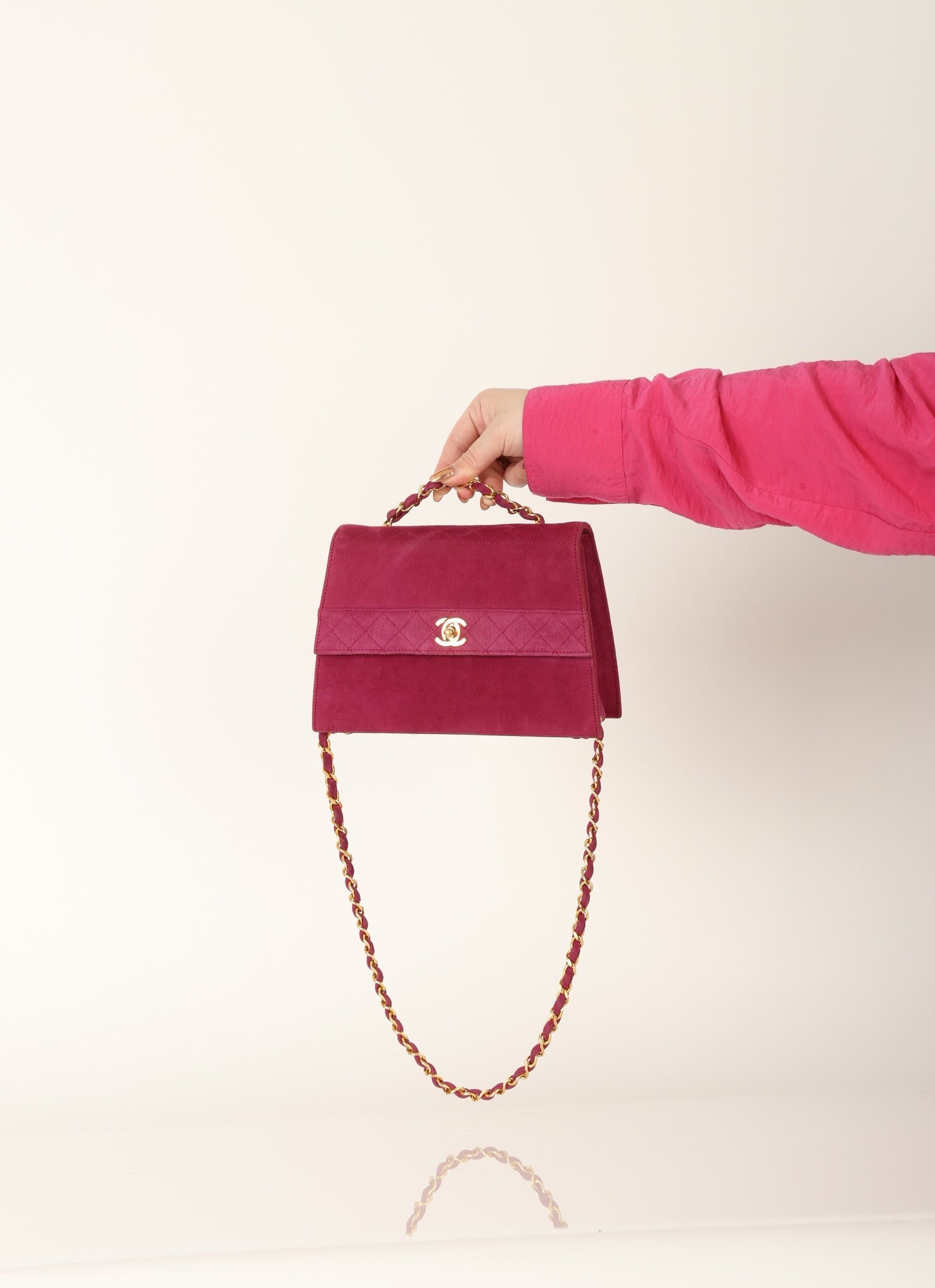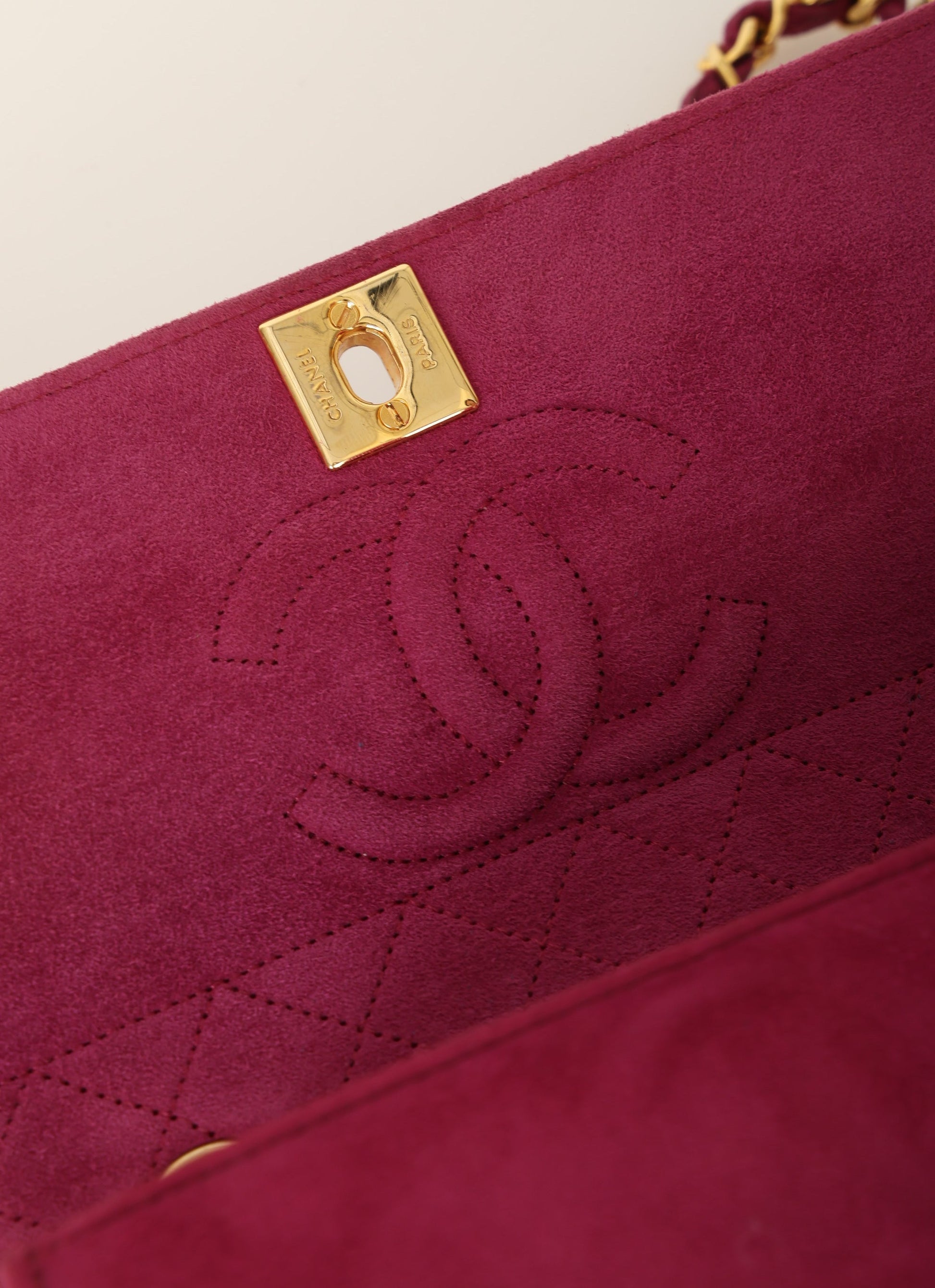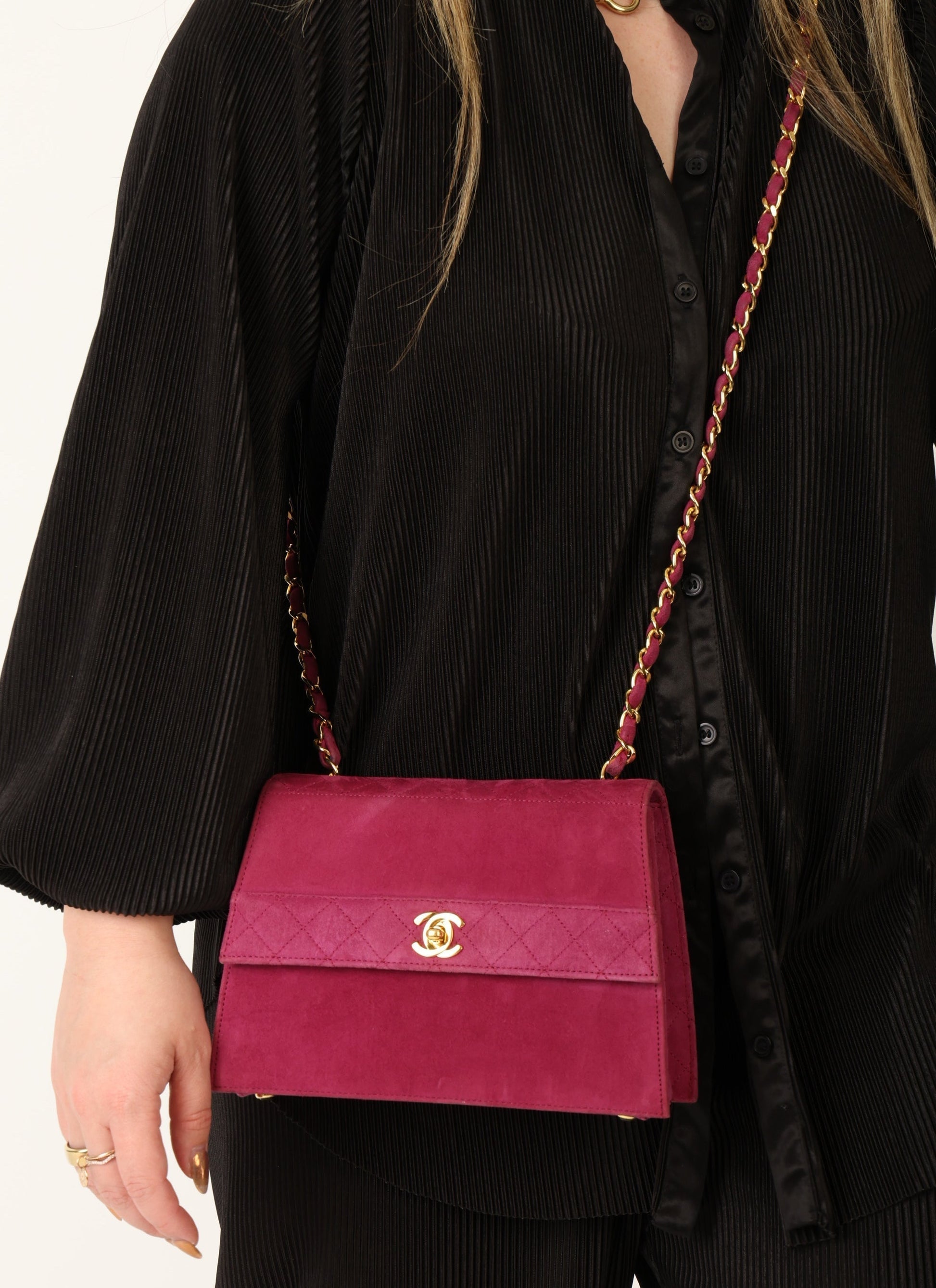 Dropping in the shop is a stunning Chanel Suede Trapezoid Flap in a gorgeous shade of magenta with 24k gold plated hardware! What makes this bag ultra-rare is the magenta suede! Vintage Chanel crafted in the 90s means 24k gold plated!?Such?a classic piece that can be loved for years to come. This versatile piece be as a long or short-shoulder bag. Such a beautiful bag to add to your collection! You can fit your?phone, wallet, keys, sunglasses, and a few other smaller essentials.?
