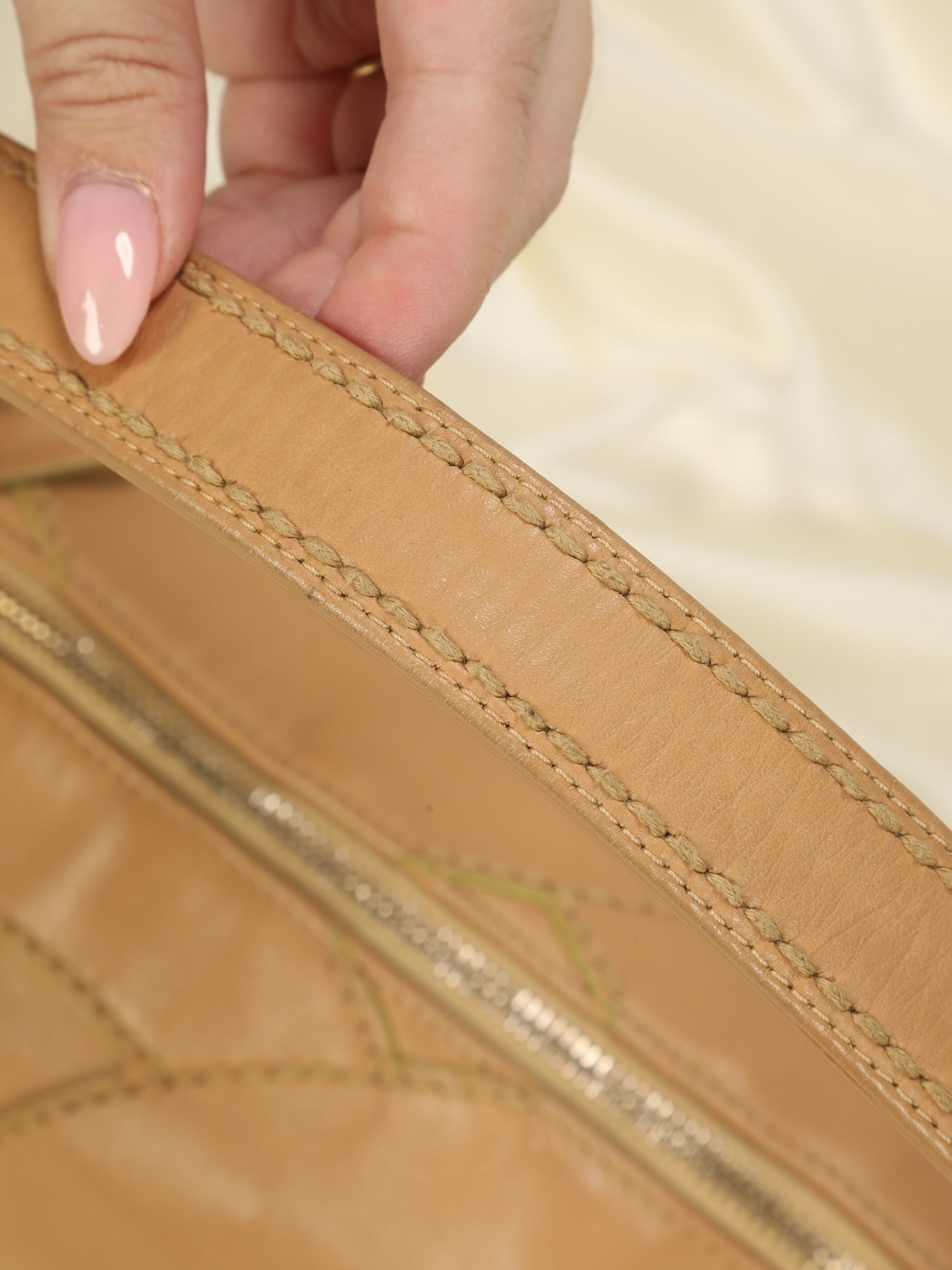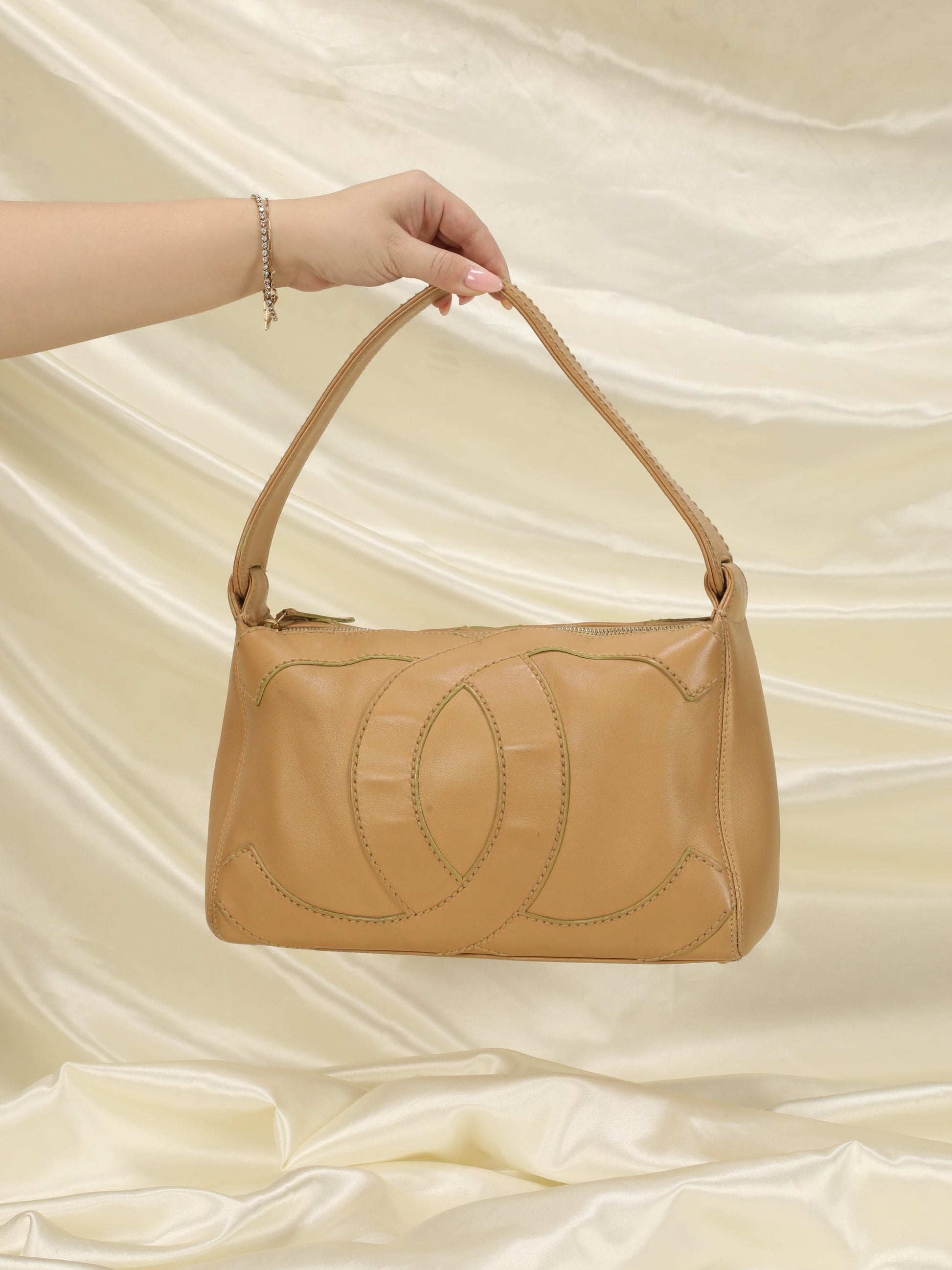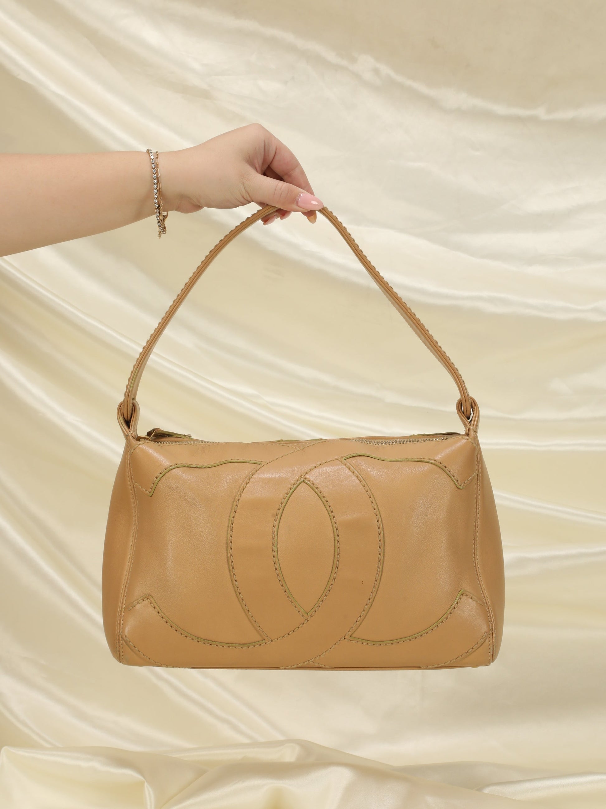 This neutral-toned Chanel shoulder bag is perfect for every outfit and any occasion! Huge Chanel logo stitched on both sides of the calfskin?bag!?