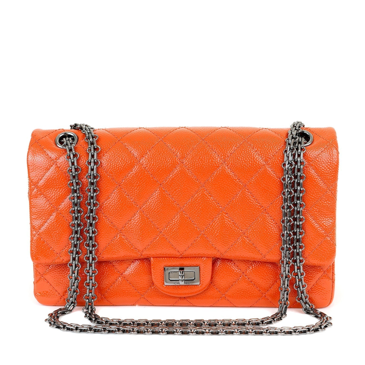Bright tangerine orange caviar leather has a glazed finish and is quilted in signature Chanel diamond pattern. Dark gunmetal hardware accents and mademoiselle twist lock closure. Bijoux style chain may be carried single or double. Dust bag included.