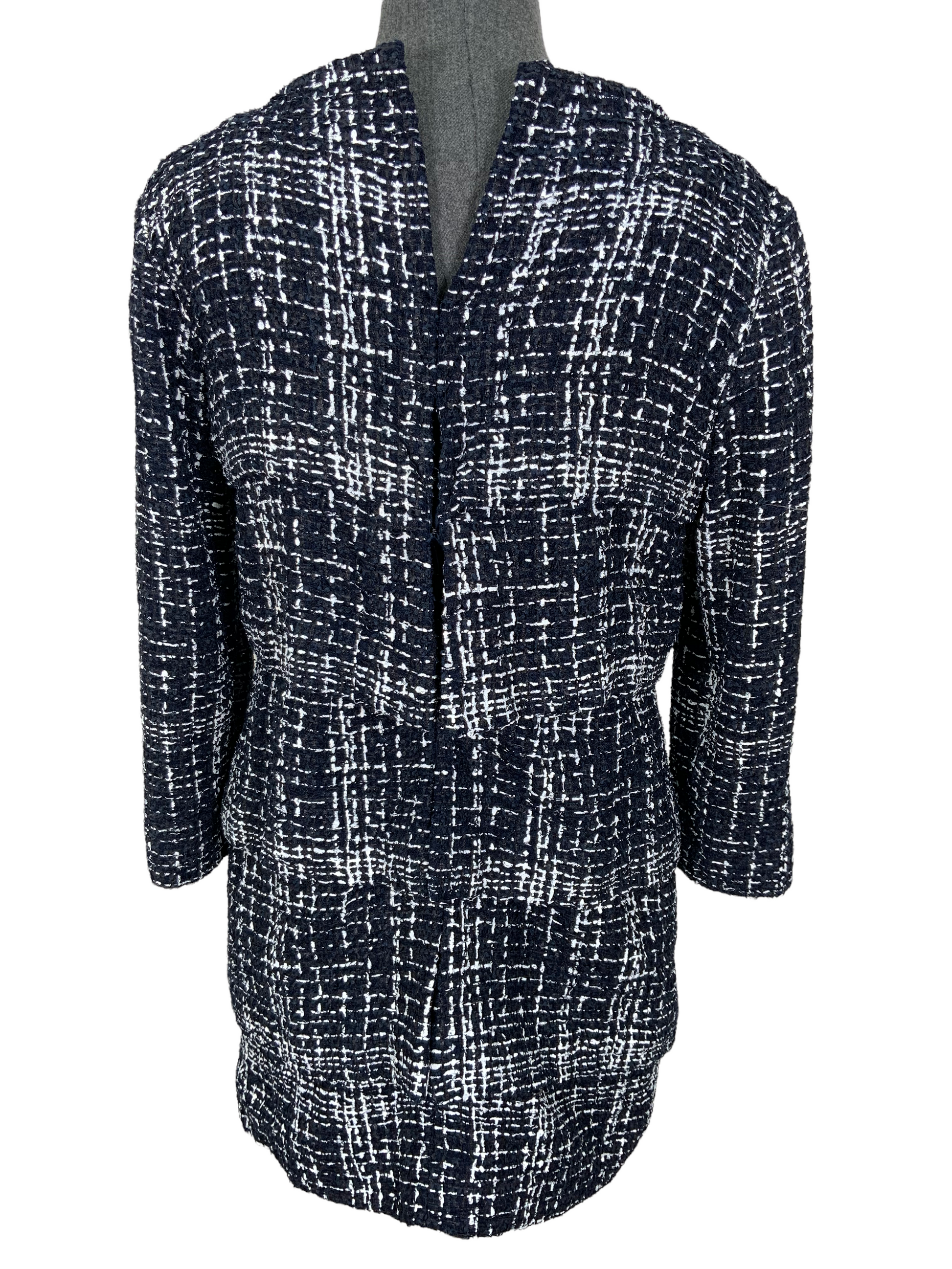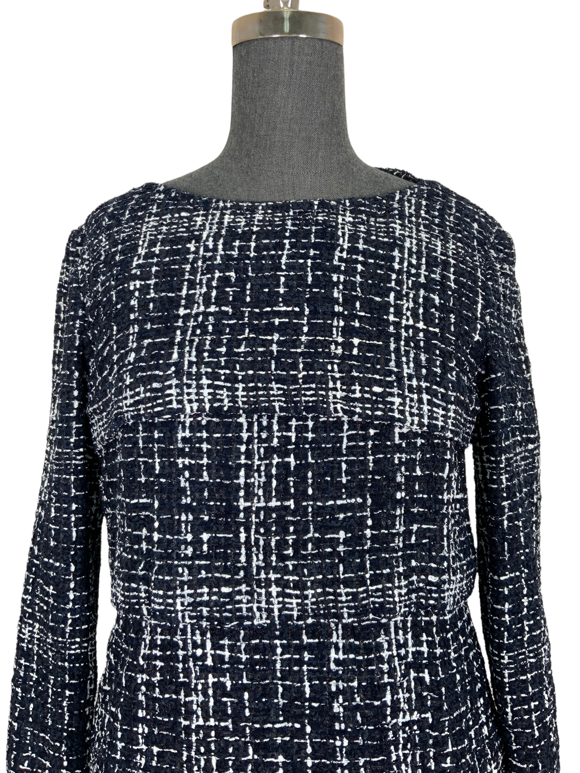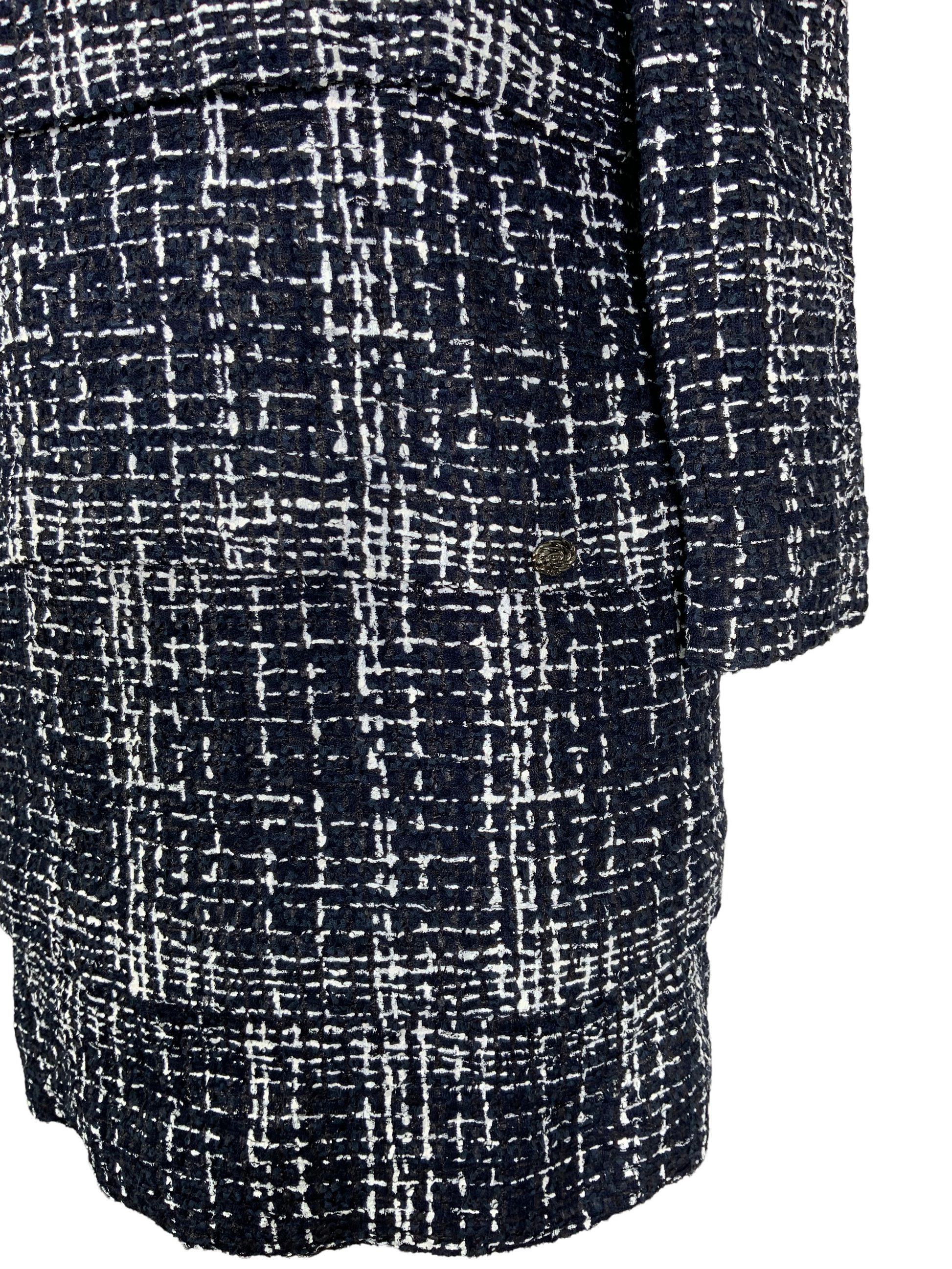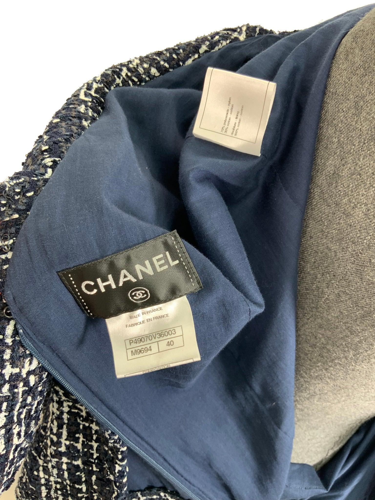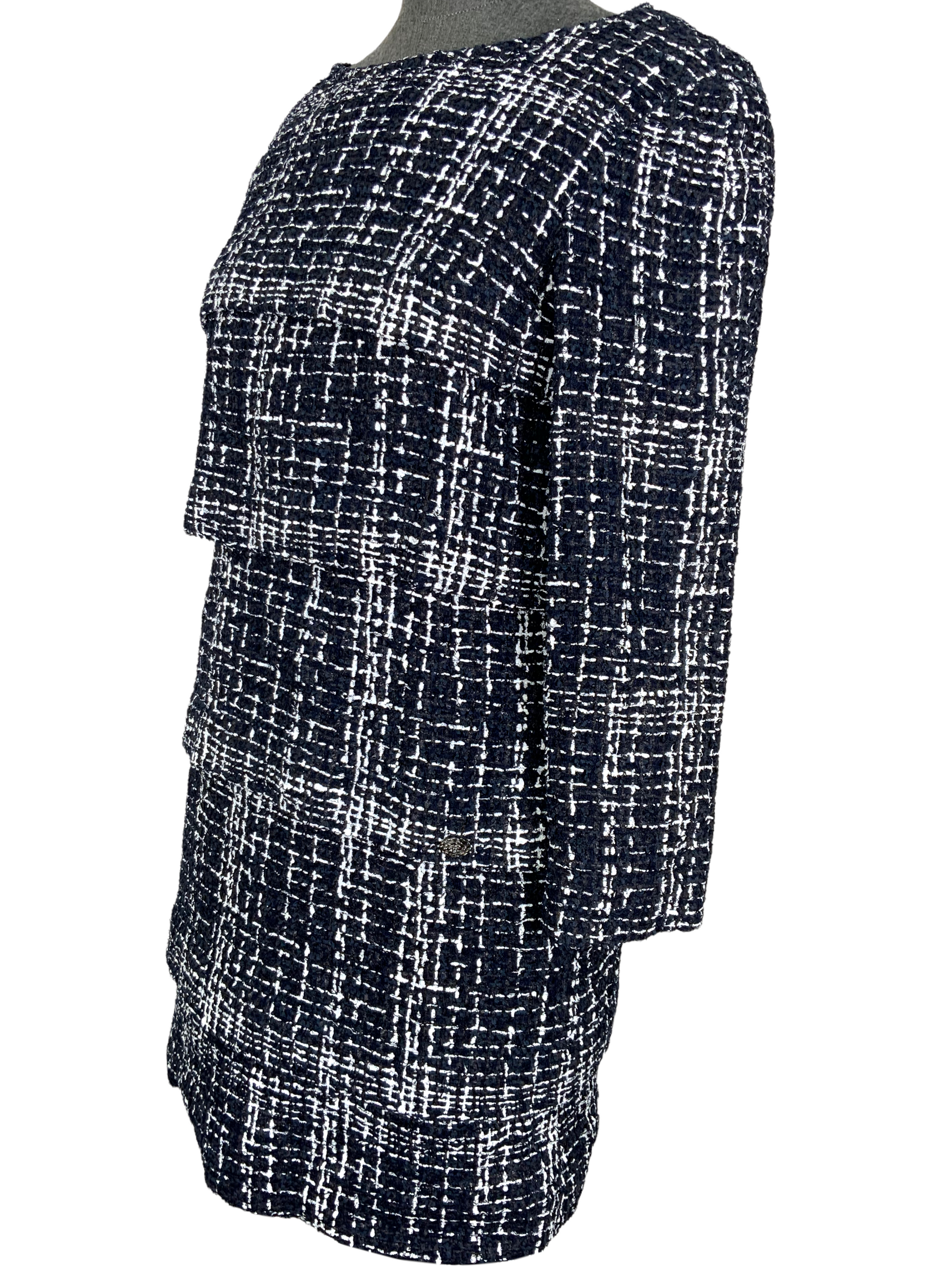 d ! Chanel Tiered Tweed Mini Dress Size M (FR 40) from Spring 2014 Collection by Karl Lagerfeld crafted innavy blue and white nylon and cotton. Featuring 3/4 sleeves, a bateau neckline and a concealed hook and zipper closure at the back.