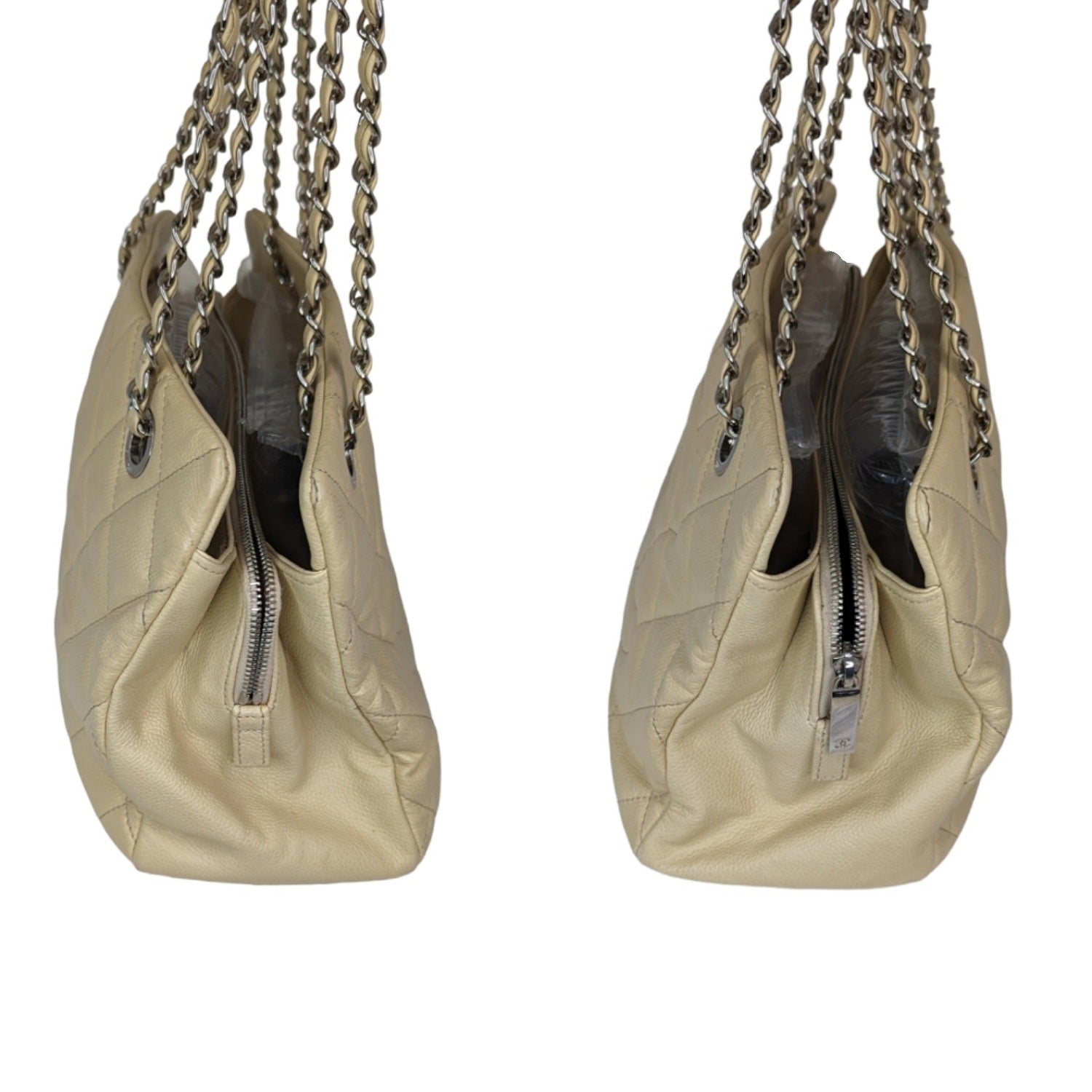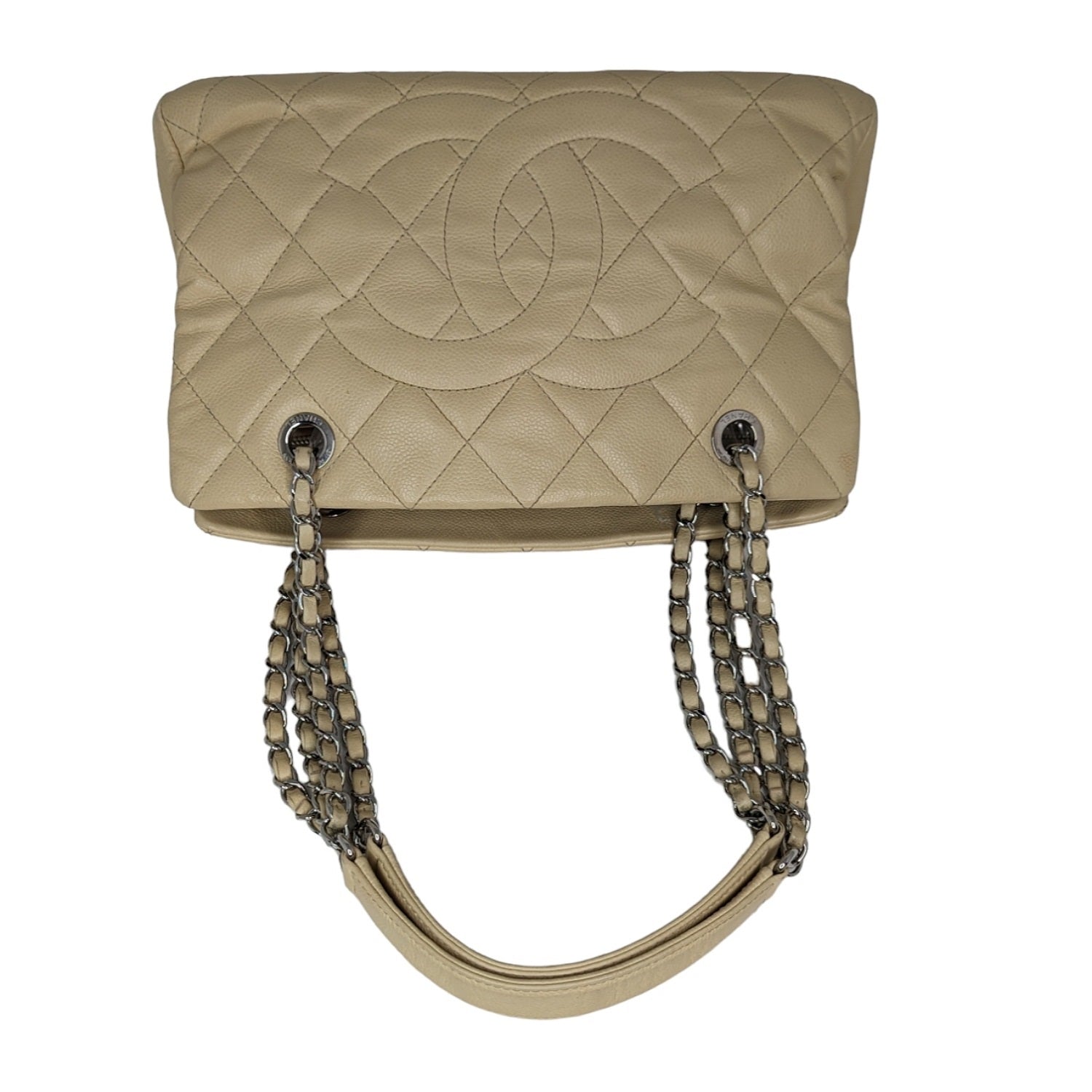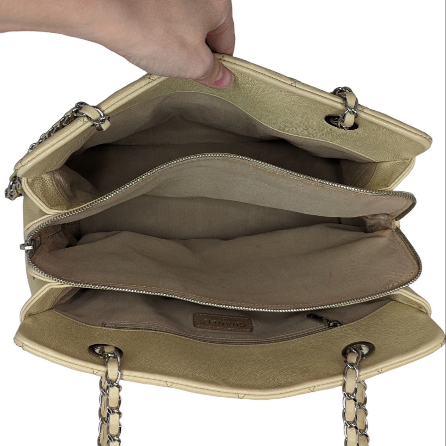 This Chanel Timeless Classic Caviar Quilted Tote is crafted from light beige quilted caviar leather. It features leather woven chain straps with leather shoulder pads, protective base studs, and silver-toned hardware. The interior is a camel-colored textile with one zippered pocket and 2 patch pockets. is 2750.