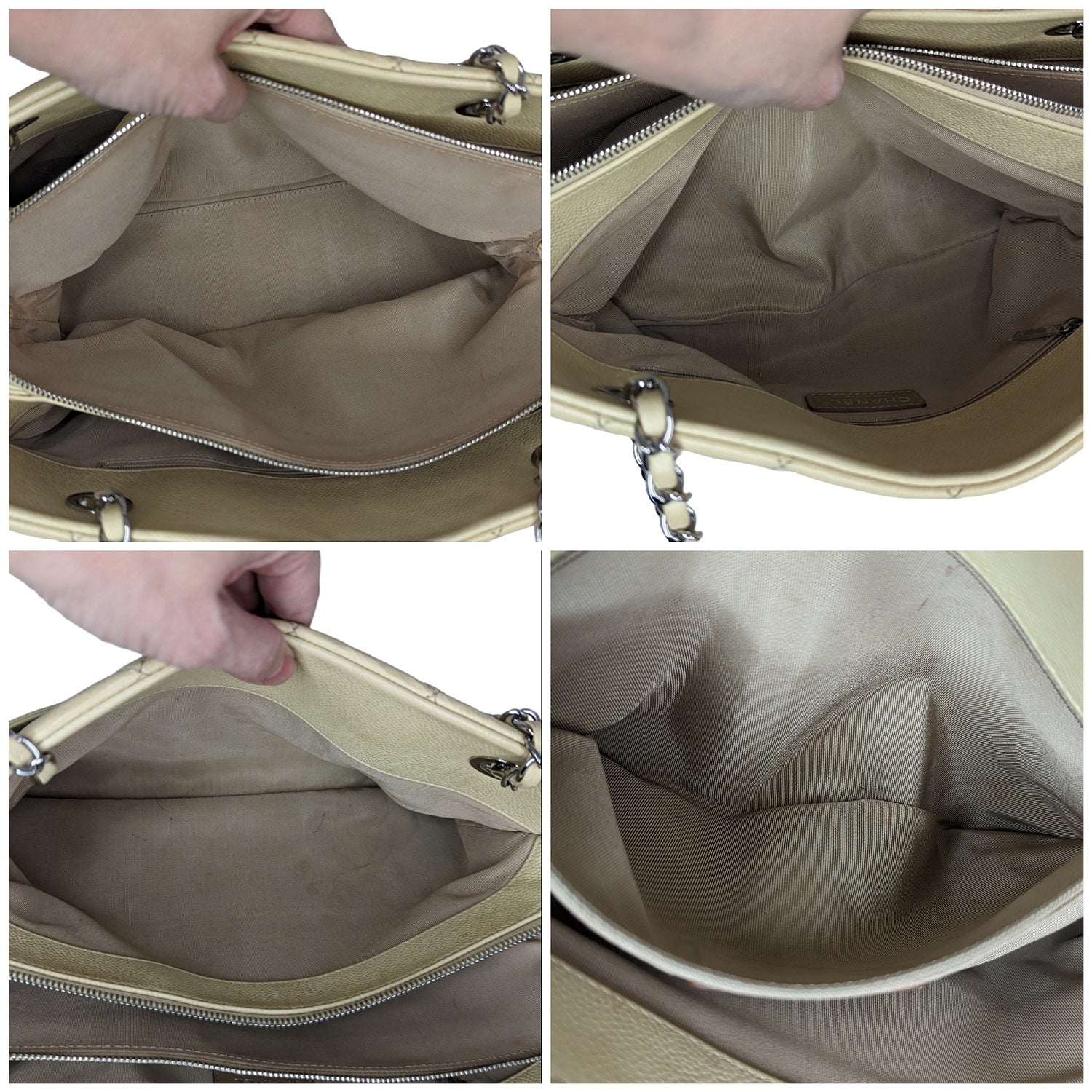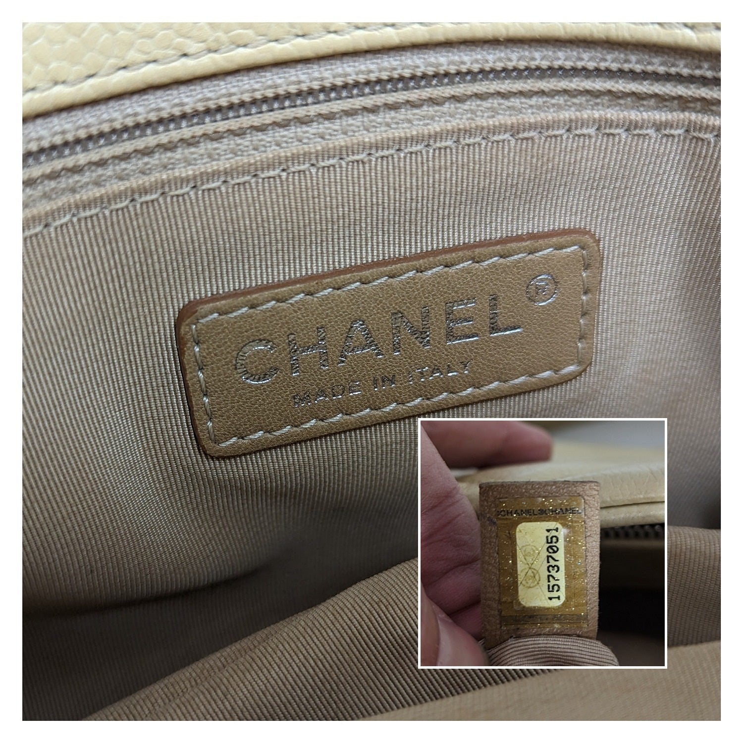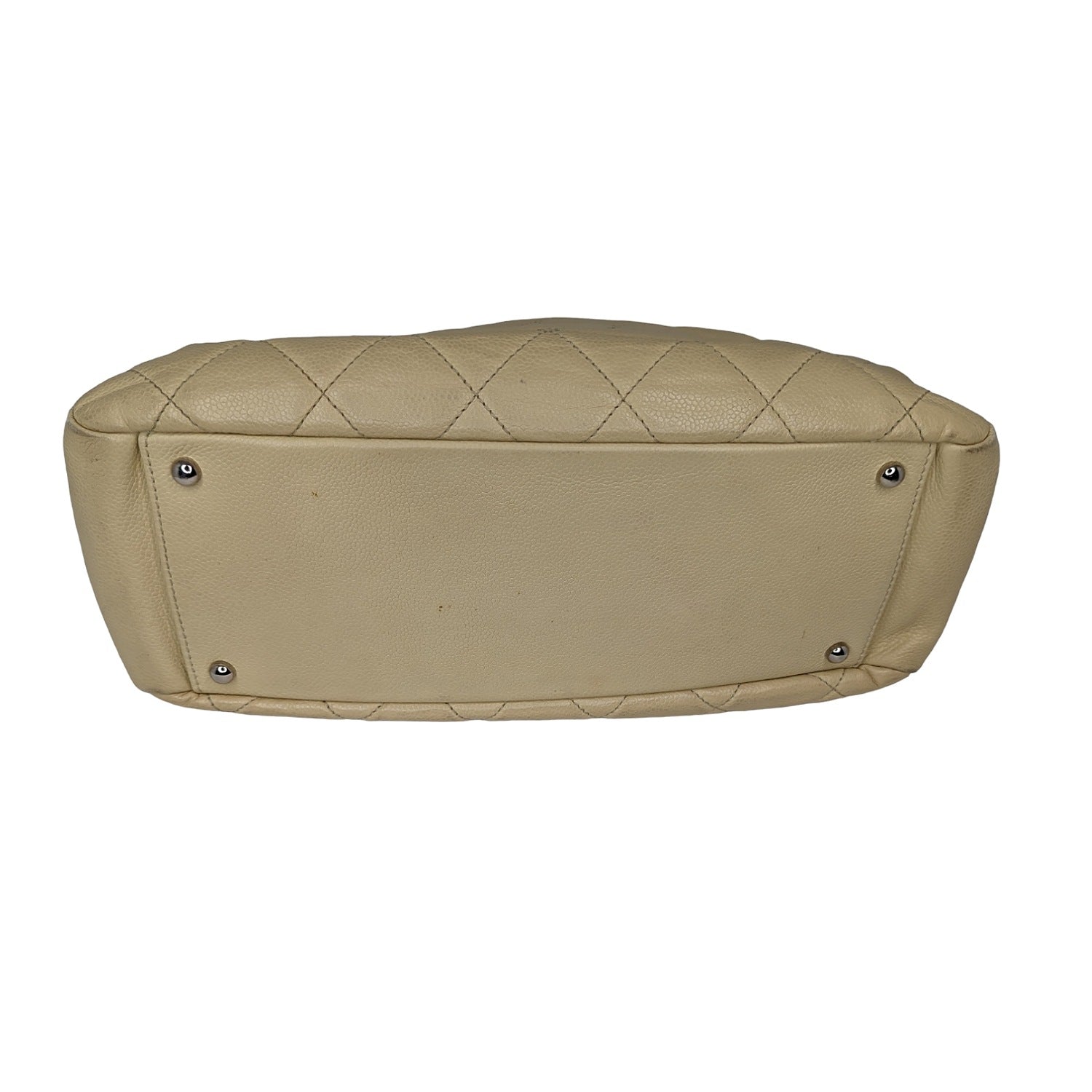 This Chanel Timeless Classic Caviar Quilted Tote is crafted from light beige quilted caviar leather. It features leather woven chain straps with leather shoulder pads, protective base studs, and silver-toned hardware. The interior is a camel-colored textile with one zippered pocket and 2 patch pockets. is 2750.