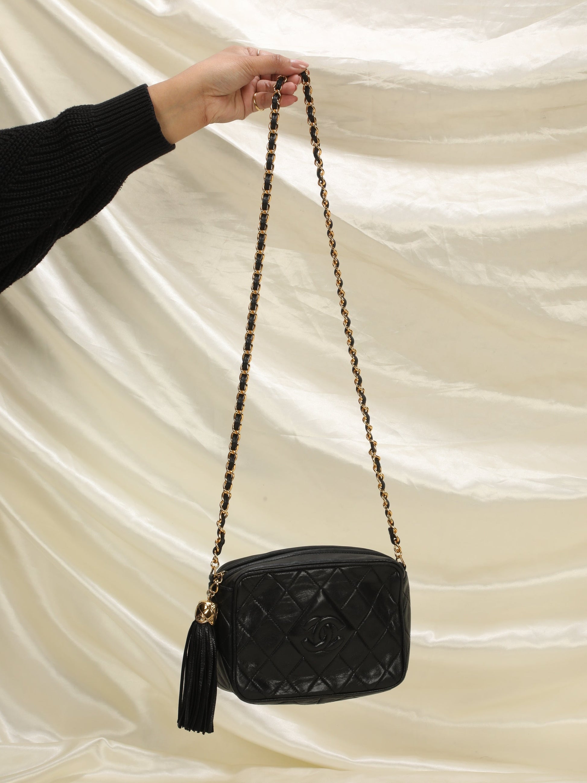 Bringing to the shop a classic Chanel lambskin mini camera bag! Vintage Chanel crafted in the 90s = 24K gold plated hardware, with an attached lambskin tassel. Can be as a shoulder bag, or as a crossbody. Can fit a phone, keys, and cardholder.
