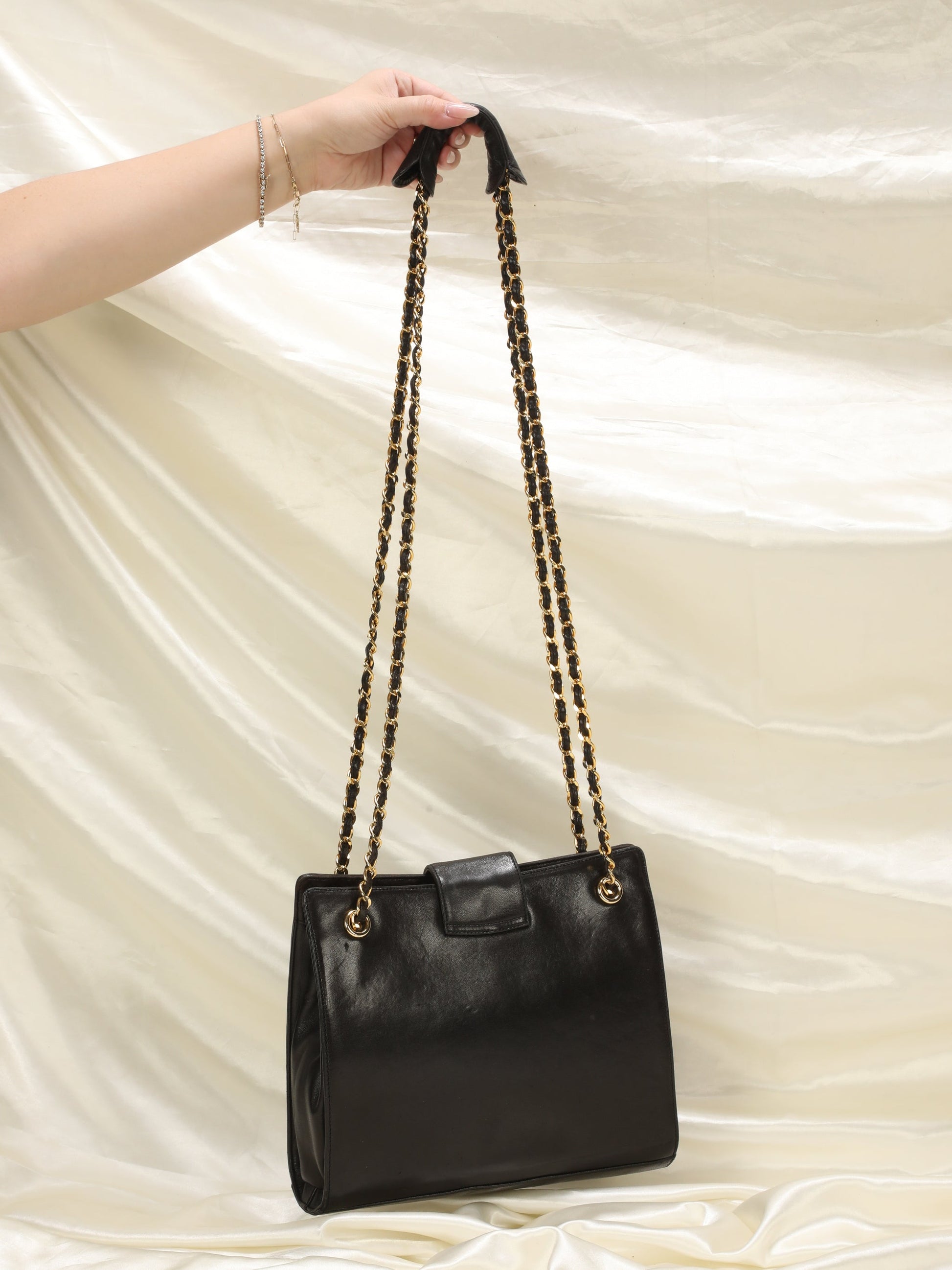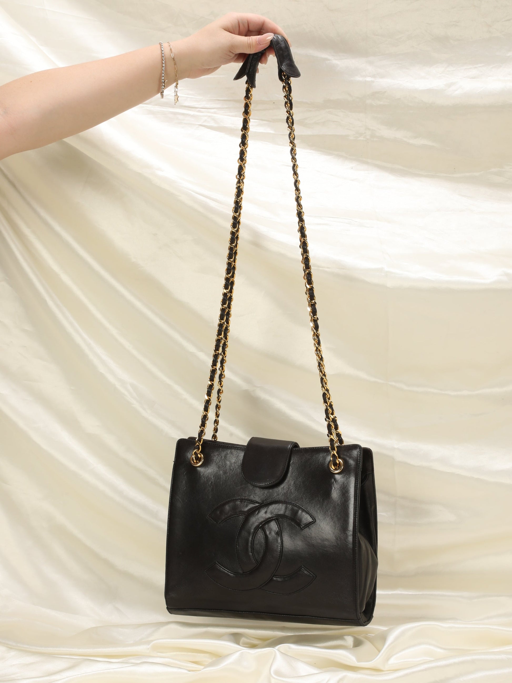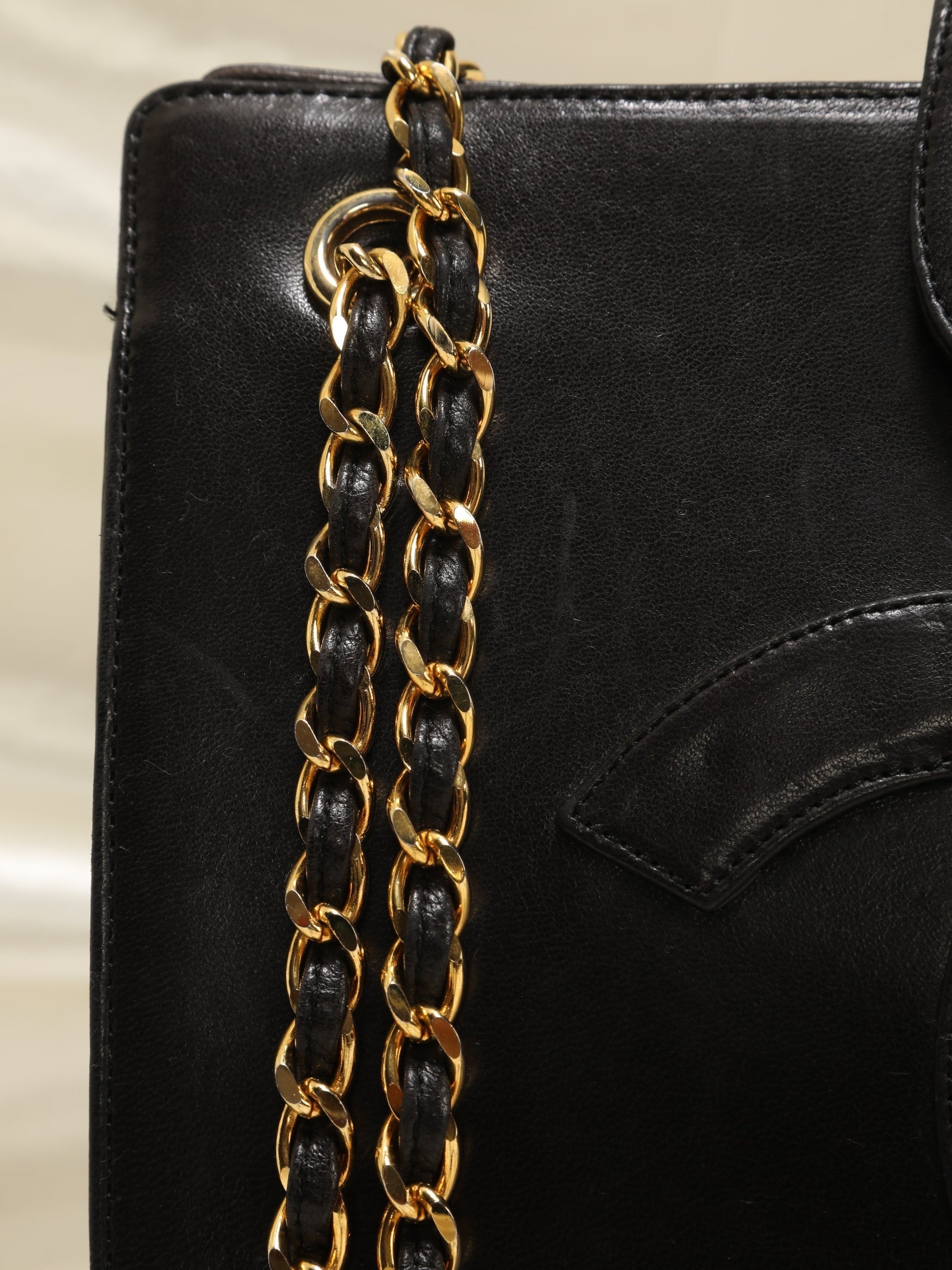 A vintage Chanel lambskin chain tote in beautiful condition!! With 24k gold? plated chunky chains. A classic piece to enjoy for years! Gives an effortless chic vibe when with a ?coat! Lambskin piece at top of chain adds additional comfort when . Soft buttery lambskin.?