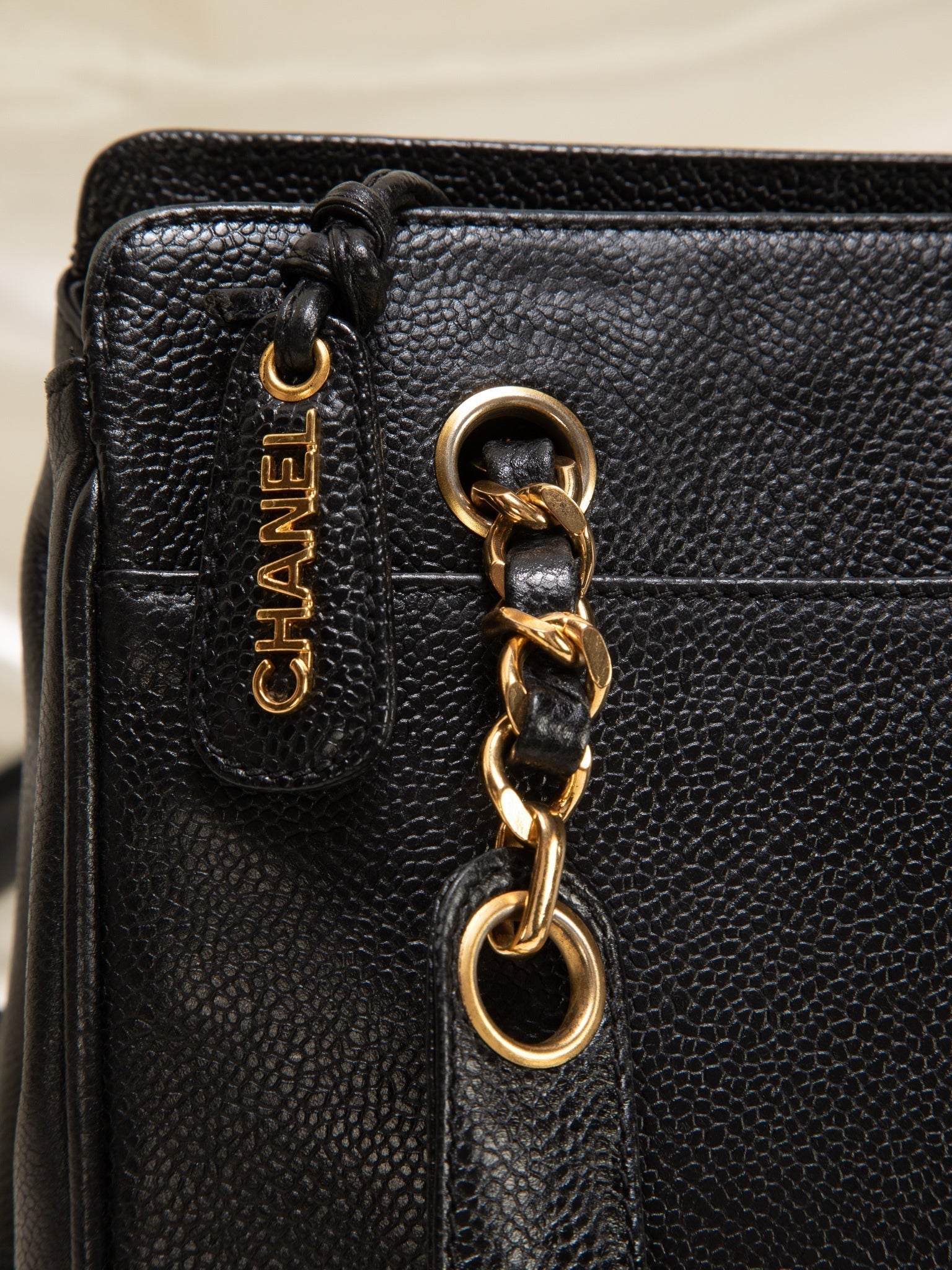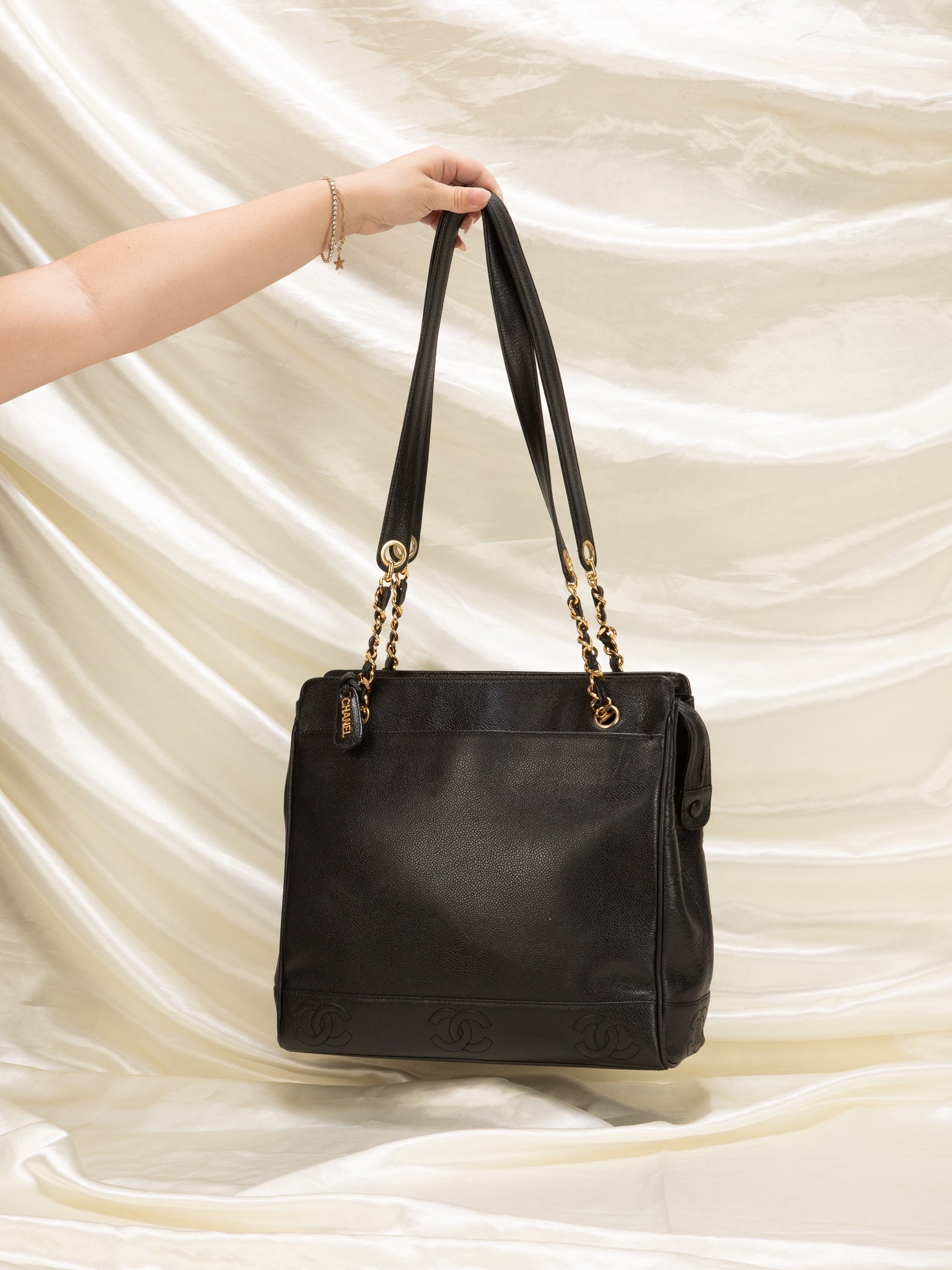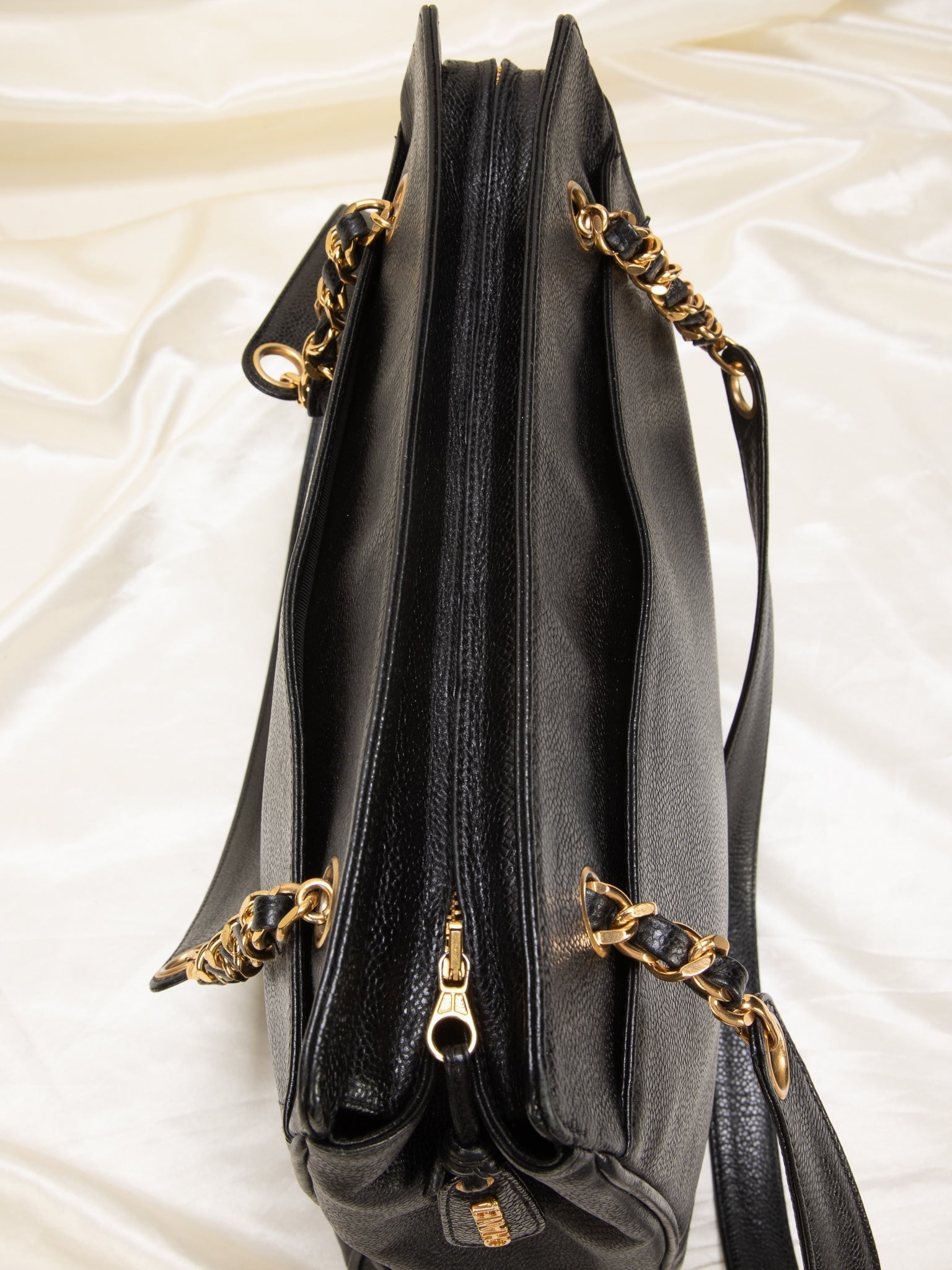 Up for grabs is a stunning Chanel lambskin tote?bag with beautiful gold chain hardware and 6 Chanel logos all along the bottom. 24kt gold plated hardware. Chanel?logo?charm as zipper pull. New size allows this piece to be a great outing bag. A classic piece to enjoy for years!?