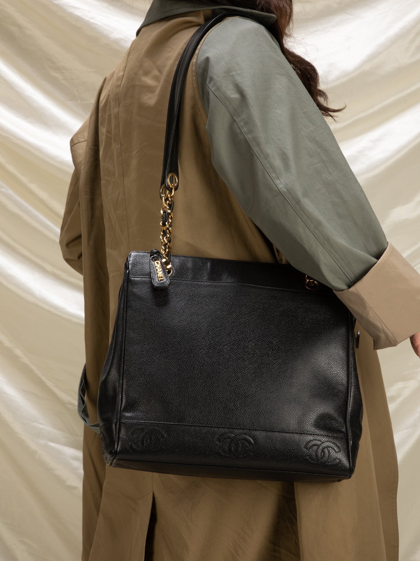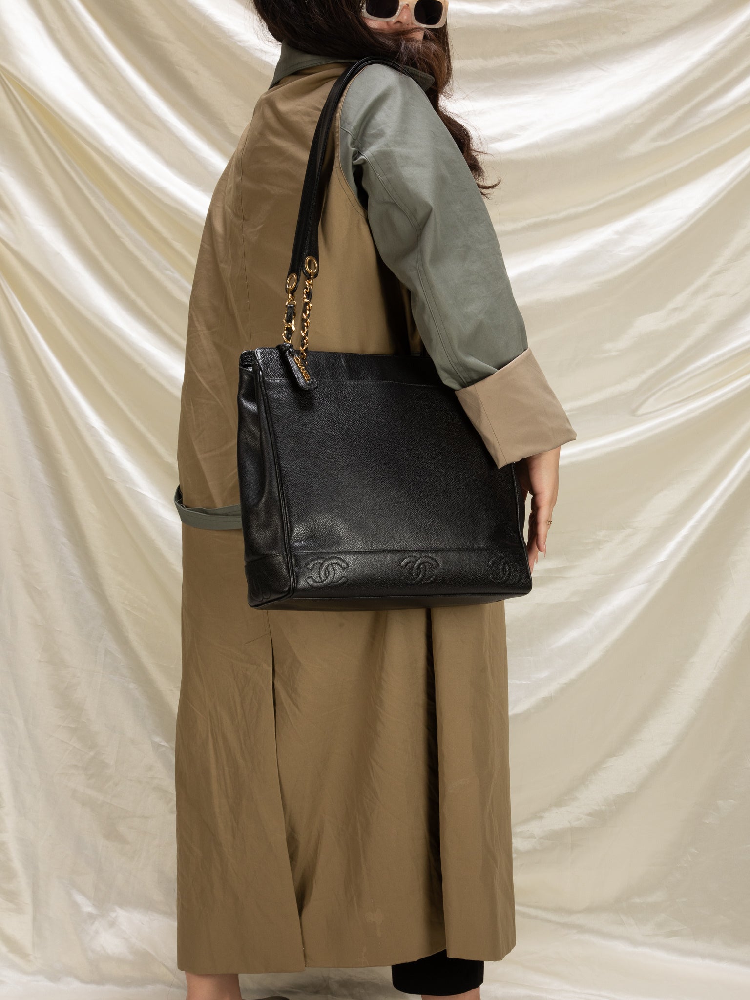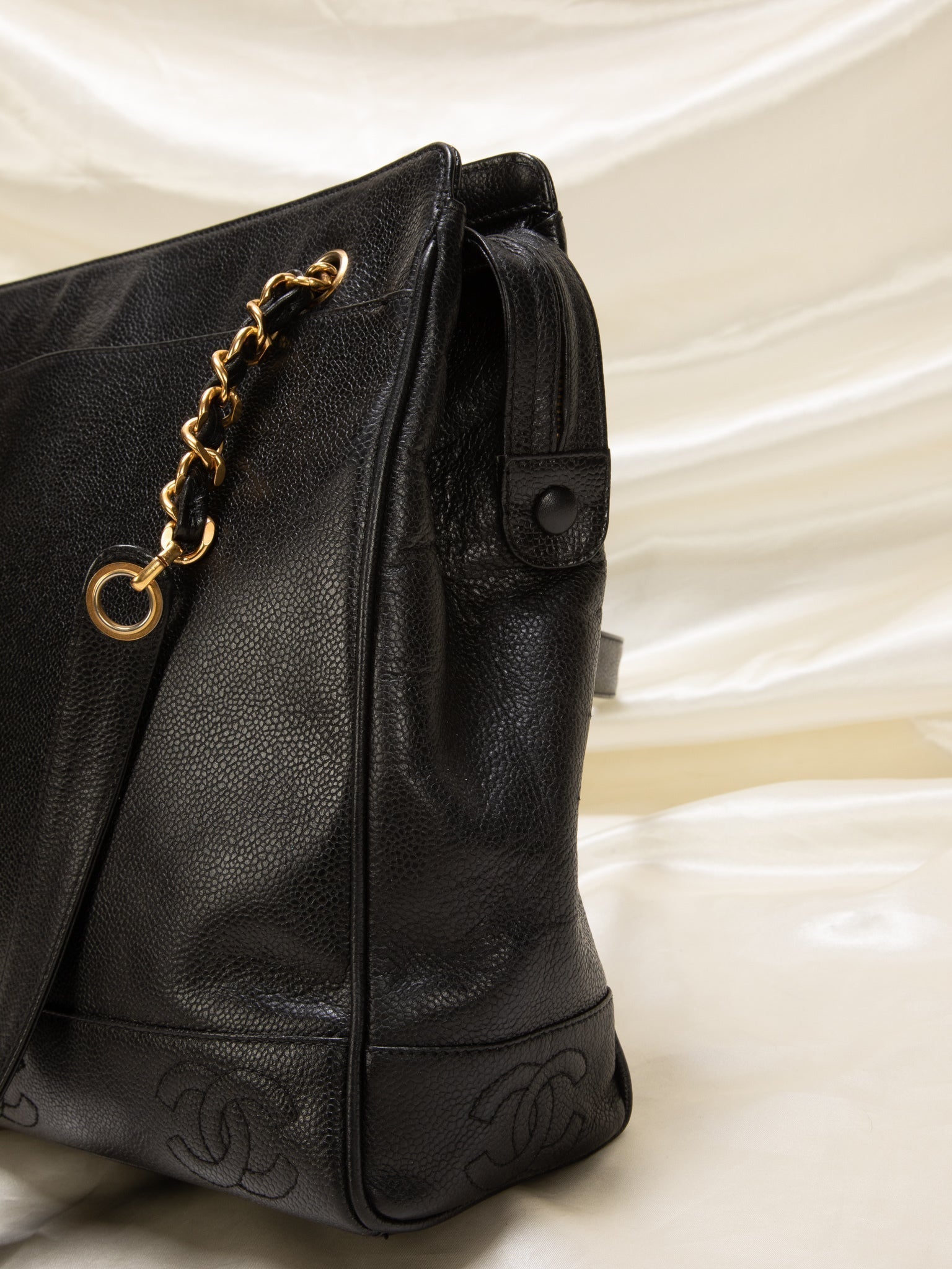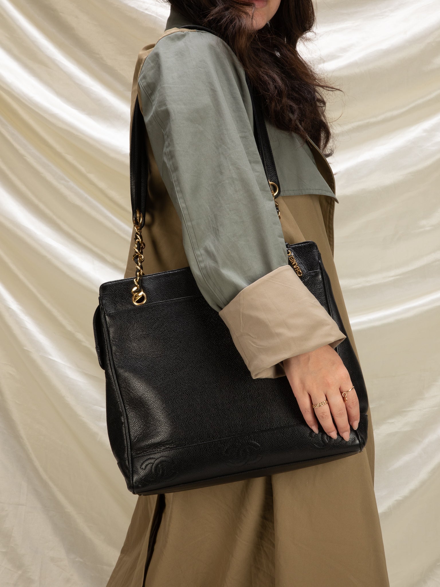 Up for grabs is a stunning Chanel lambskin tote?bag with beautiful gold chain hardware and 6 Chanel logos all along the bottom. 24kt gold plated hardware. Chanel?logo?charm as zipper pull. New size allows this piece to be a great outing bag. A classic piece to enjoy for years!?