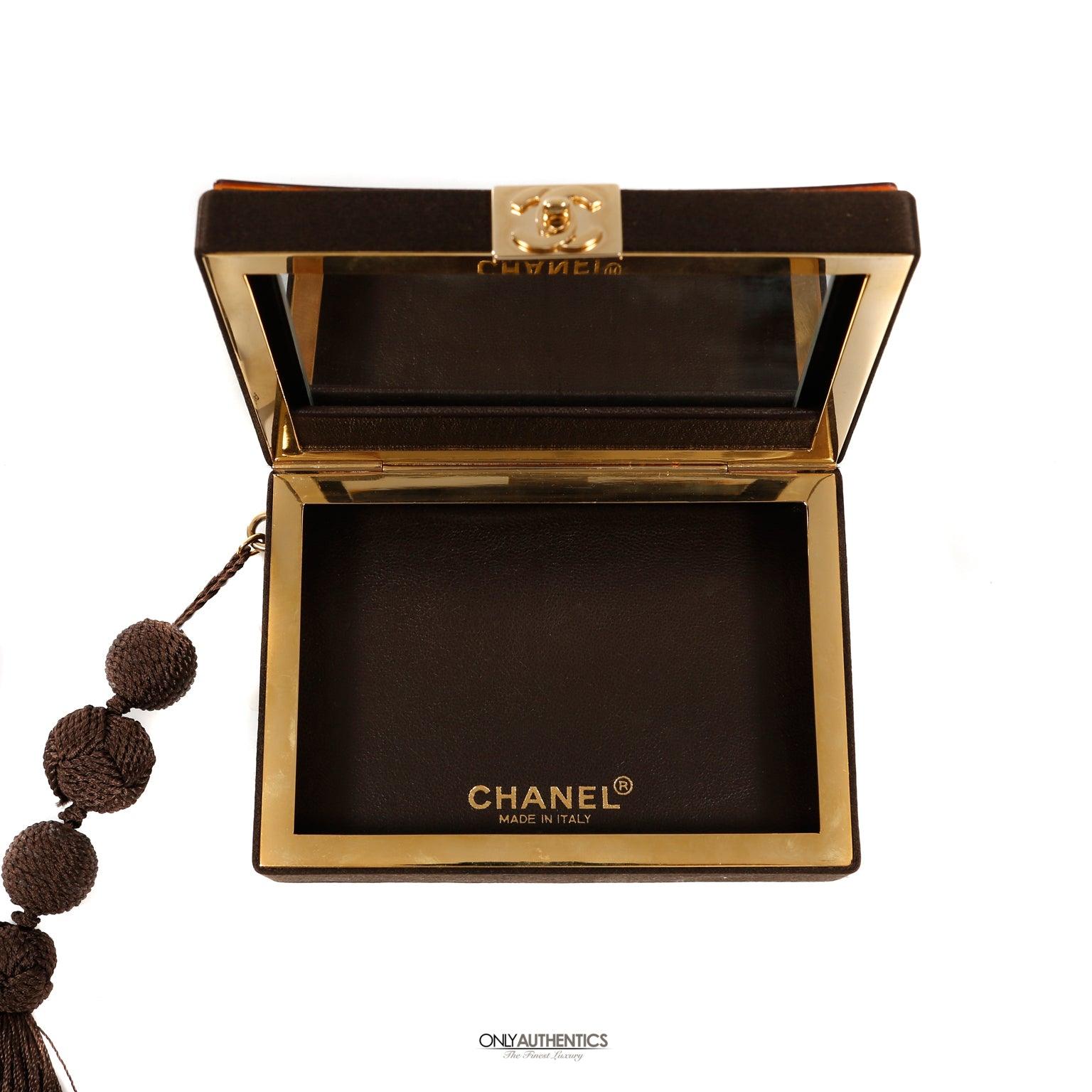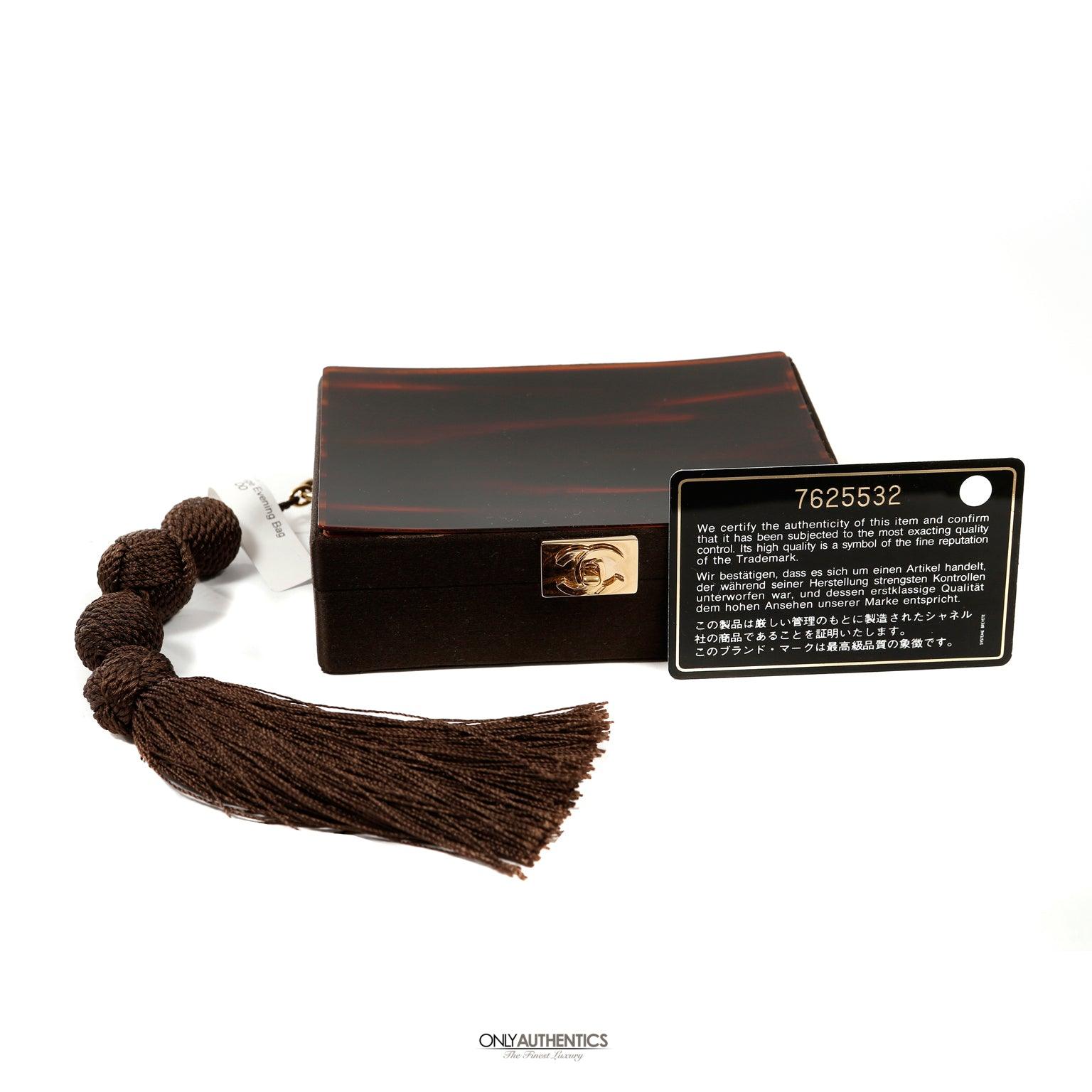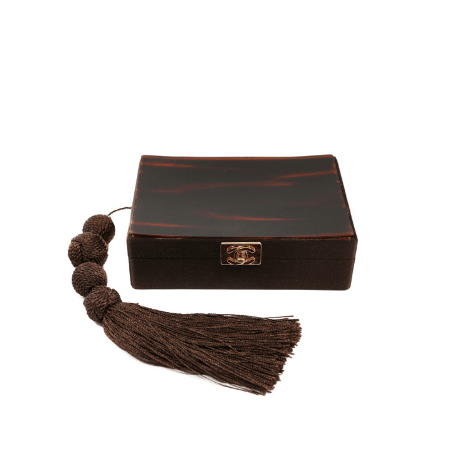 Dark tortoise printed resin box clutch with gold interlocking CC clasp. Hinged opening reveals a mirrored and leather lined interior. Oversized brown knotted tassel provides a handle option. Made in Italy. Dust bag included.