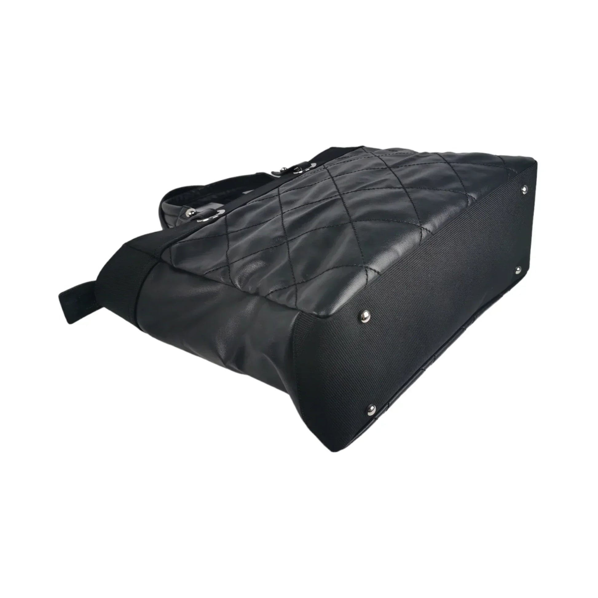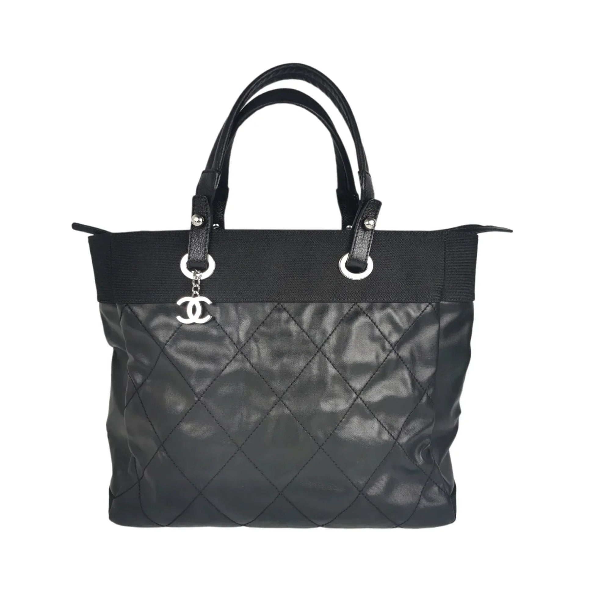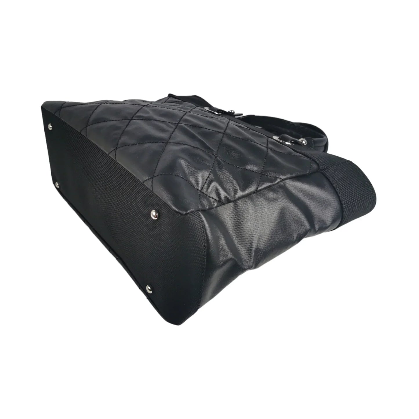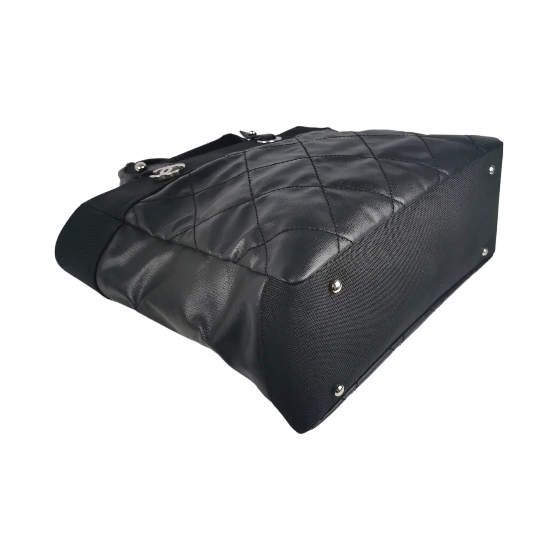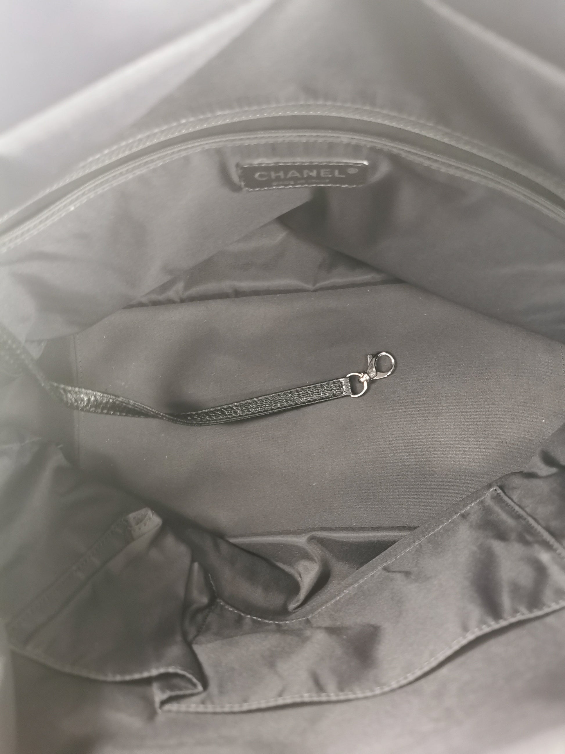 This Chanel Tote Bag was made from black coated canvas. Trimmings of black non-coated canvas and black calfskin create an exciting mix of materials. The silver details blend seamlessly into the elegantly airy overall look. A shiny accent is also set by the CC Monogram Tag on the front. The Bag is best worn in the hand or arm. For all order lovers offers this Bag in the interior zipper and plug-in compartments.