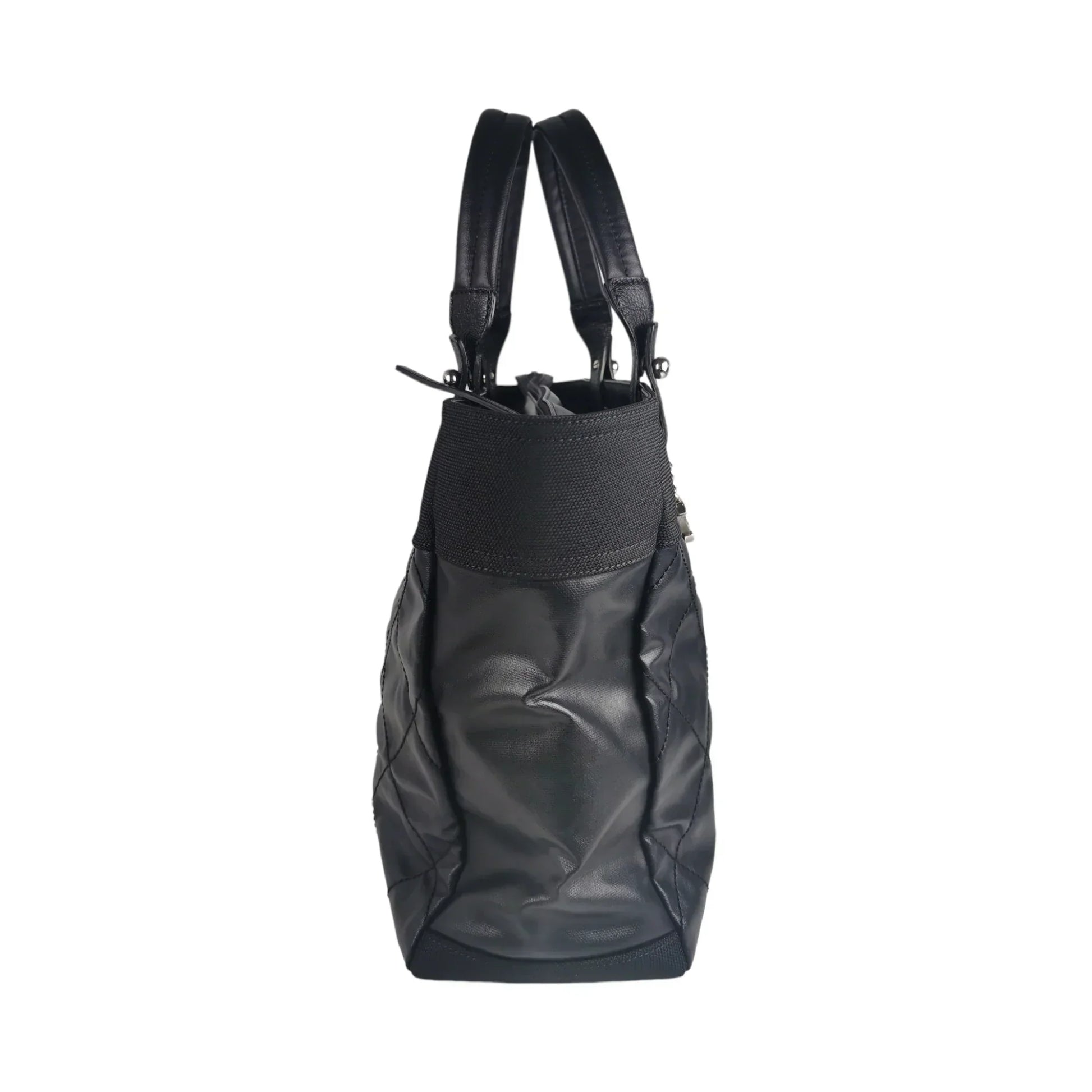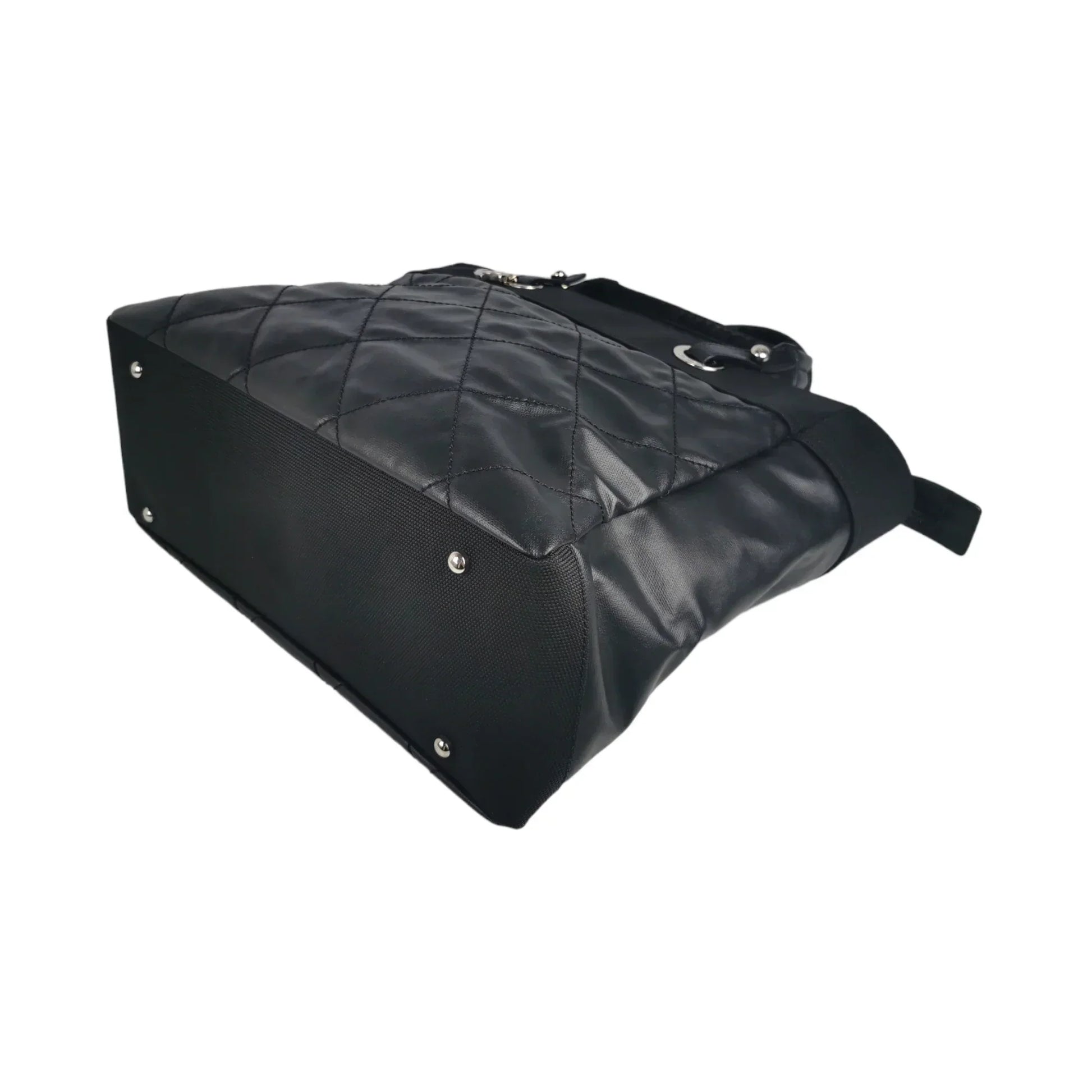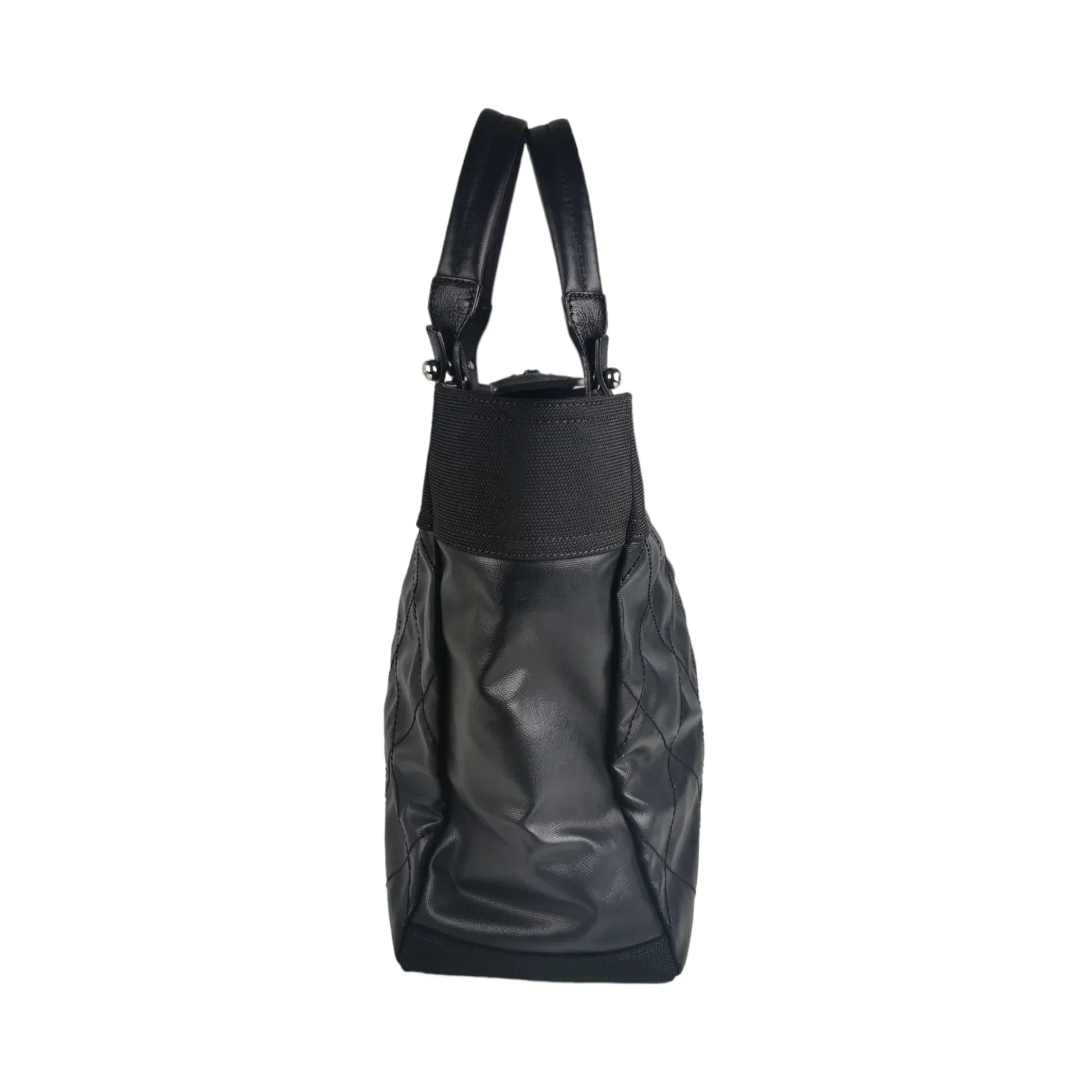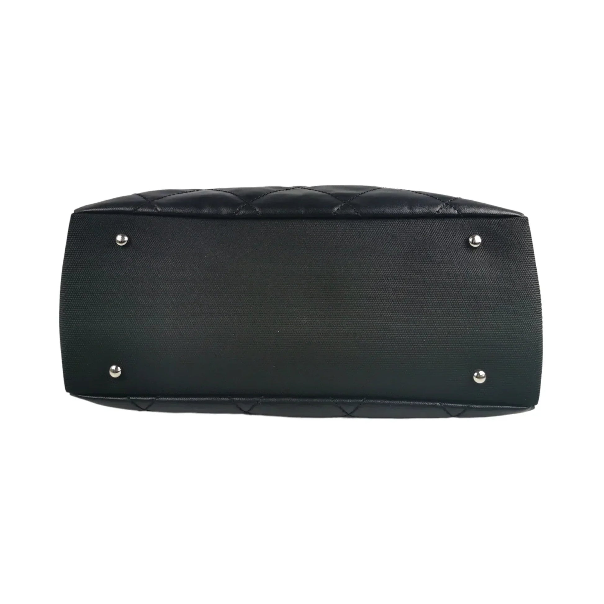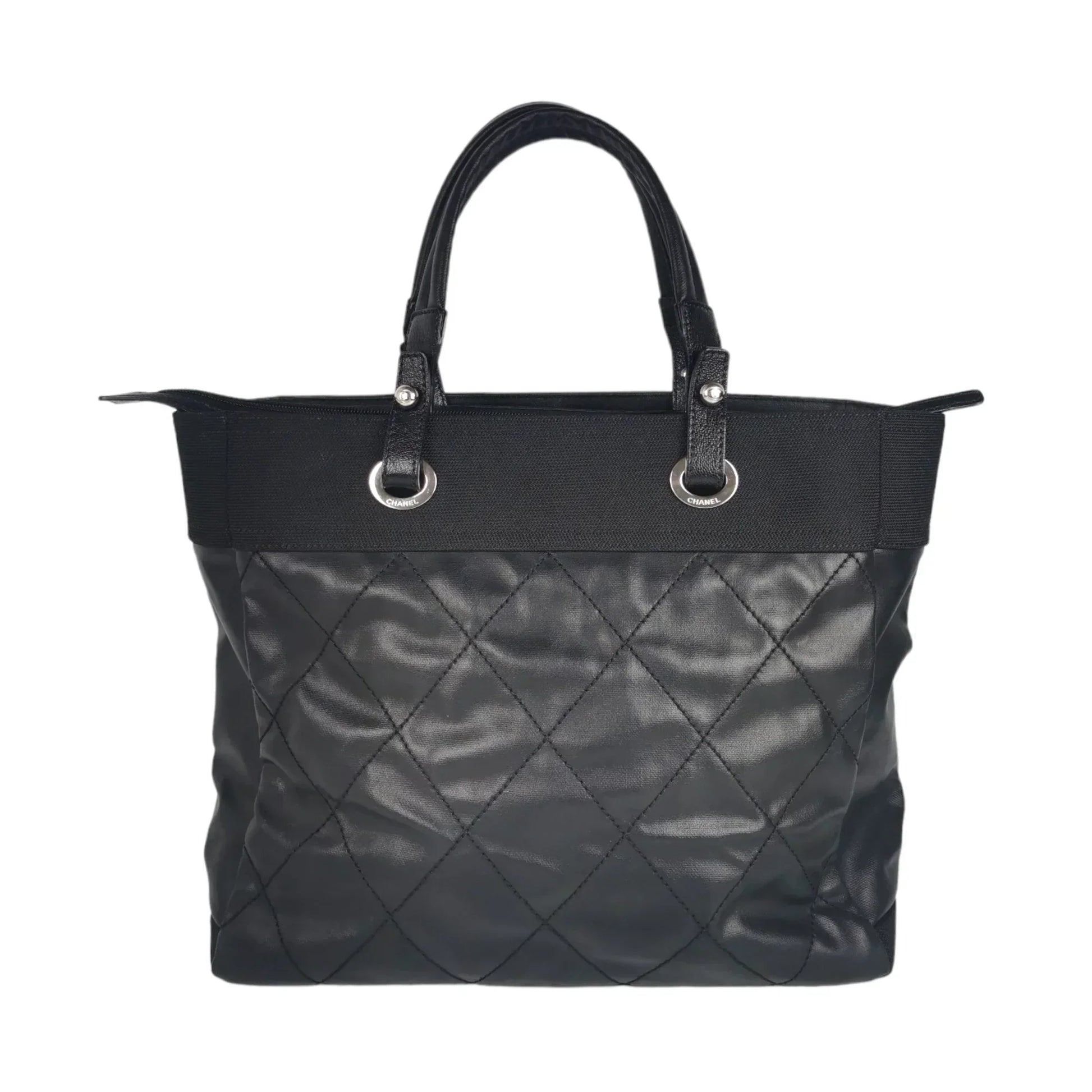 This Chanel Tote Bag was made from black coated canvas. Trimmings of black non-coated canvas and black calfskin create an exciting mix of materials. The silver details blend seamlessly into the elegantly airy overall look. A shiny accent is also set by the CC Monogram Tag on the front. The Bag is best worn in the hand or arm. For all order lovers offers this Bag in the interior zipper and plug-in compartments.