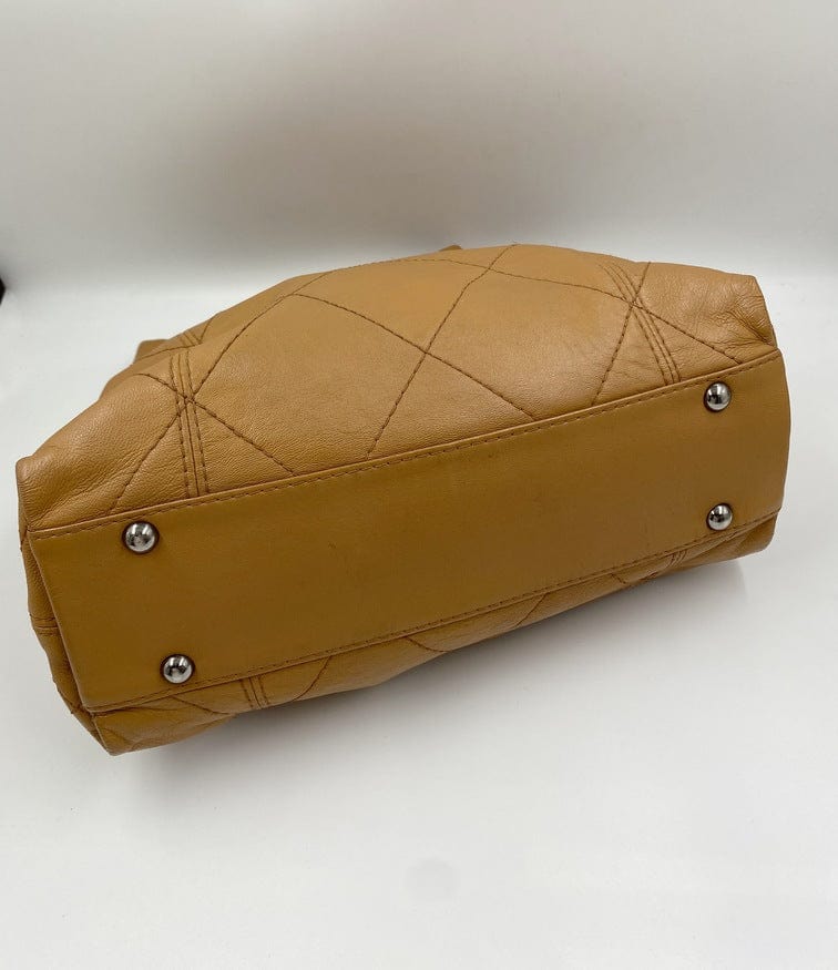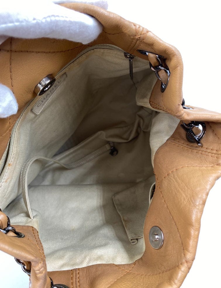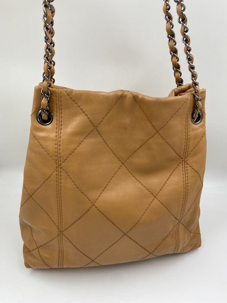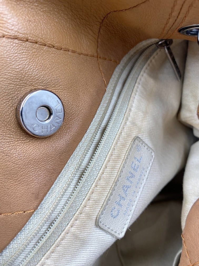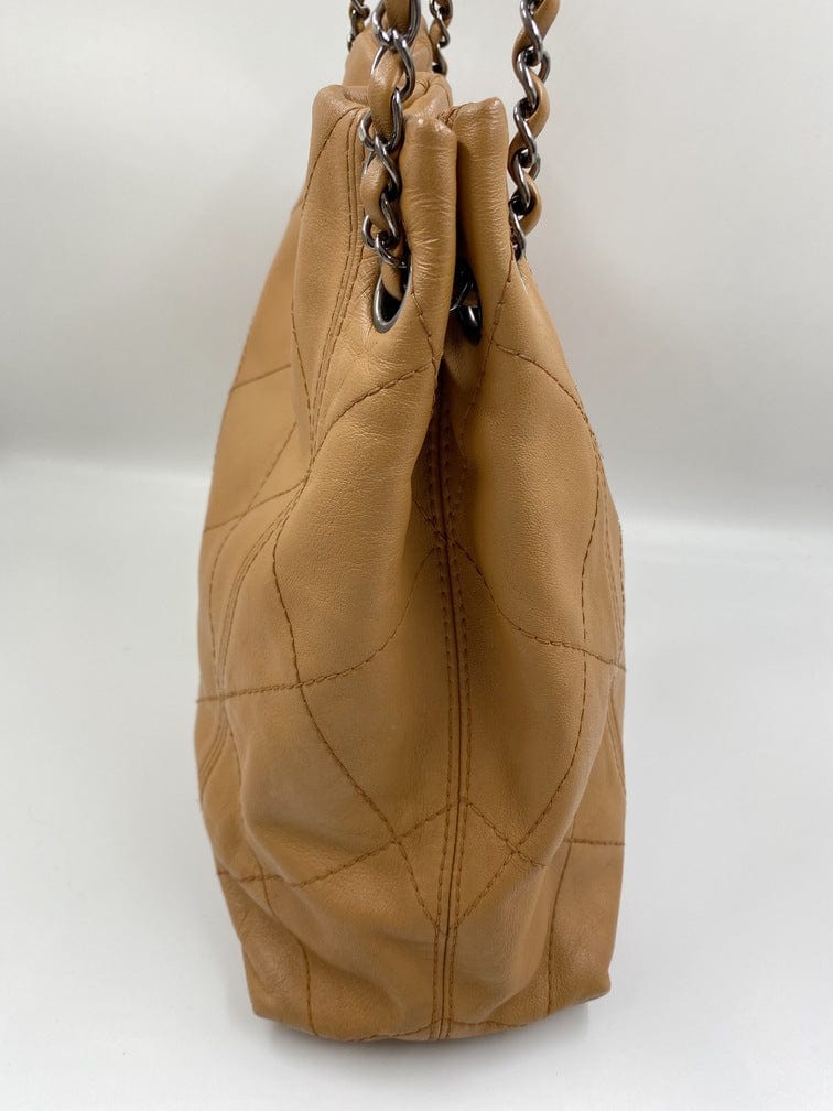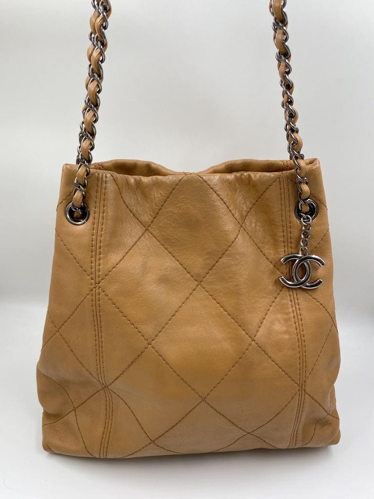 A beautiful light tan / beige Chanel leather tote bag with a double chain handle and CC charm.