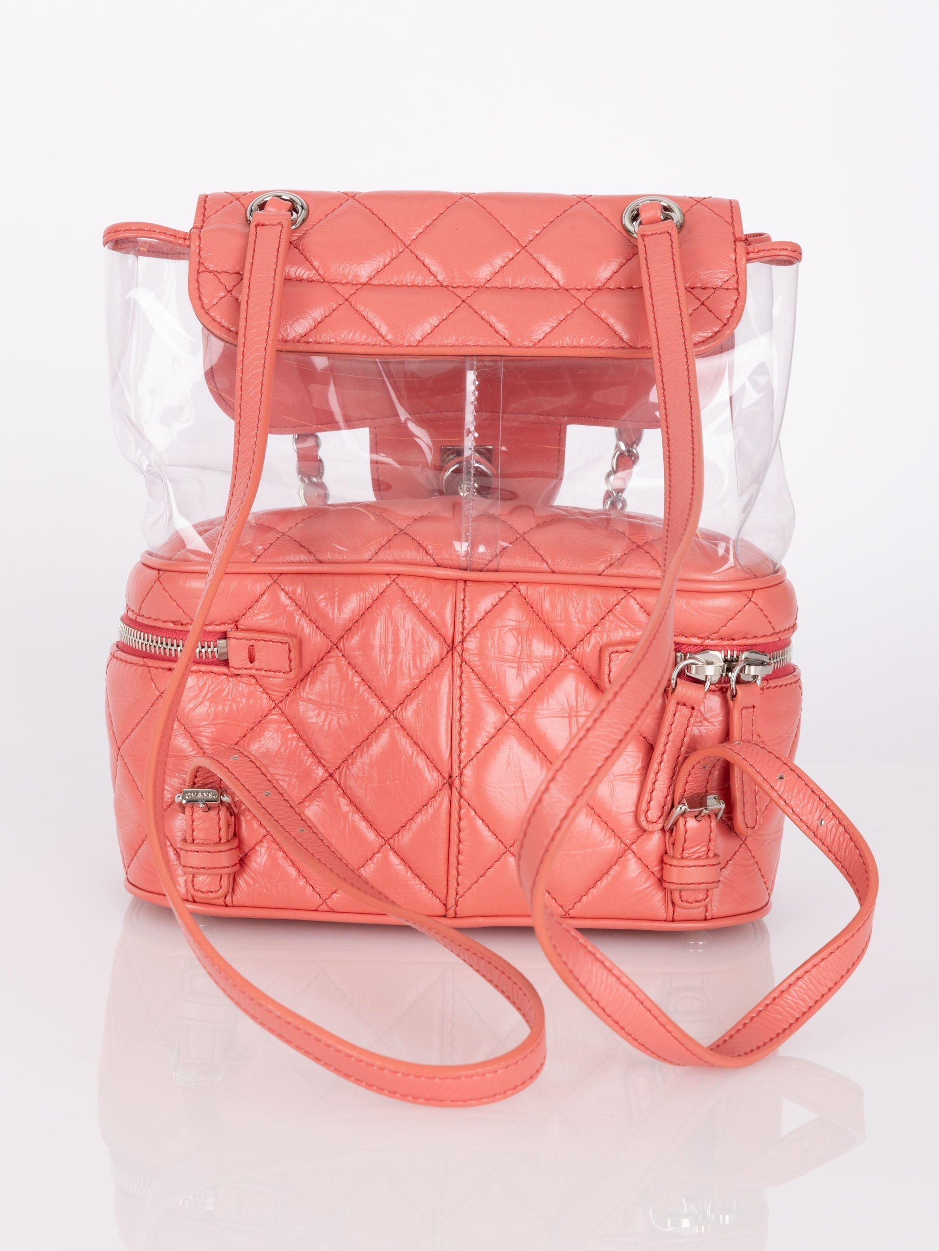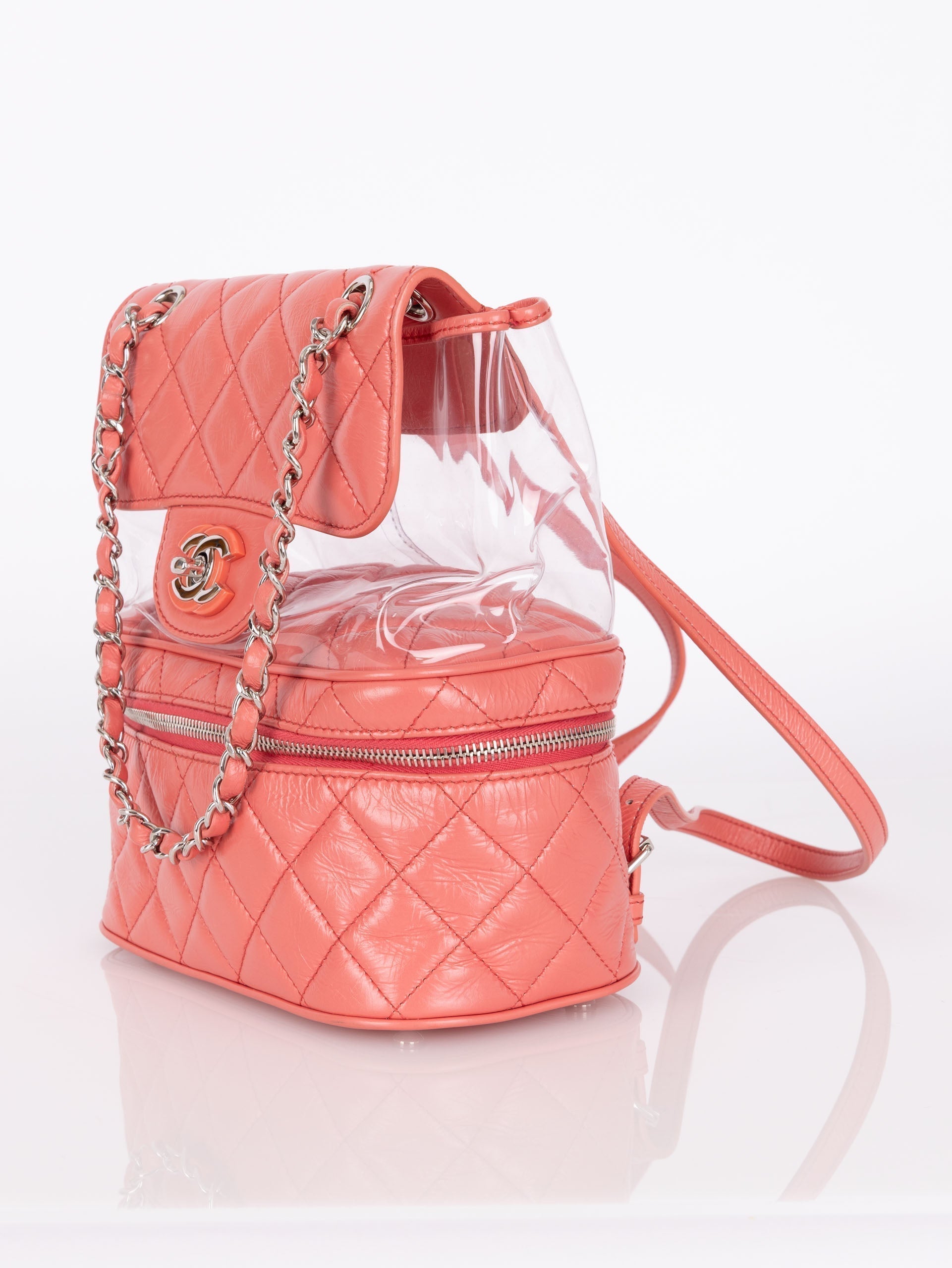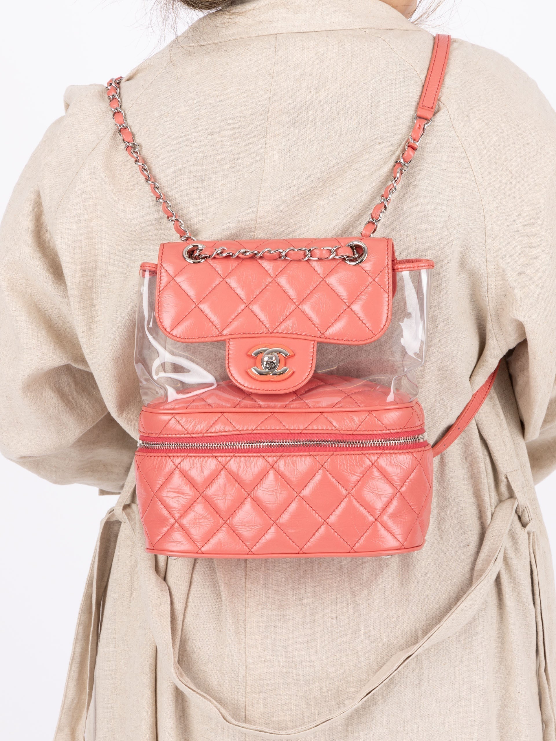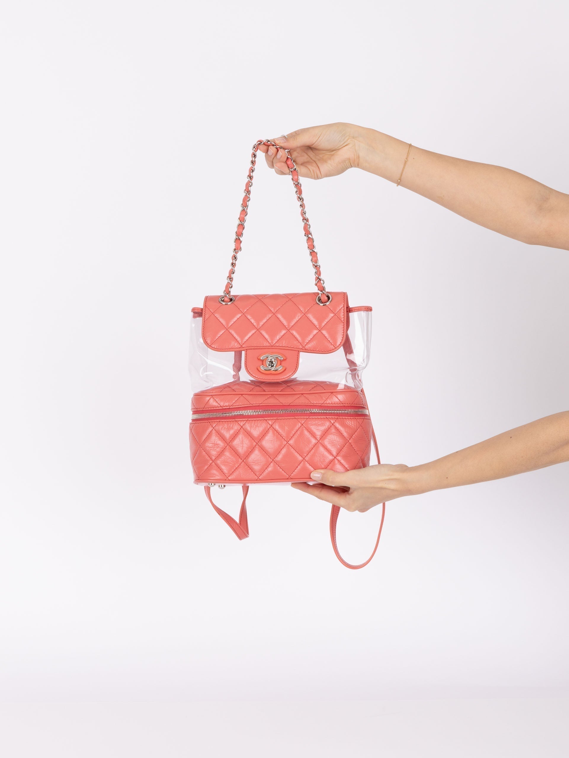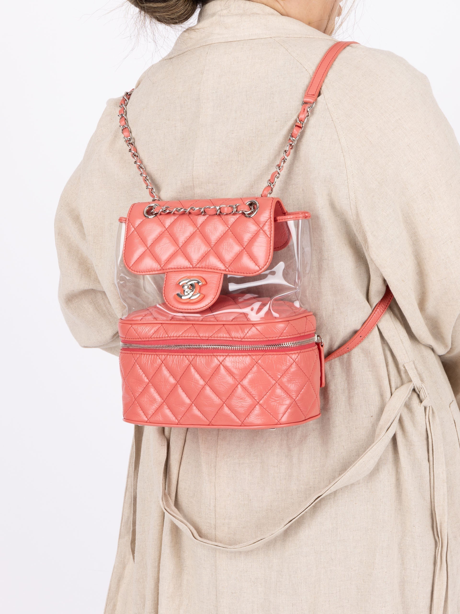 Backpacks are so perfect for these upcoming seasons! Whether you're traveling, or going out on an everyday errand or theme park, bring this cutie along with it's unique PVC transparent compartment, crumpled pink calfskin, and silver hardware. Pair with a colorful outfit to bring the best vibes!