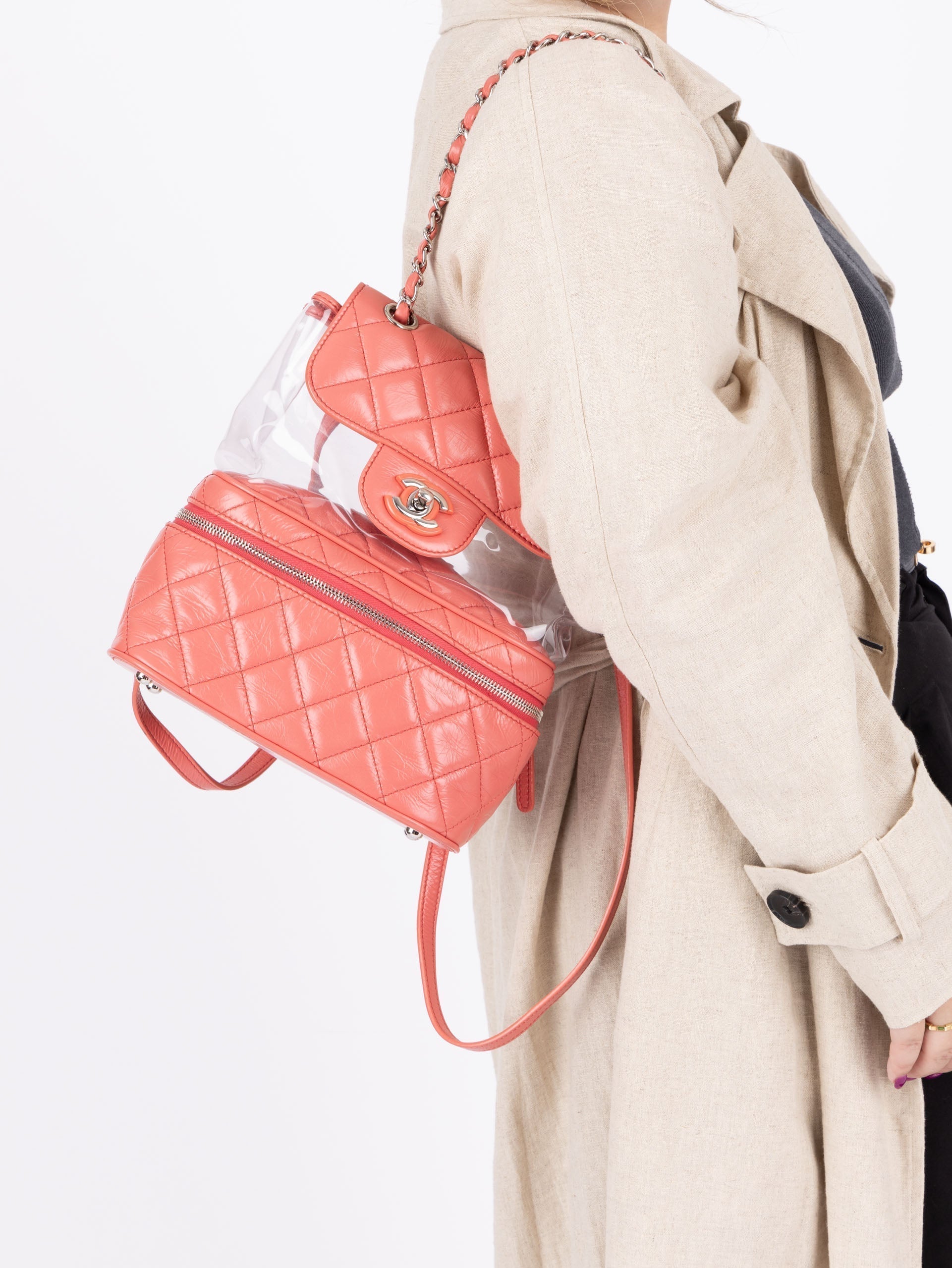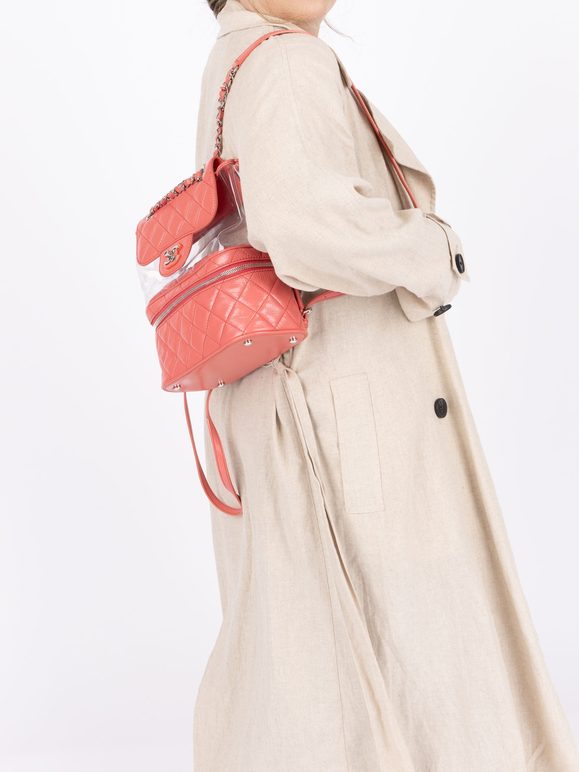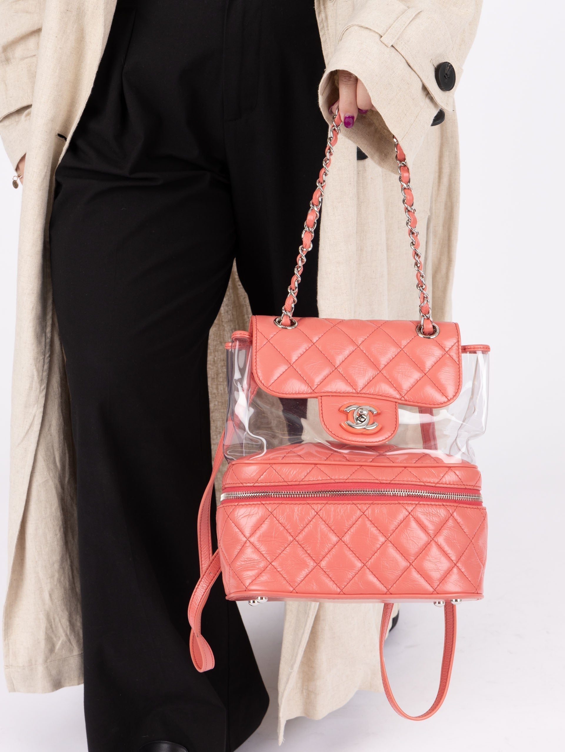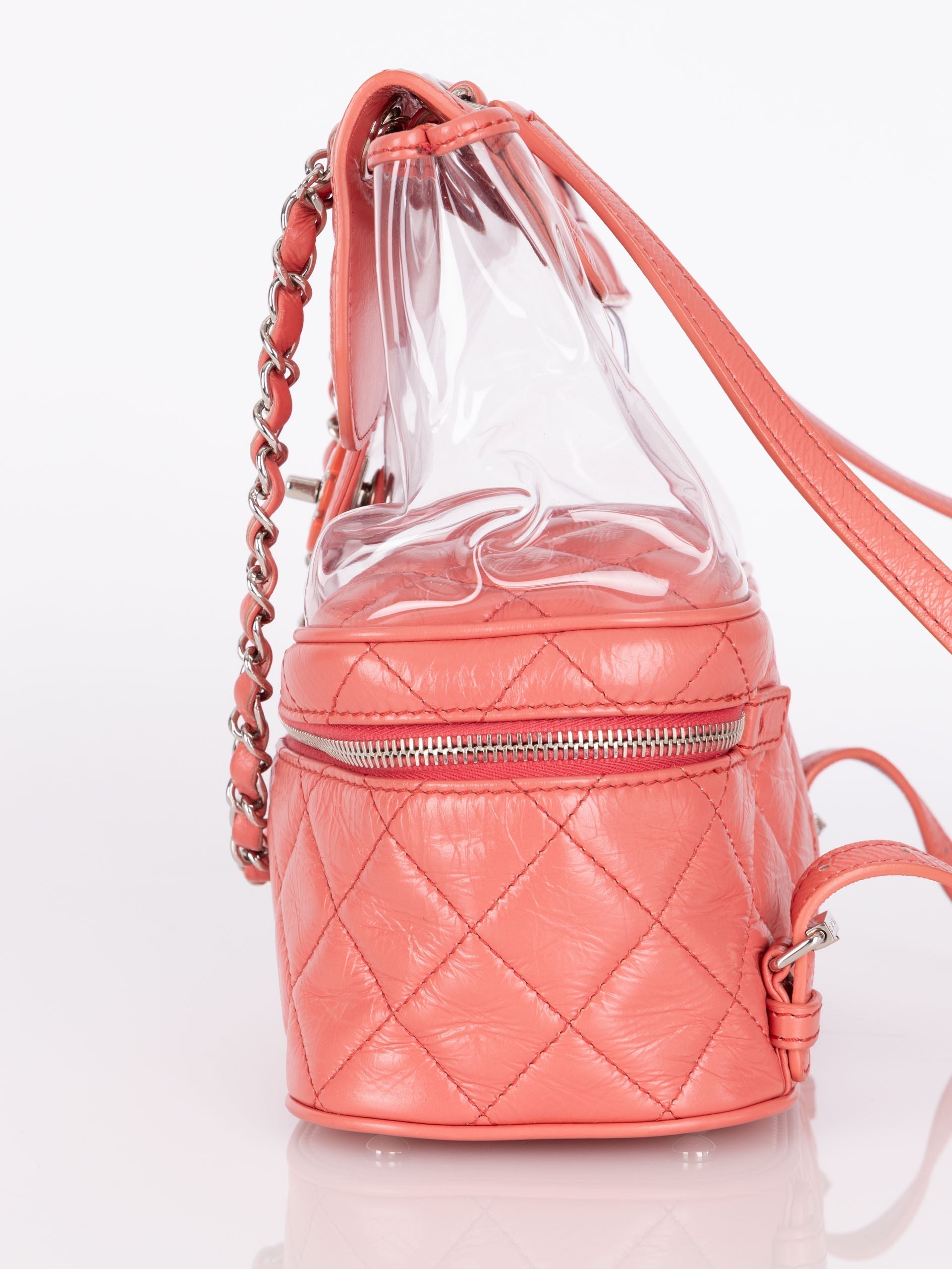 Backpacks are so perfect for these upcoming seasons! Whether you're traveling, or going out on an everyday errand or theme park, bring this cutie along with it's unique PVC transparent compartment, crumpled pink calfskin, and silver hardware. Pair with a colorful outfit to bring the best vibes!