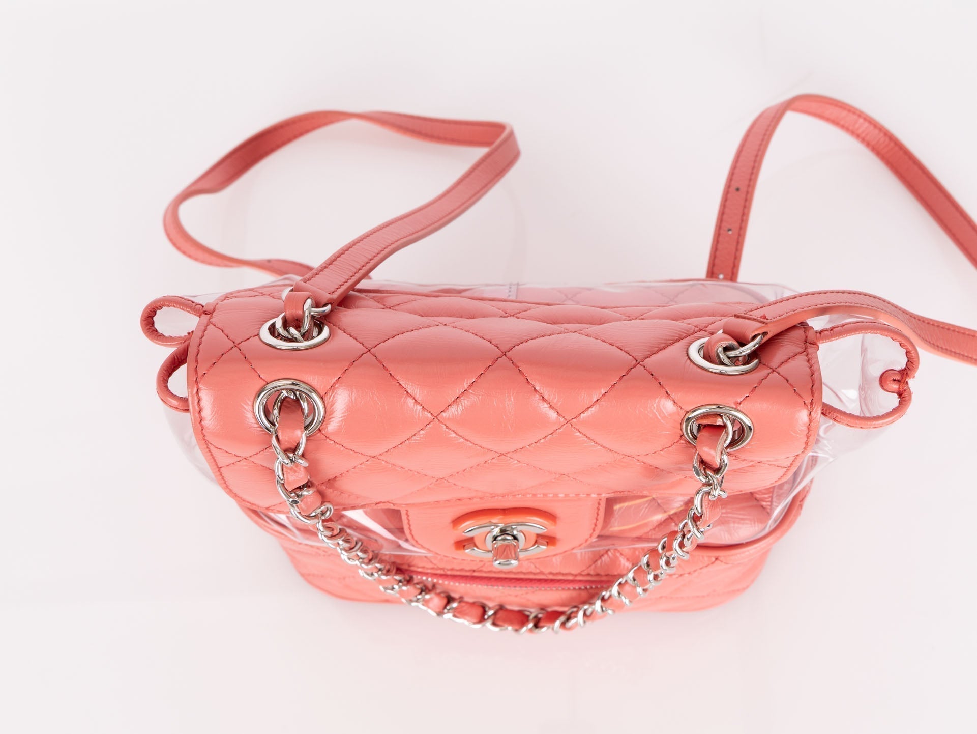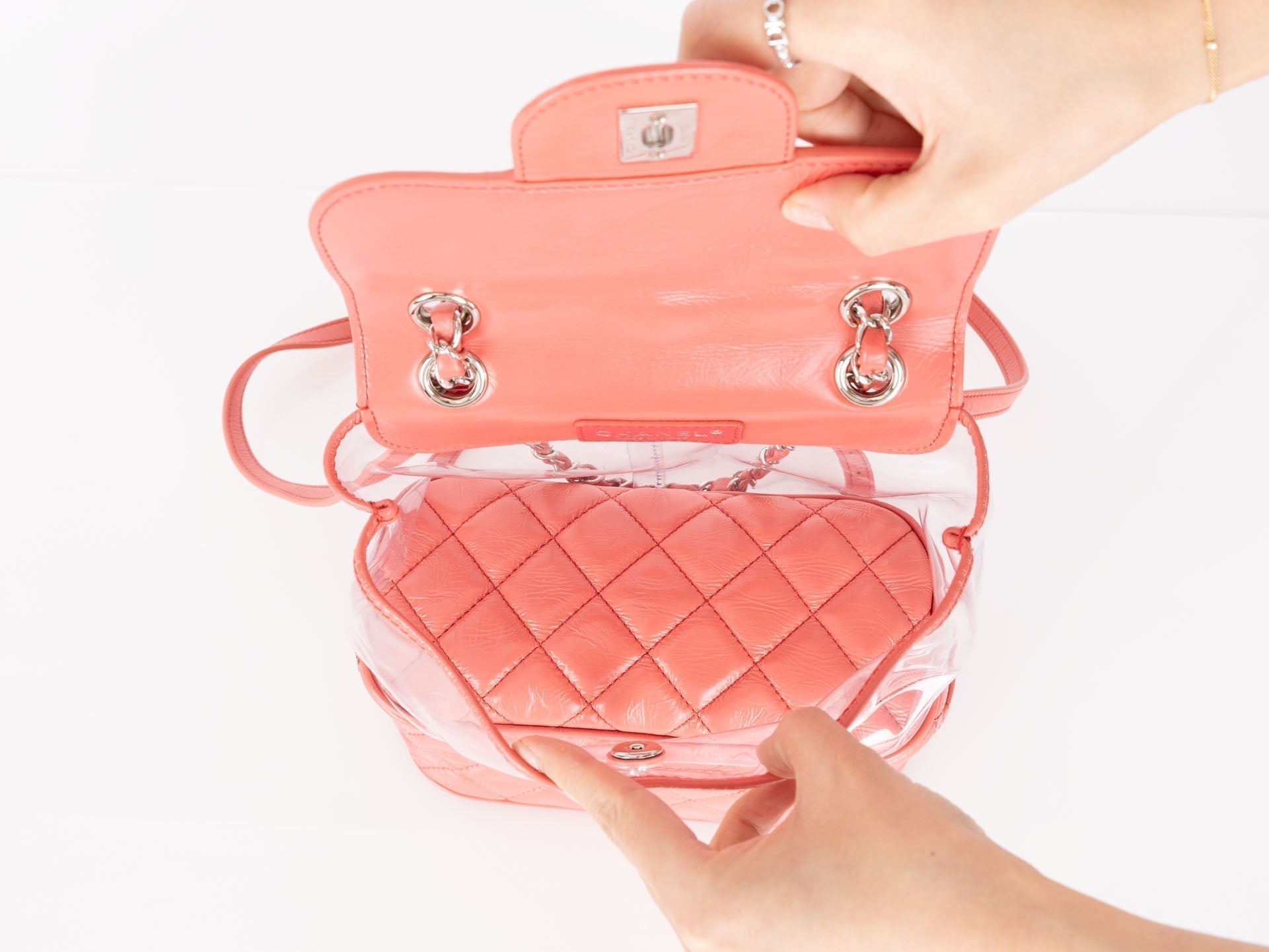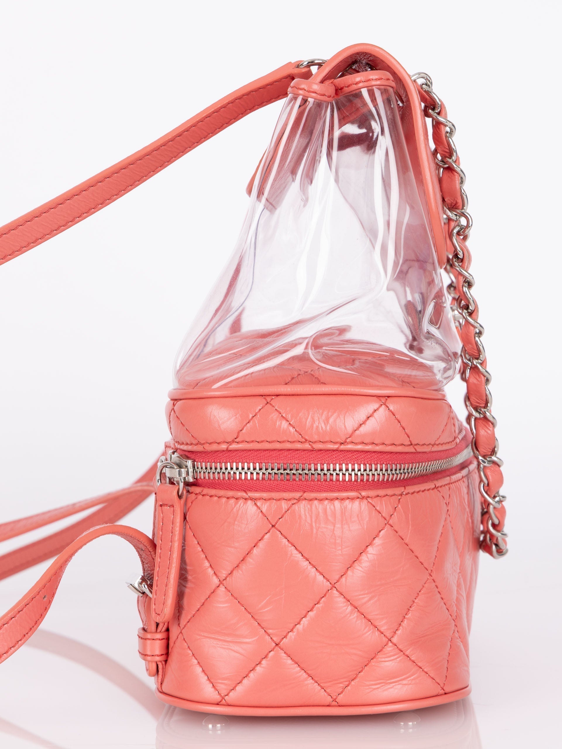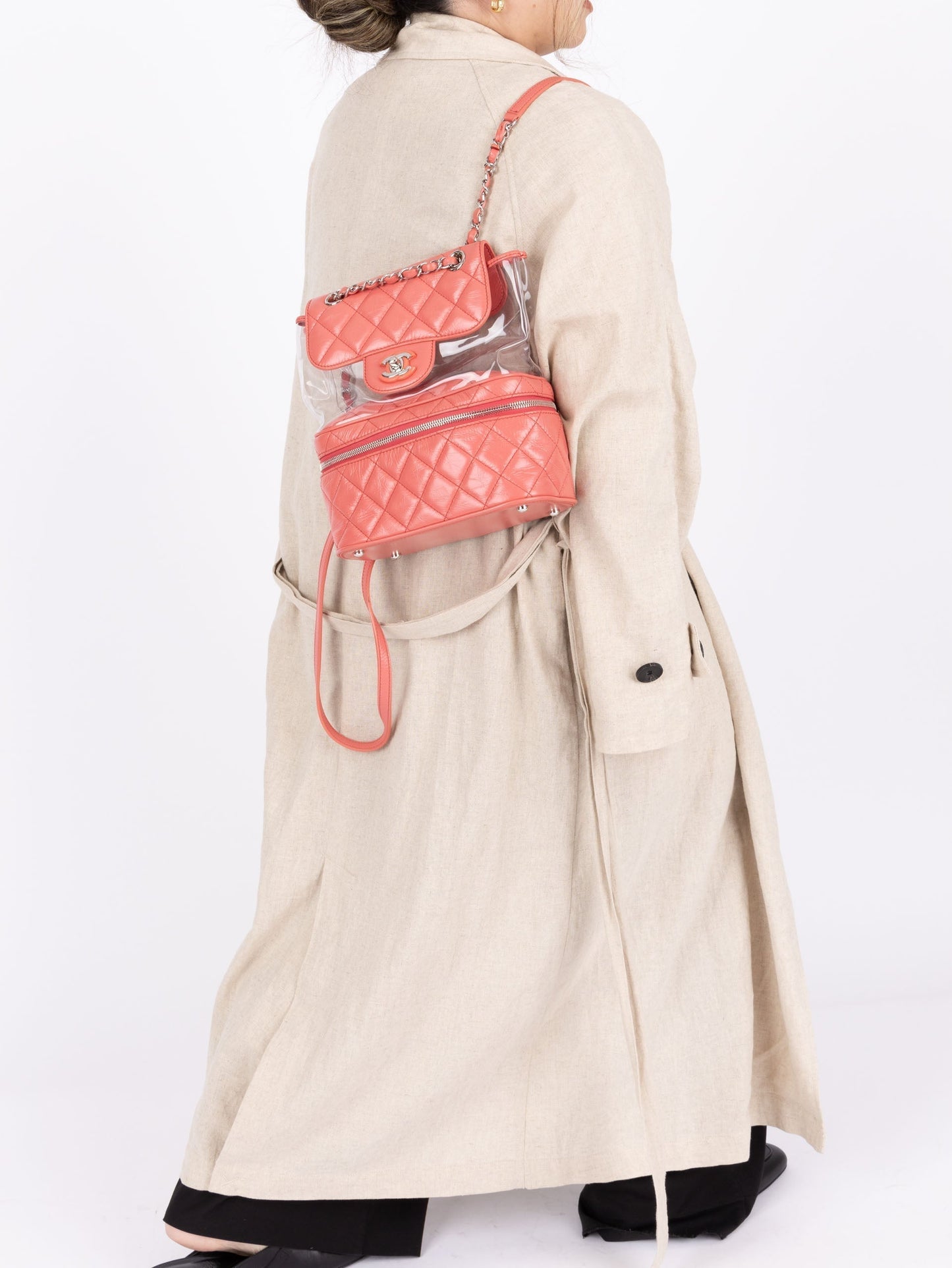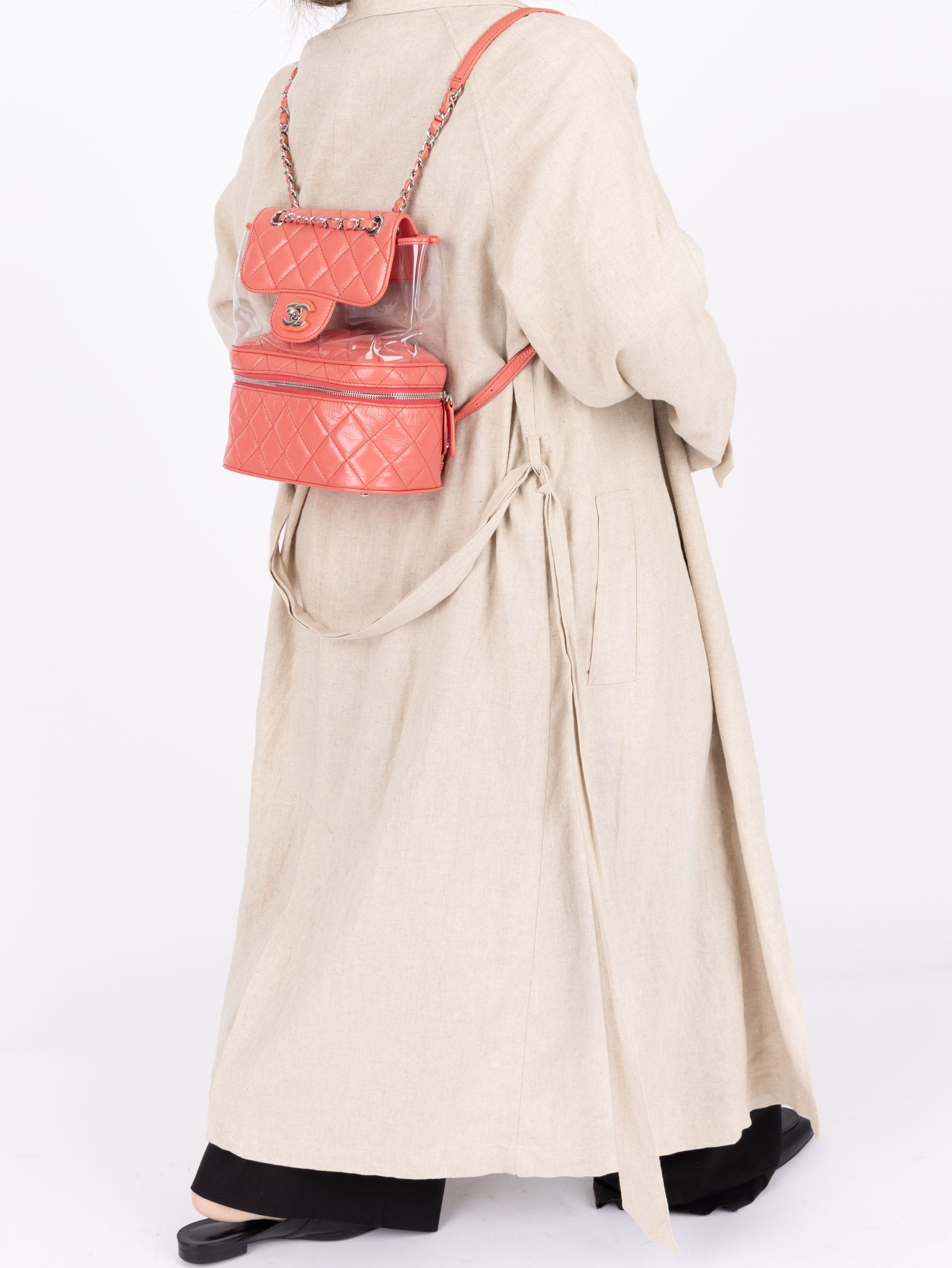 Backpacks are so perfect for these upcoming seasons! Whether you're traveling, or going out on an everyday errand or theme park, bring this cutie along with it's unique PVC transparent compartment, crumpled pink calfskin, and silver hardware. Pair with a colorful outfit to bring the best vibes!