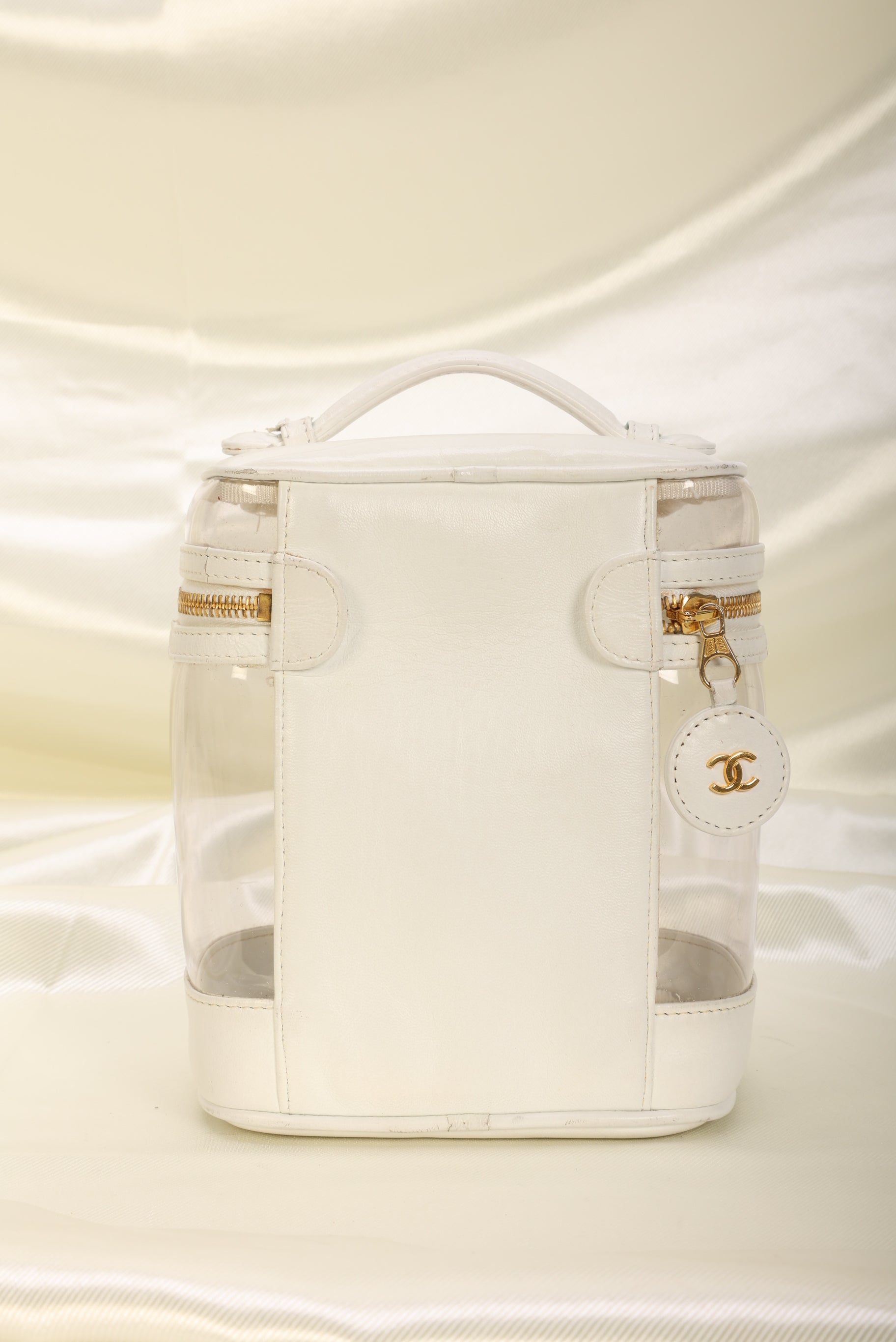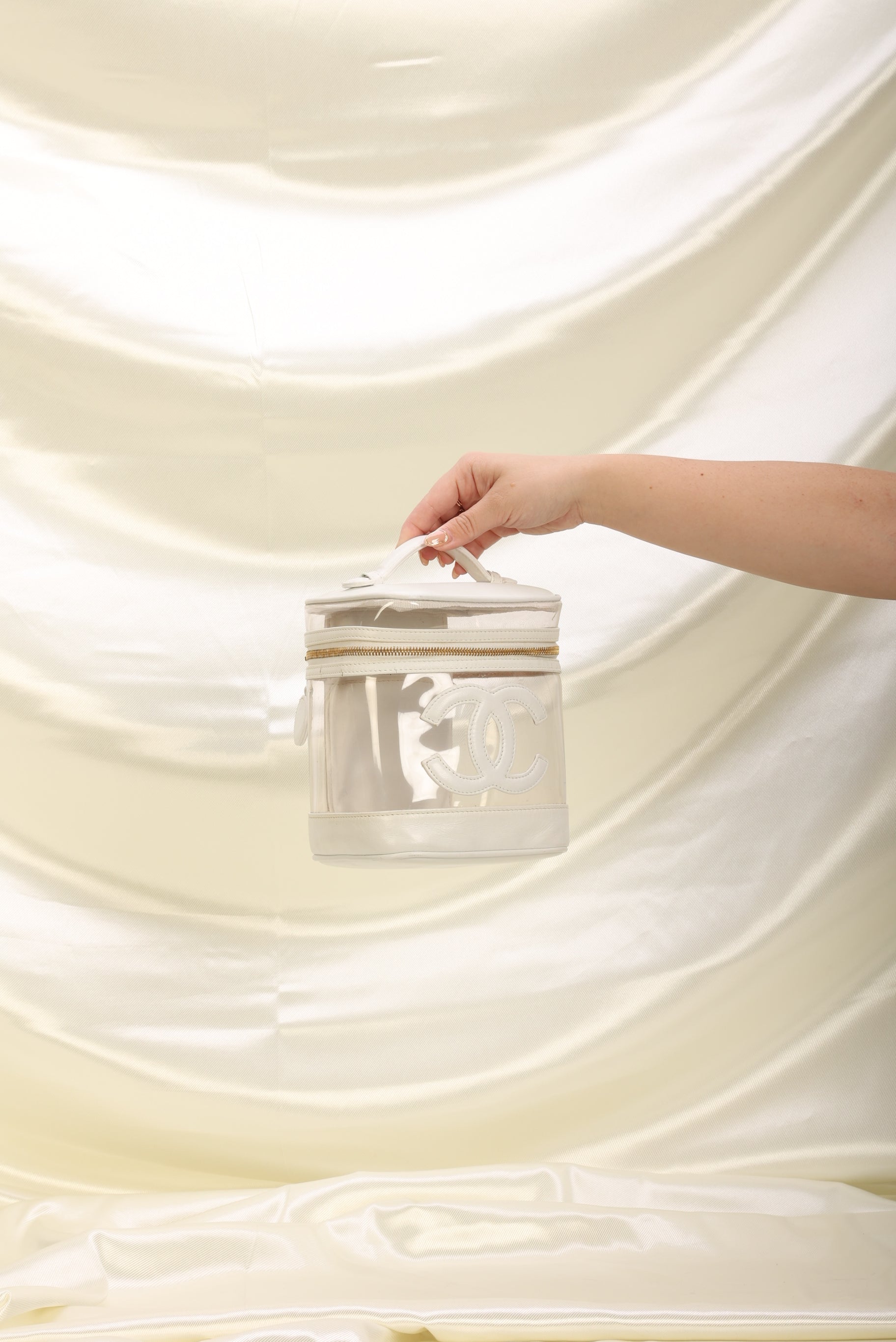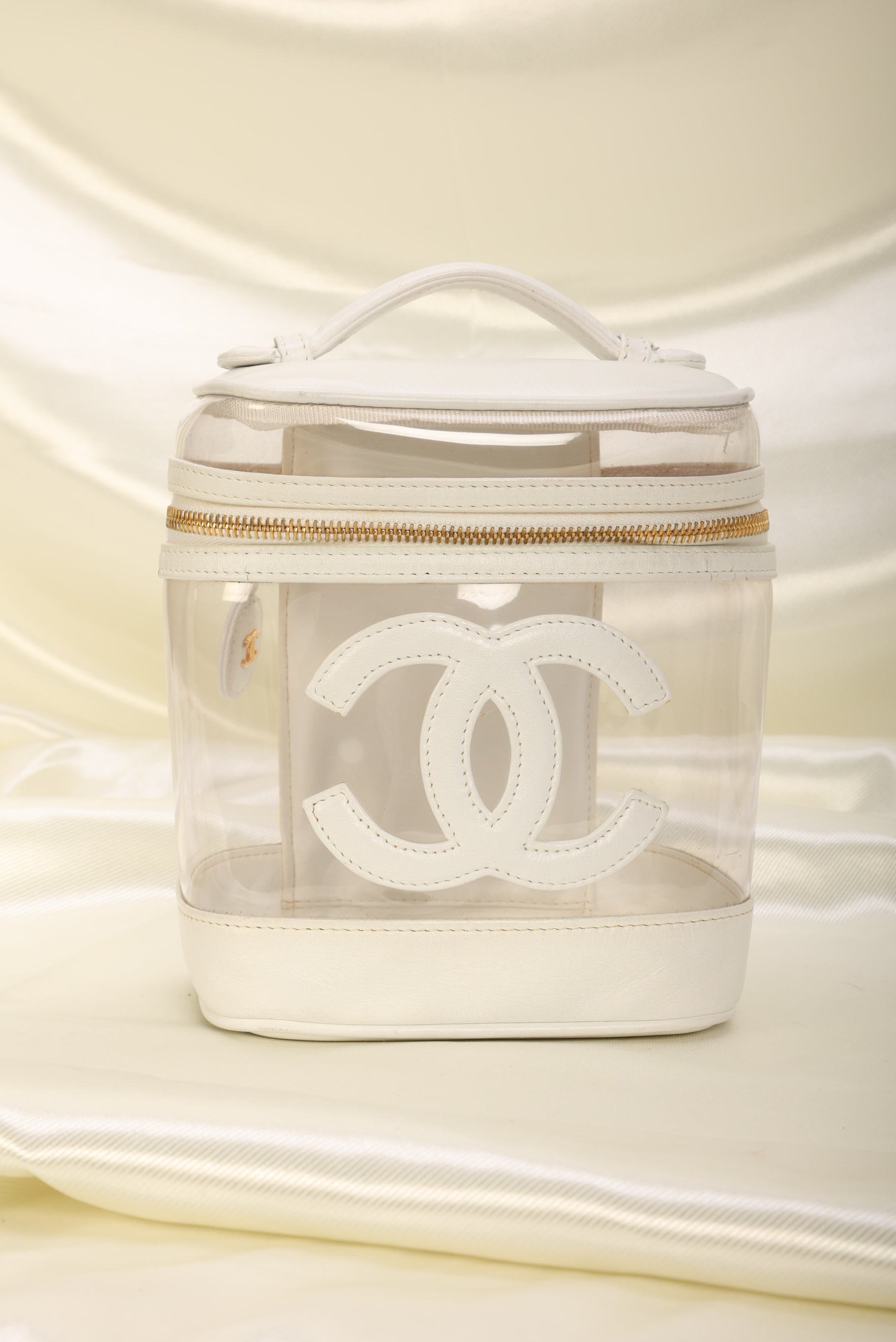 A transparent Chanel vanity bag, crafted in lambskin and PVC with the iconic CC logo on the front. Perfect for chic concert or festival use! Can be as a top handle, or can even used as a chic makeup bag for your vacation! Elevate?any outfit and fit all your daily essentials!