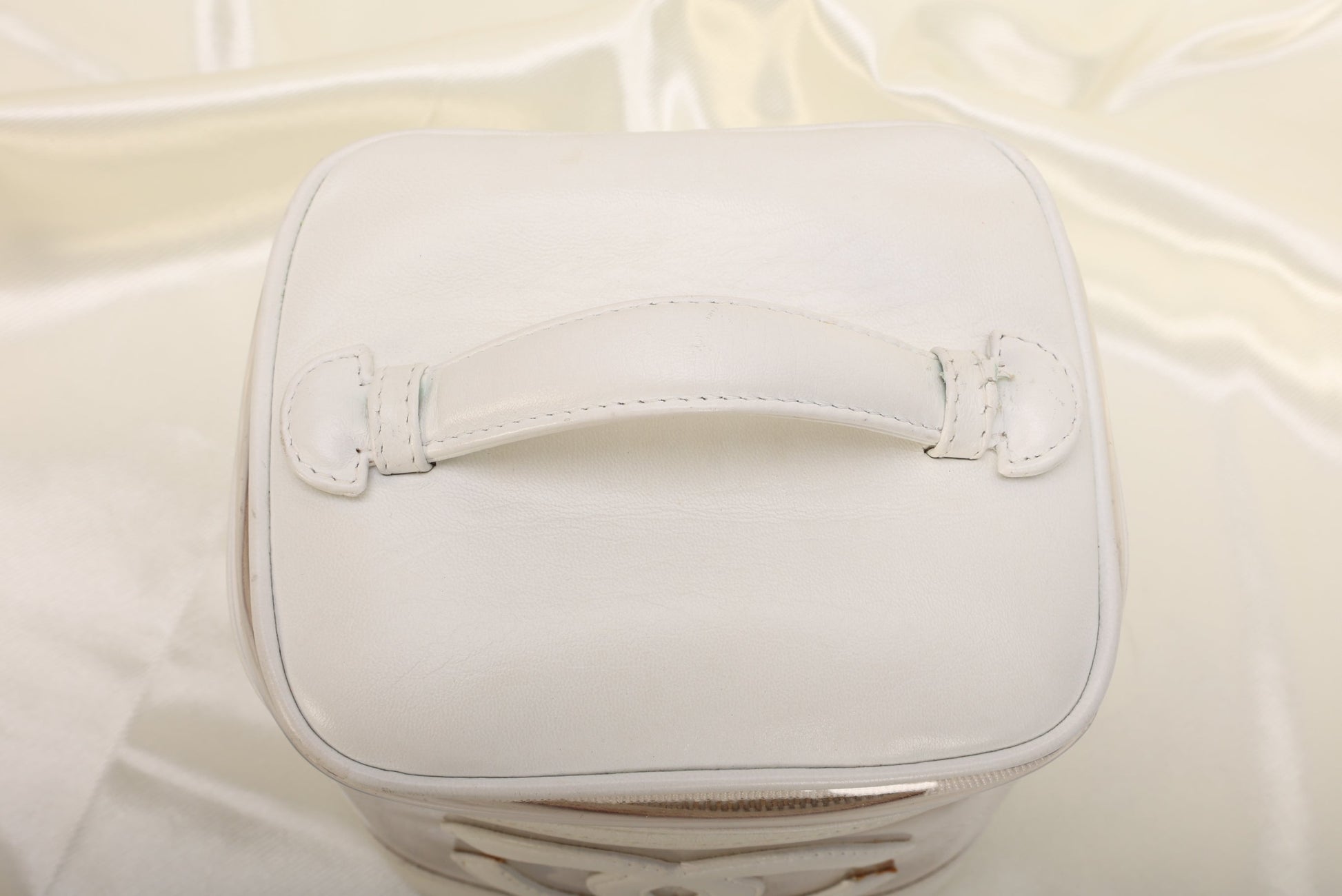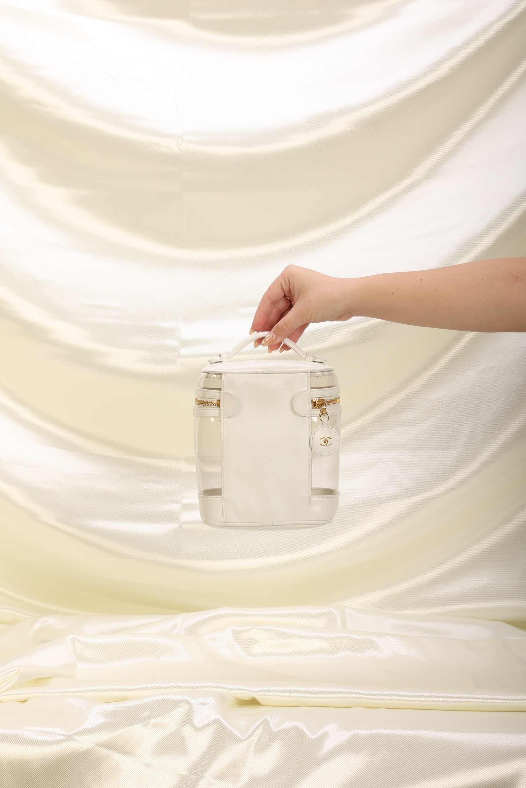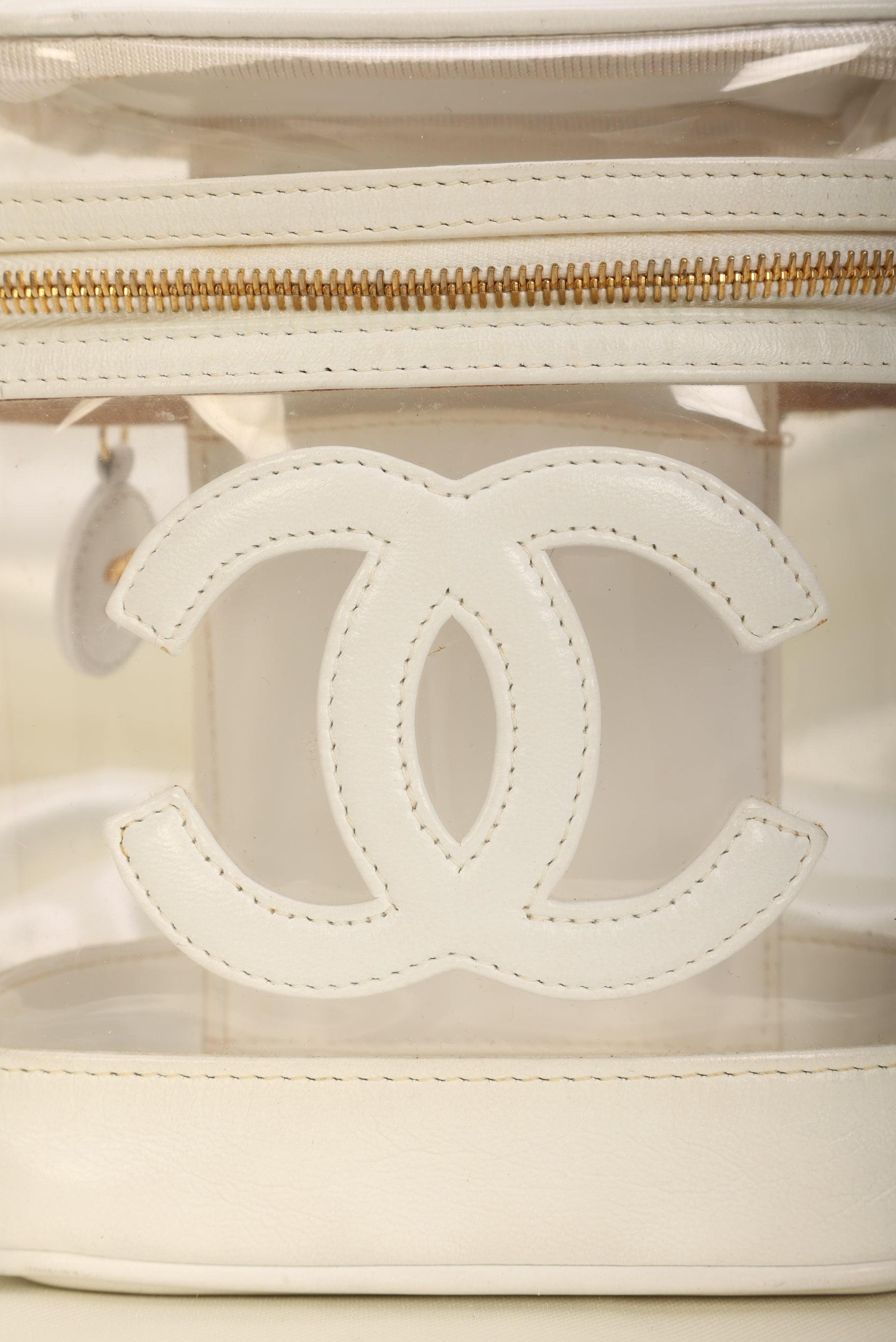 A transparent Chanel vanity bag, crafted in lambskin and PVC with the iconic CC logo on the front. Perfect for chic concert or festival use! Can be as a top handle, or can even used as a chic makeup bag for your vacation! Elevate?any outfit and fit all your daily essentials!