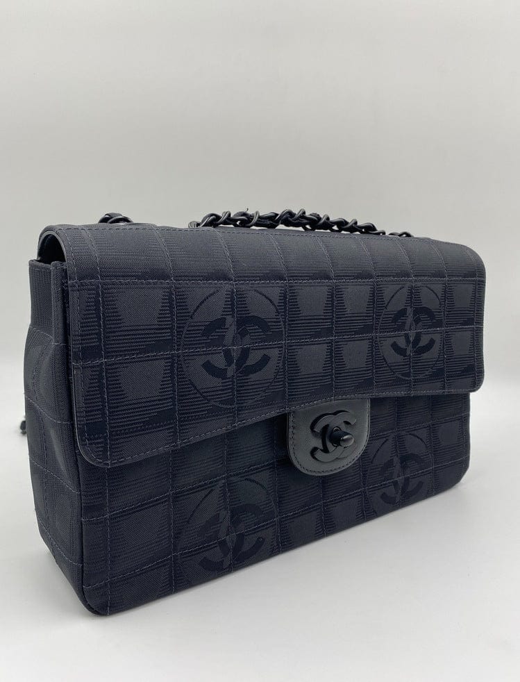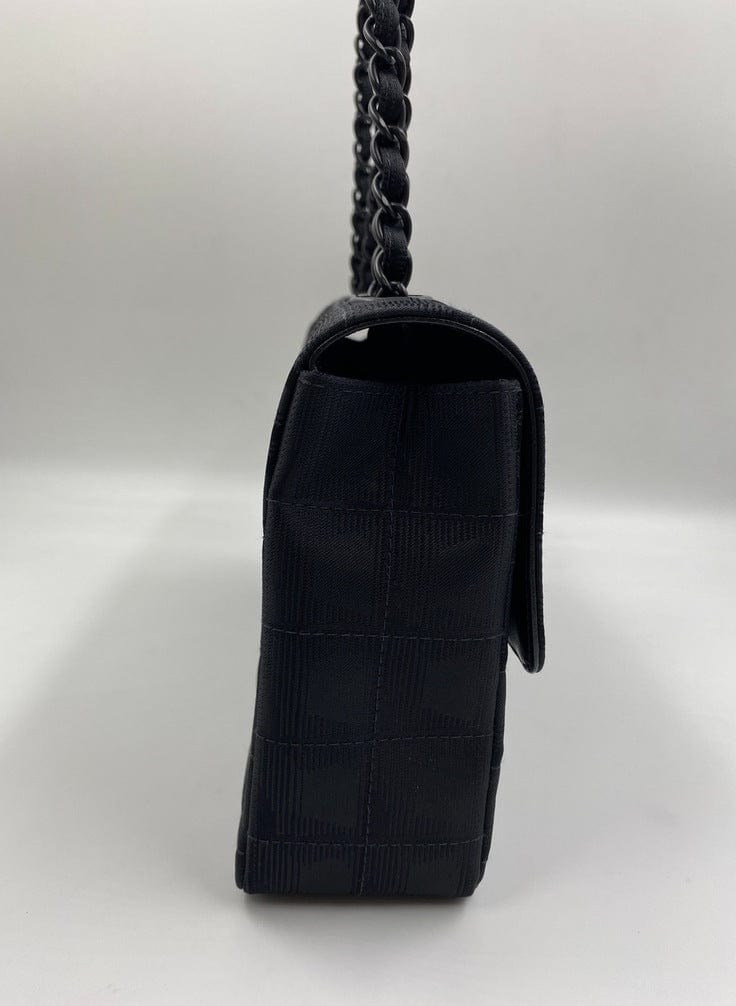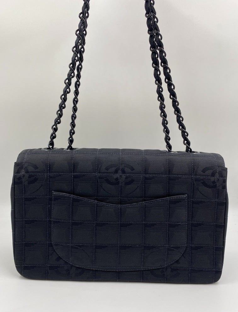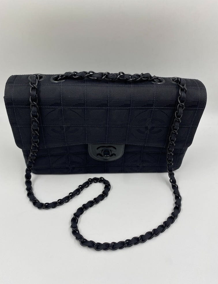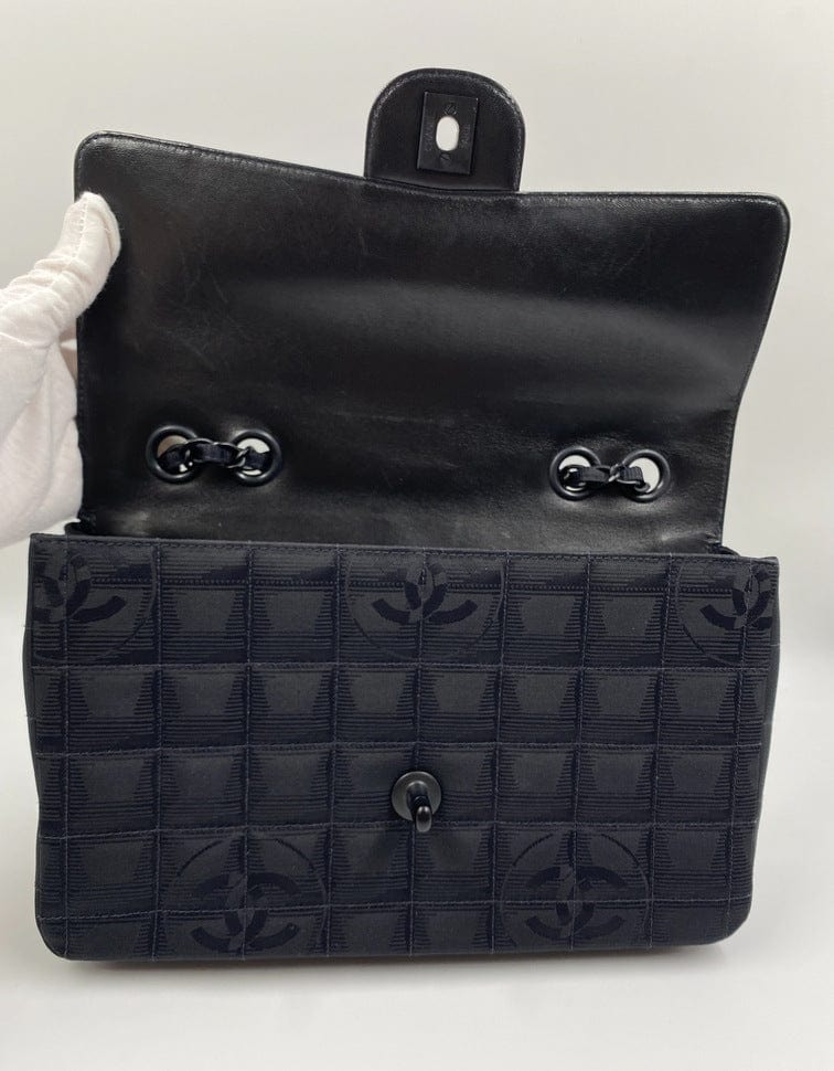 A super cool and rare Chanel Travel Line nylon single flap bag with all black hardware and black leather trim. This bag has a slip pocket on the back panel and inside the bag there is a further slip pocket and zipped pocket for valuables. Inside the serial number sticker is still intact and attached. The serial number tells us this bag was made between 2002-2003.