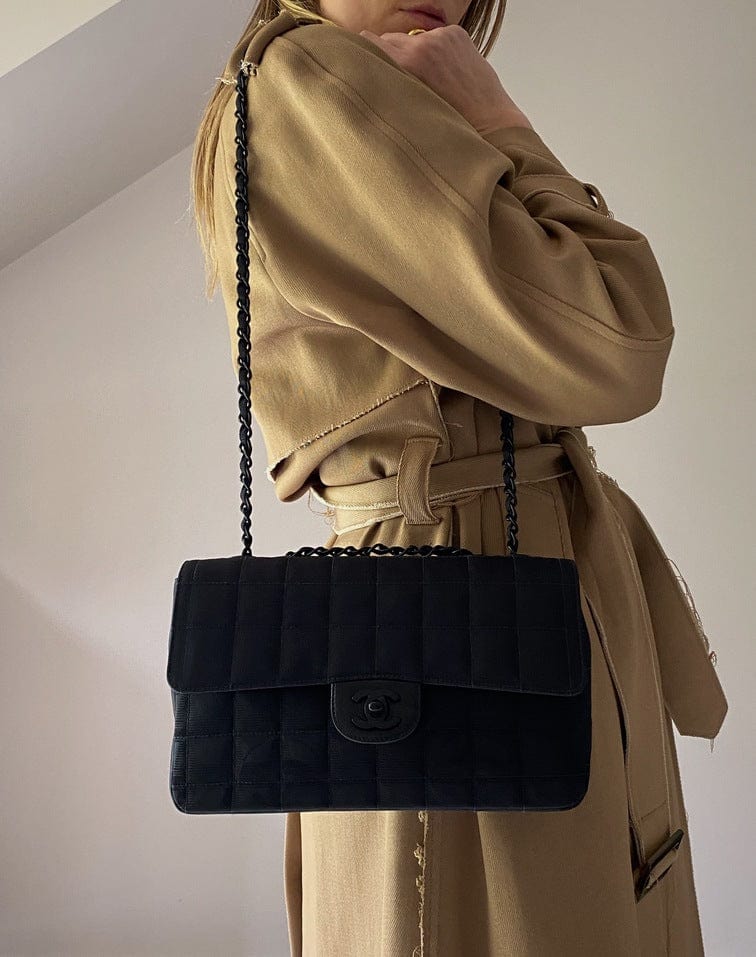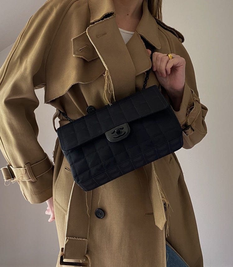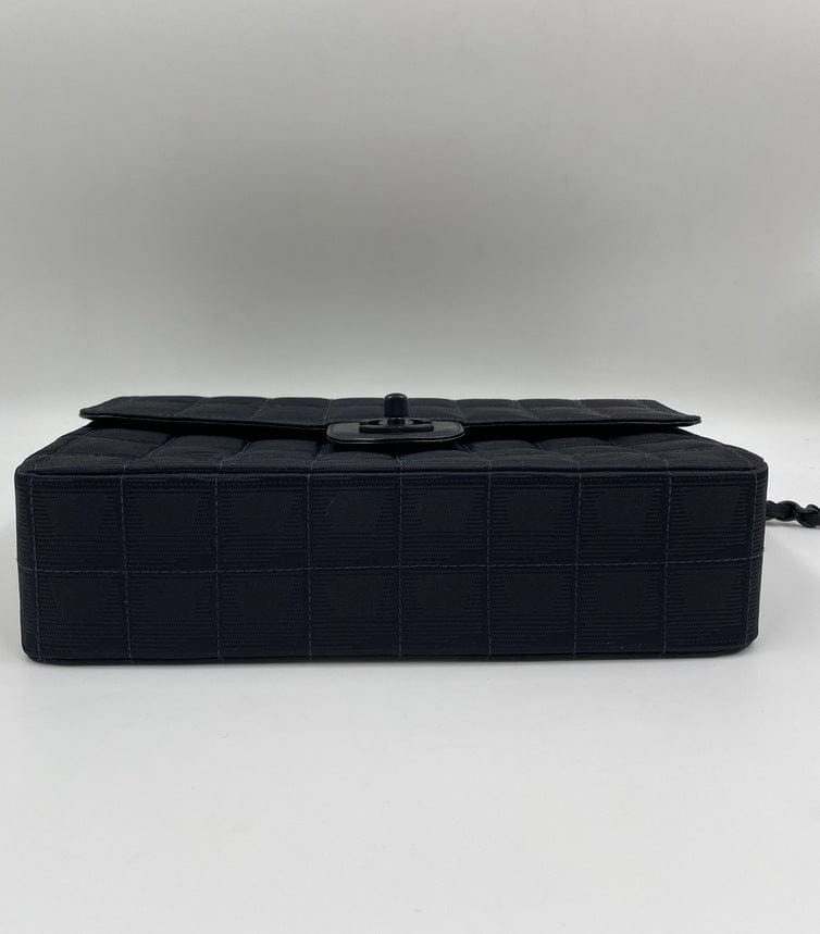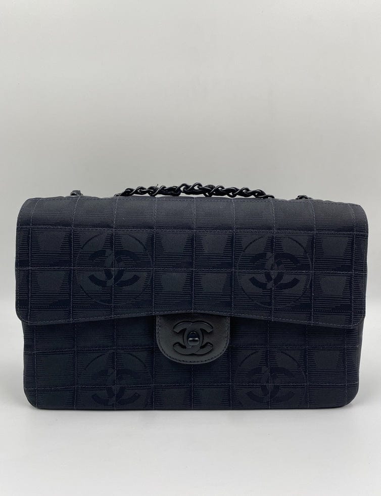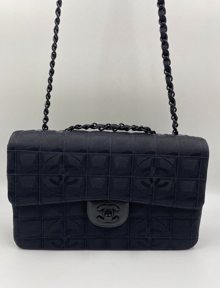 A super cool and rare Chanel Travel Line nylon single flap bag with all black hardware and black leather trim. This bag has a slip pocket on the back panel and inside the bag there is a further slip pocket and zipped pocket for valuables. Inside the serial number sticker is still intact and attached. The serial number tells us this bag was made between 2002-2003.