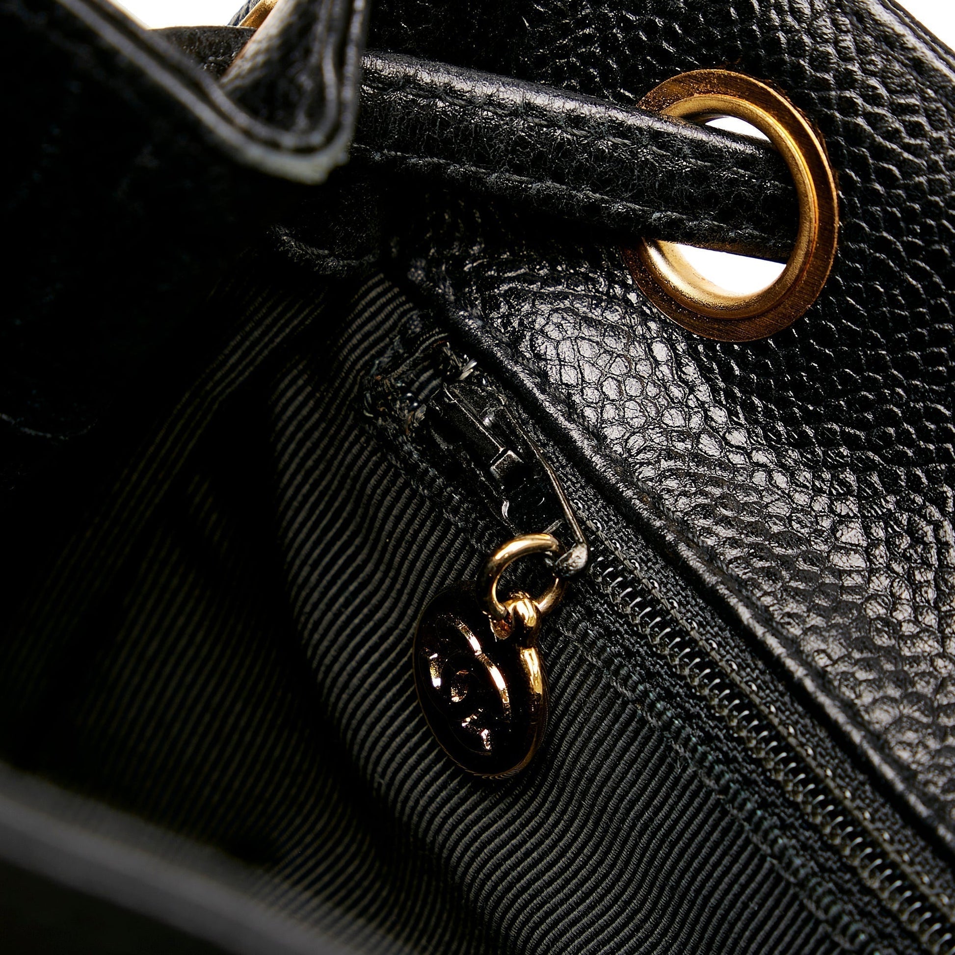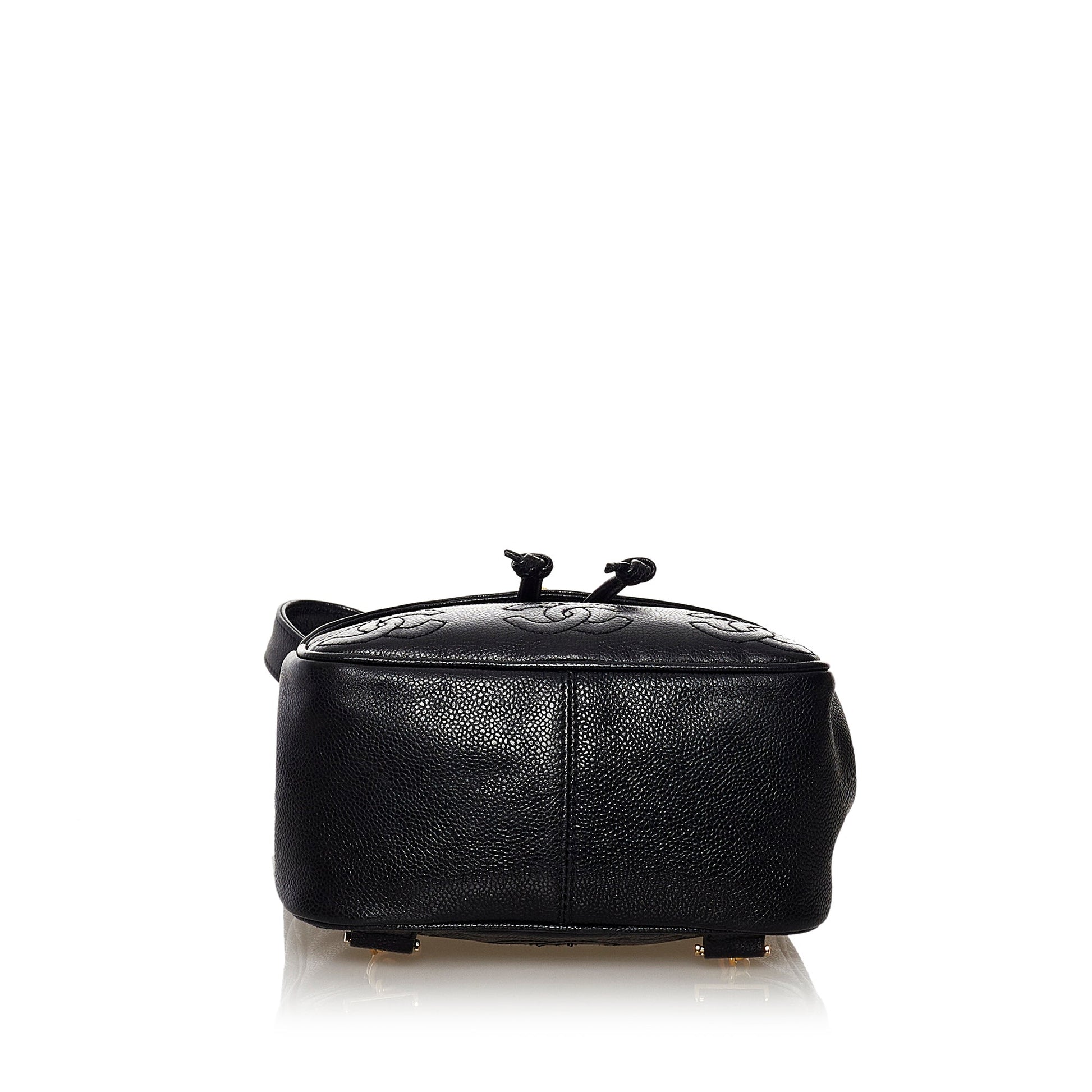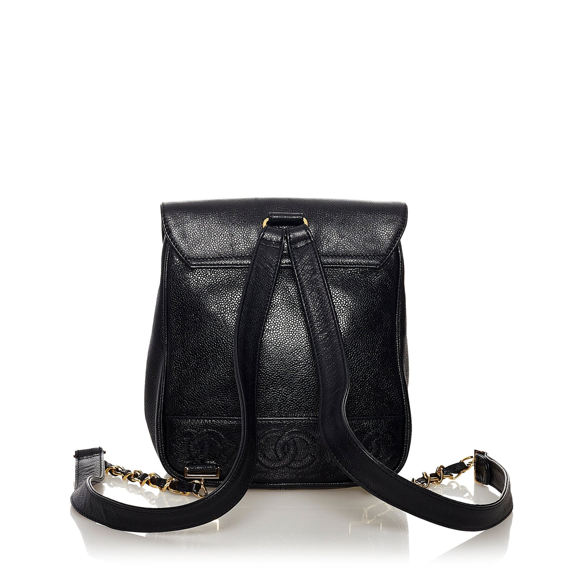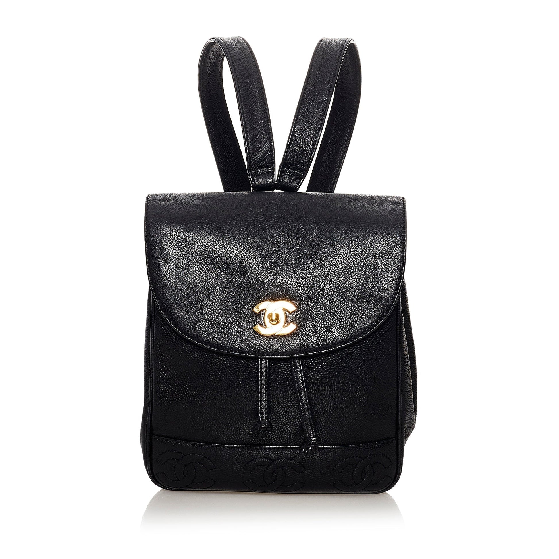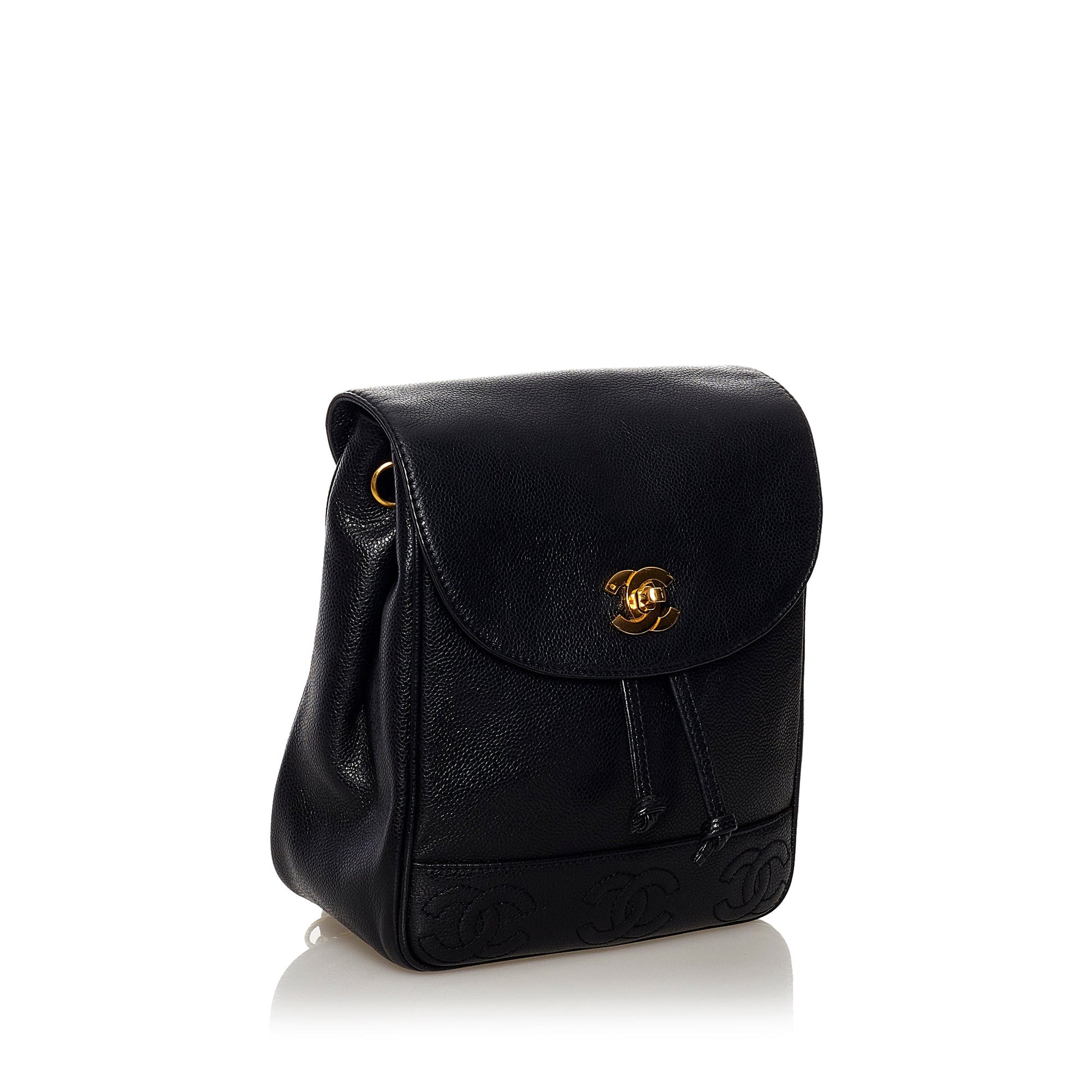 This beautiful Chanel Triple CC backpack has a black caviar leather body with the signature Triple CC stitching along the bottom of the Bag, flat leather straps with gold-tone detailing, a flap with gold-tone interlocking Cs, and a twist closure. The Bag also features a drawstring closure and zippered compartments inside.