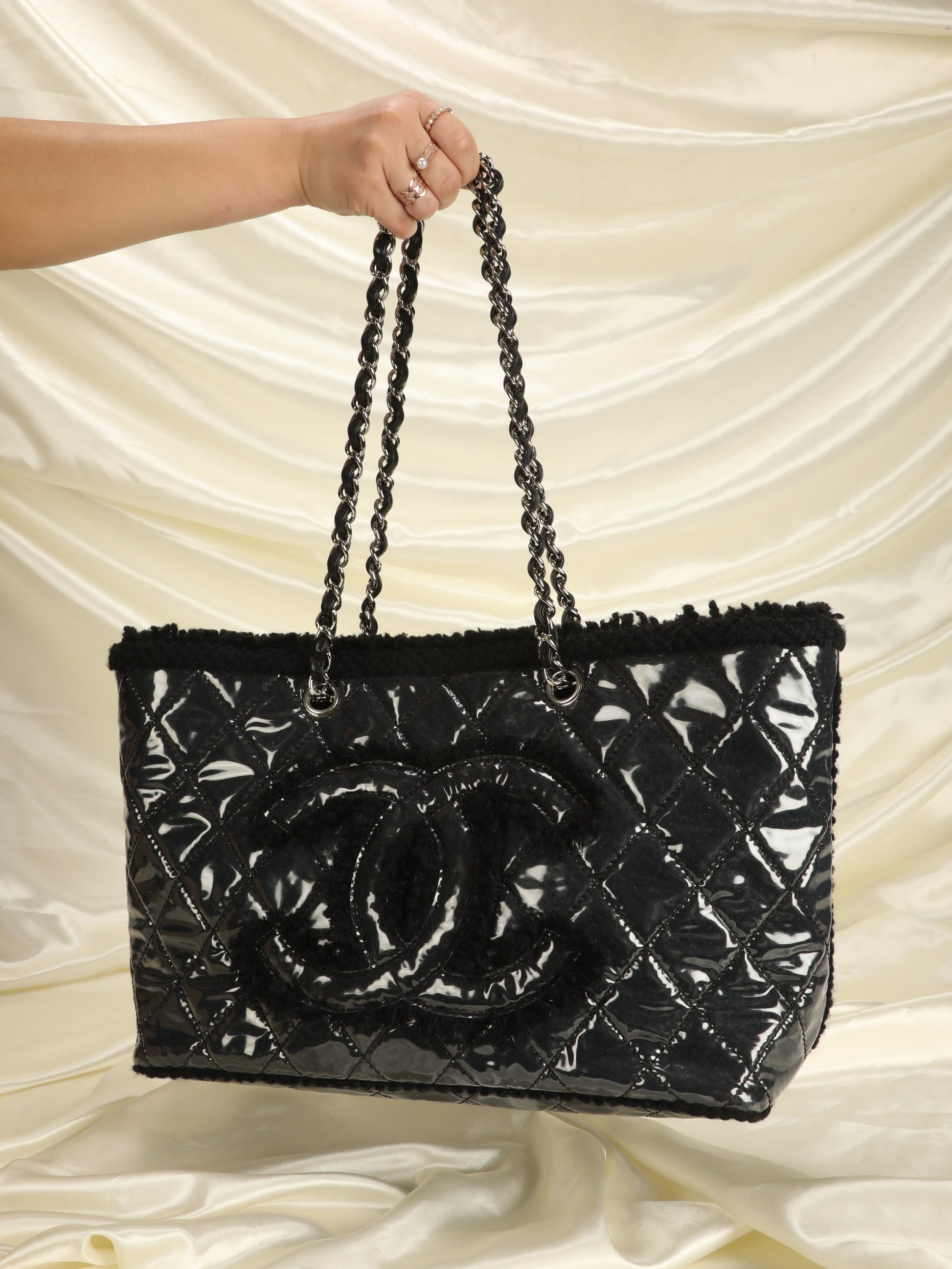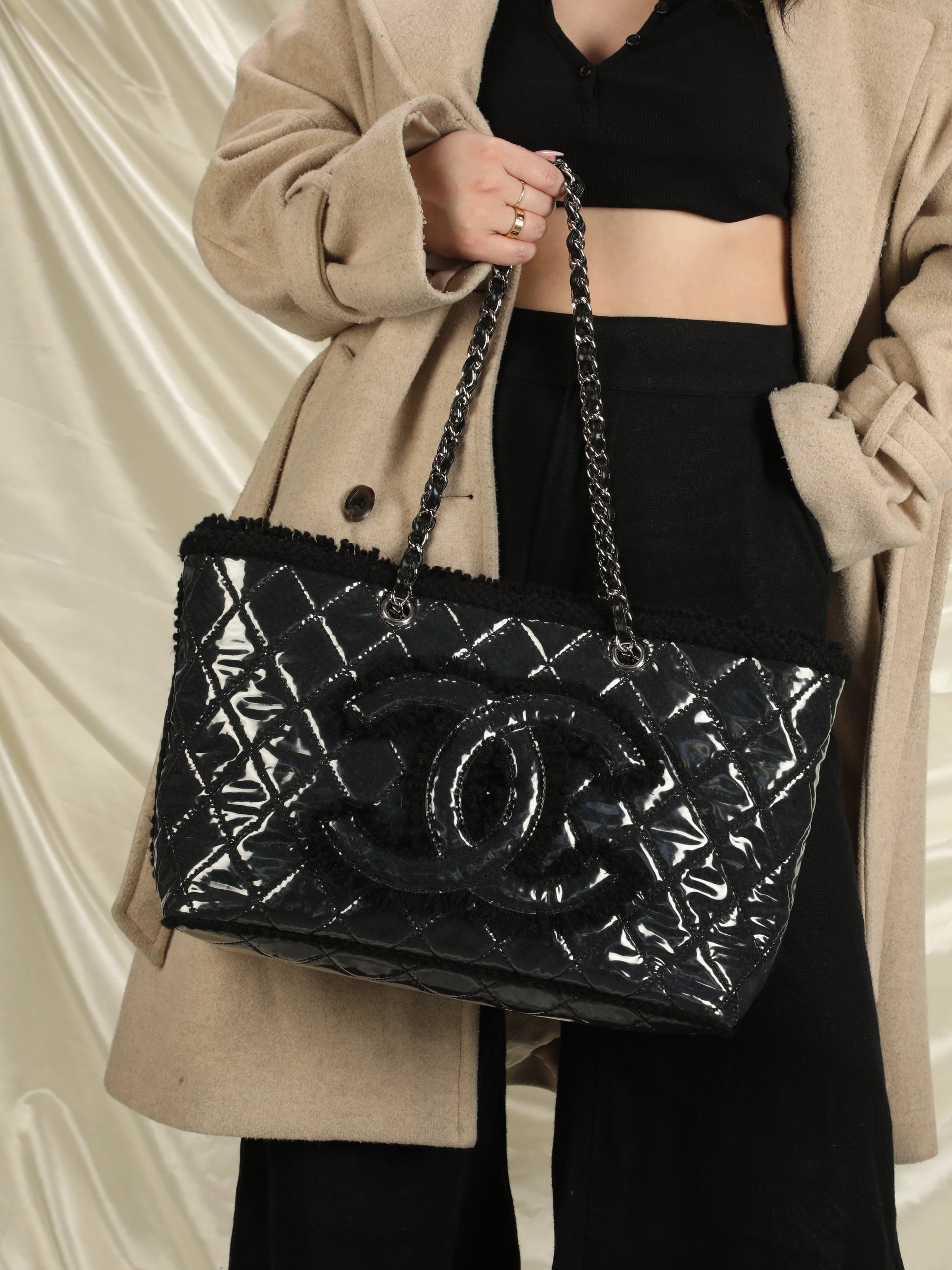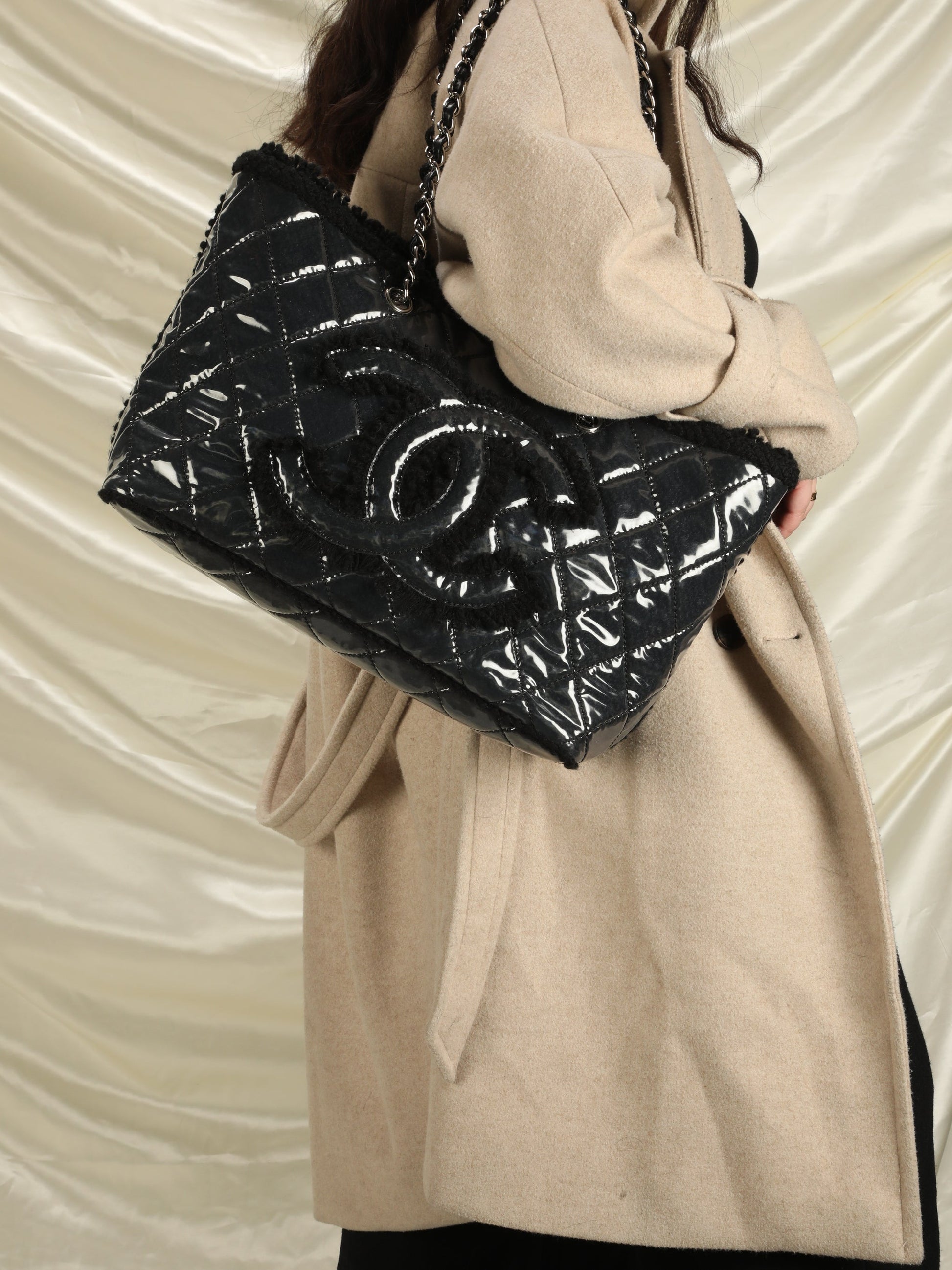 A unique vintage?Chanel tote crafted in both tweed and vinyl!! Large Chanel logo adorns the front of this bag. Spacious?size allows this piece to be a great?bag to haul everything in for the day. Pair with a large coat or trench with some sneakers or flats. Can fit a laptop, water bottle, and more! A classic piece to enjoy for years!?