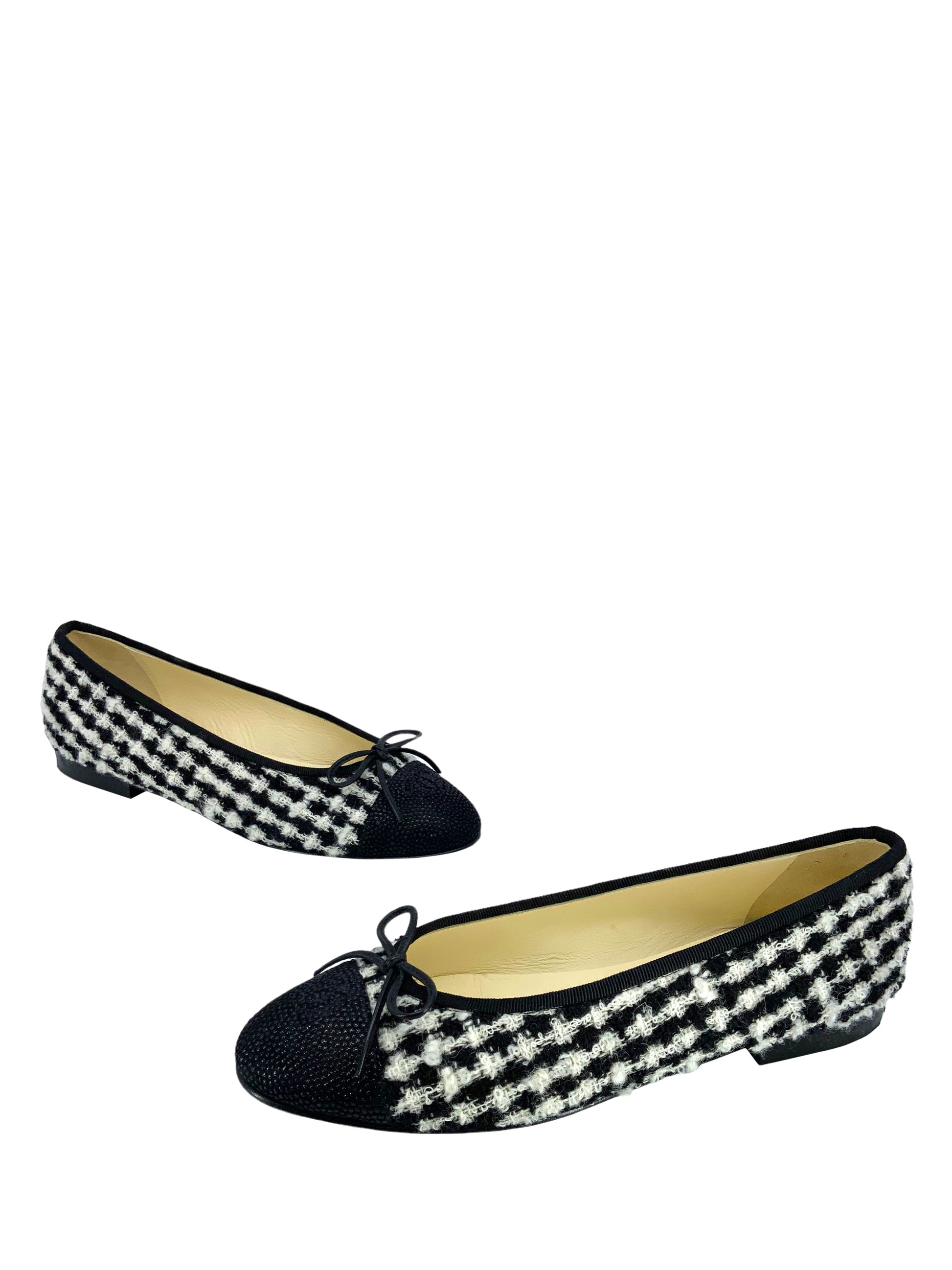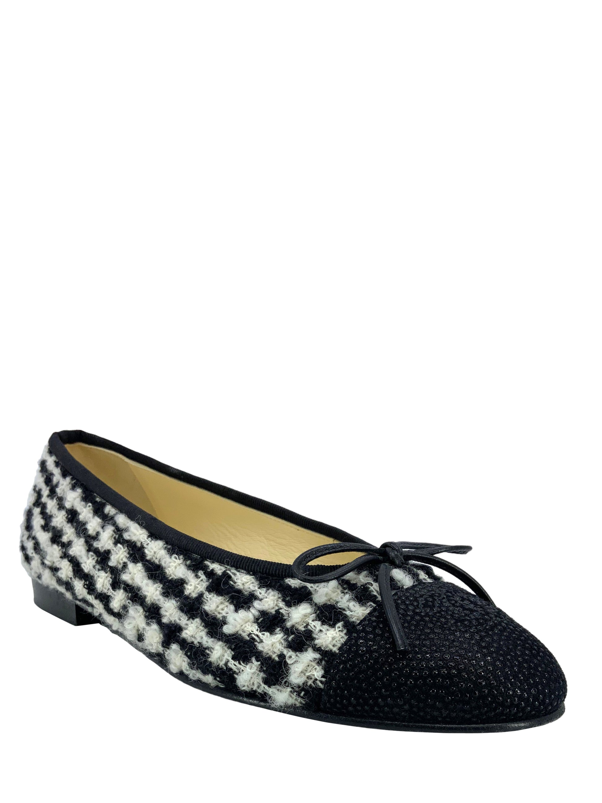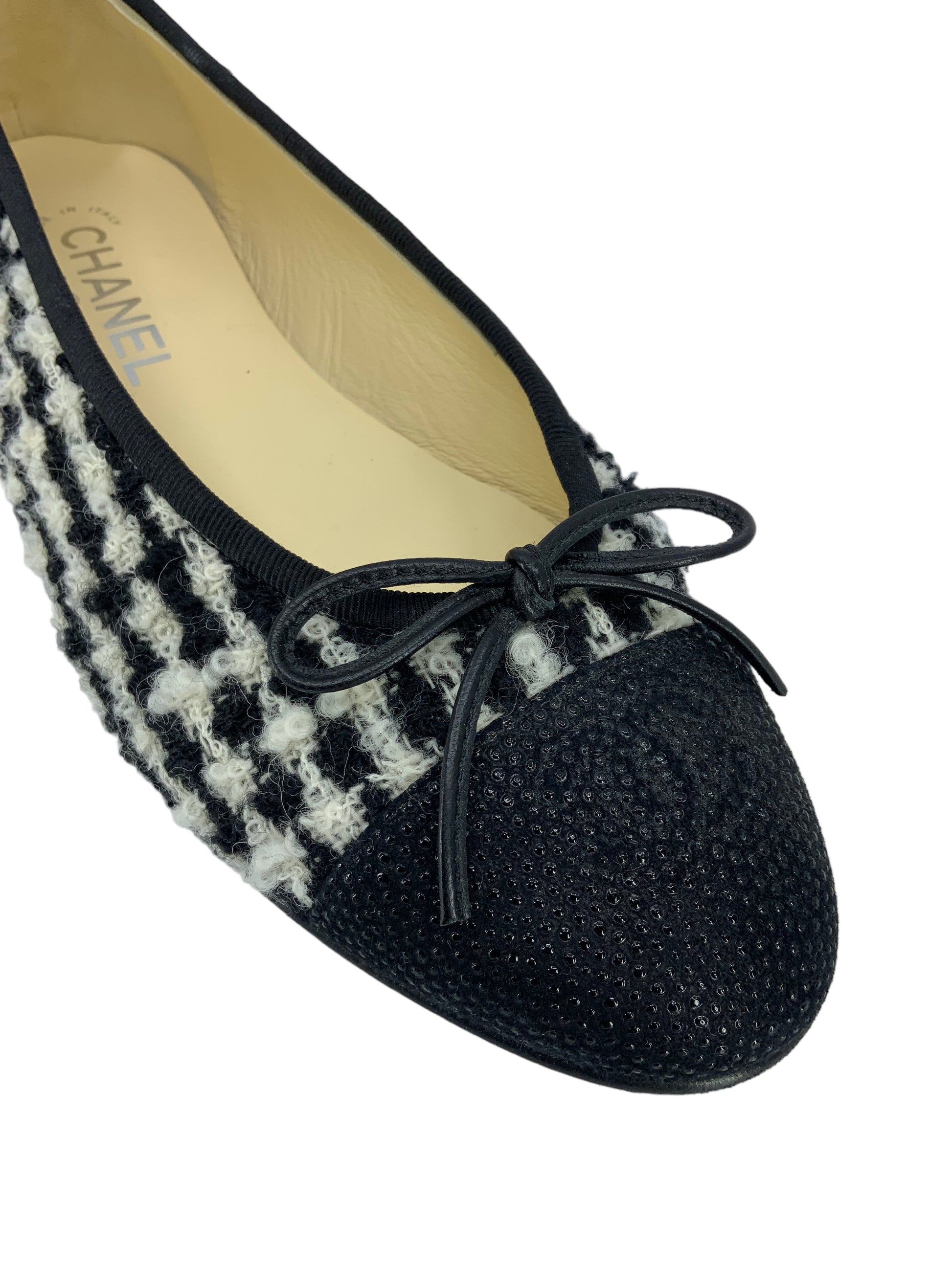 d ! Chanel Tweed CC Logo Cap Toe Ballerina Flats Size 8 (IT 38) crafted from black andwhitetweed.Featuring awell-rounded CC logo cap toewith a bow tie accenton the vamp.