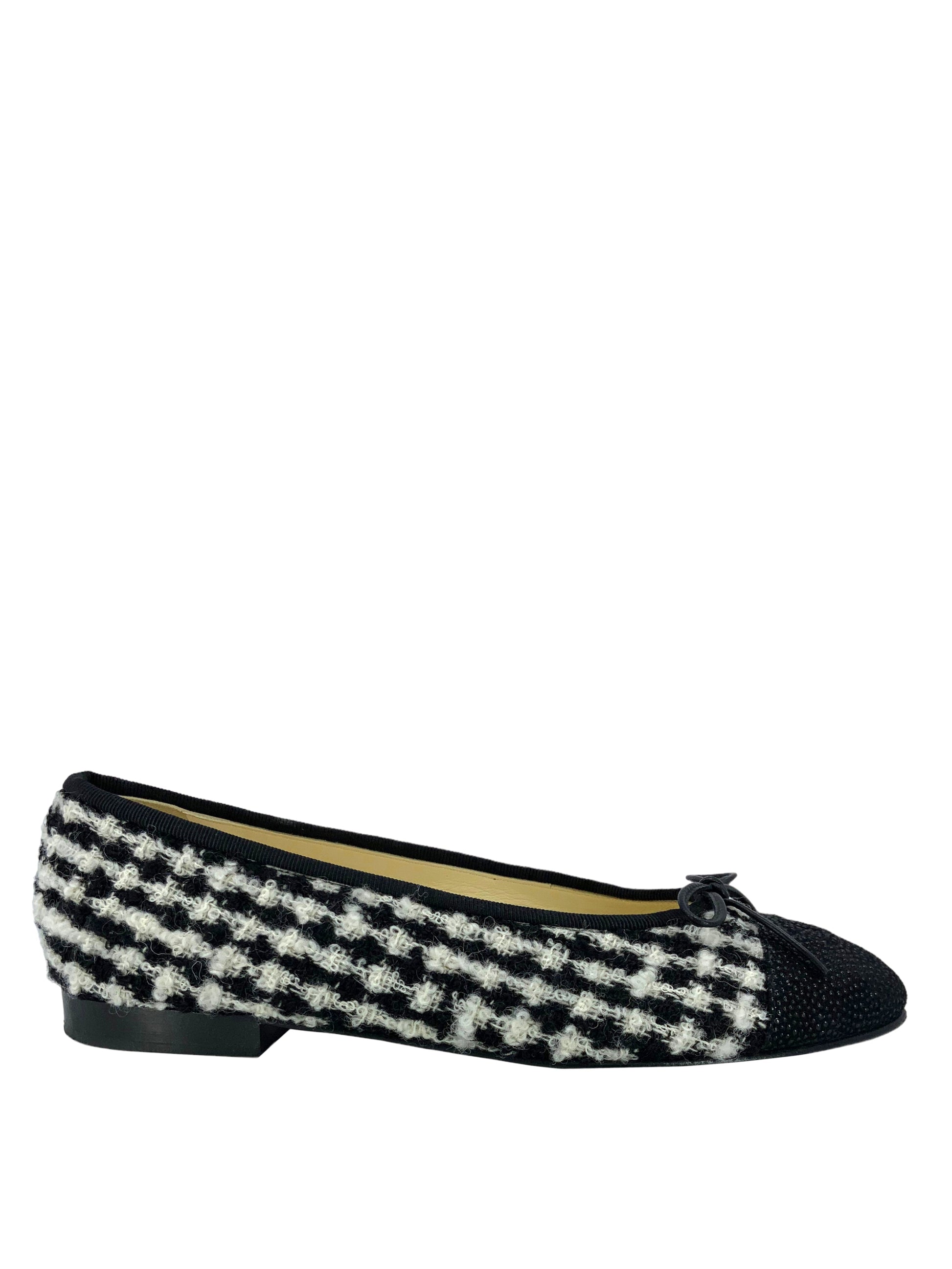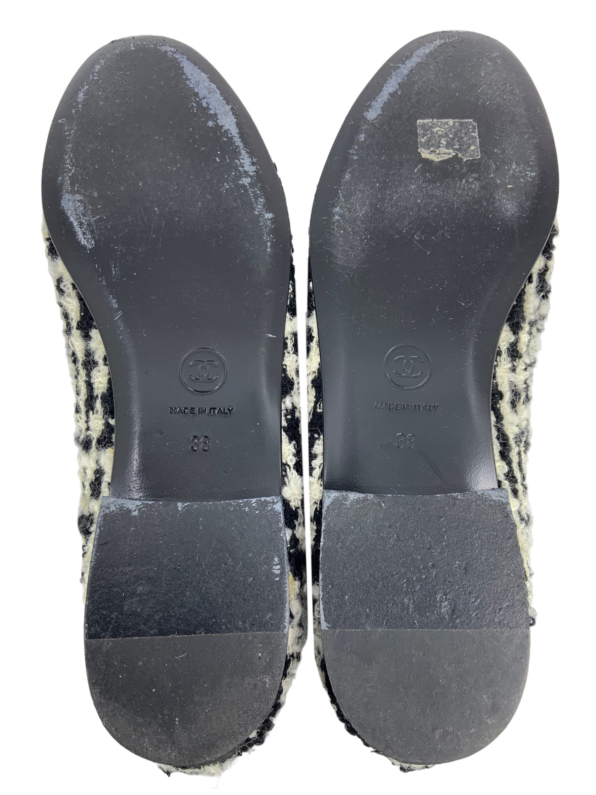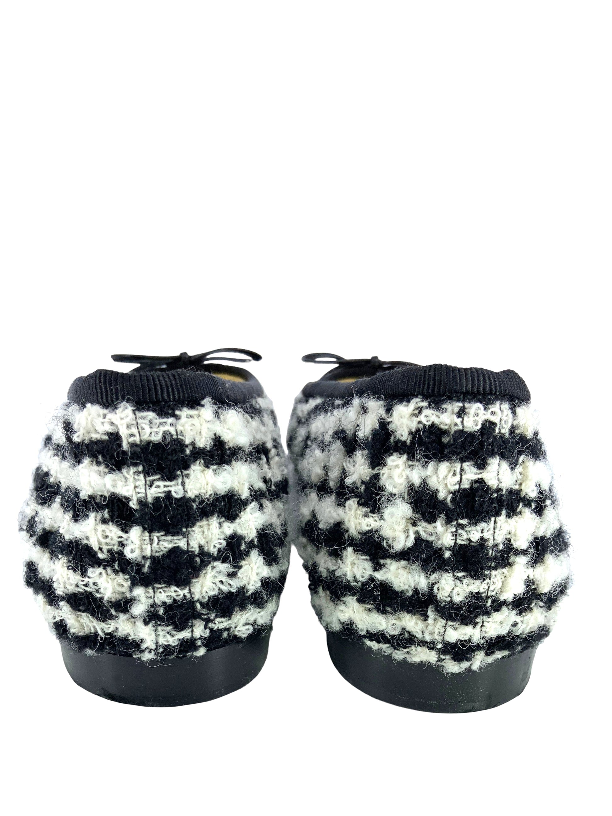 d ! Chanel Tweed CC Logo Cap Toe Ballerina Flats Size 8 (IT 38) crafted from black andwhitetweed.Featuring awell-rounded CC logo cap toewith a bow tie accenton the vamp.
