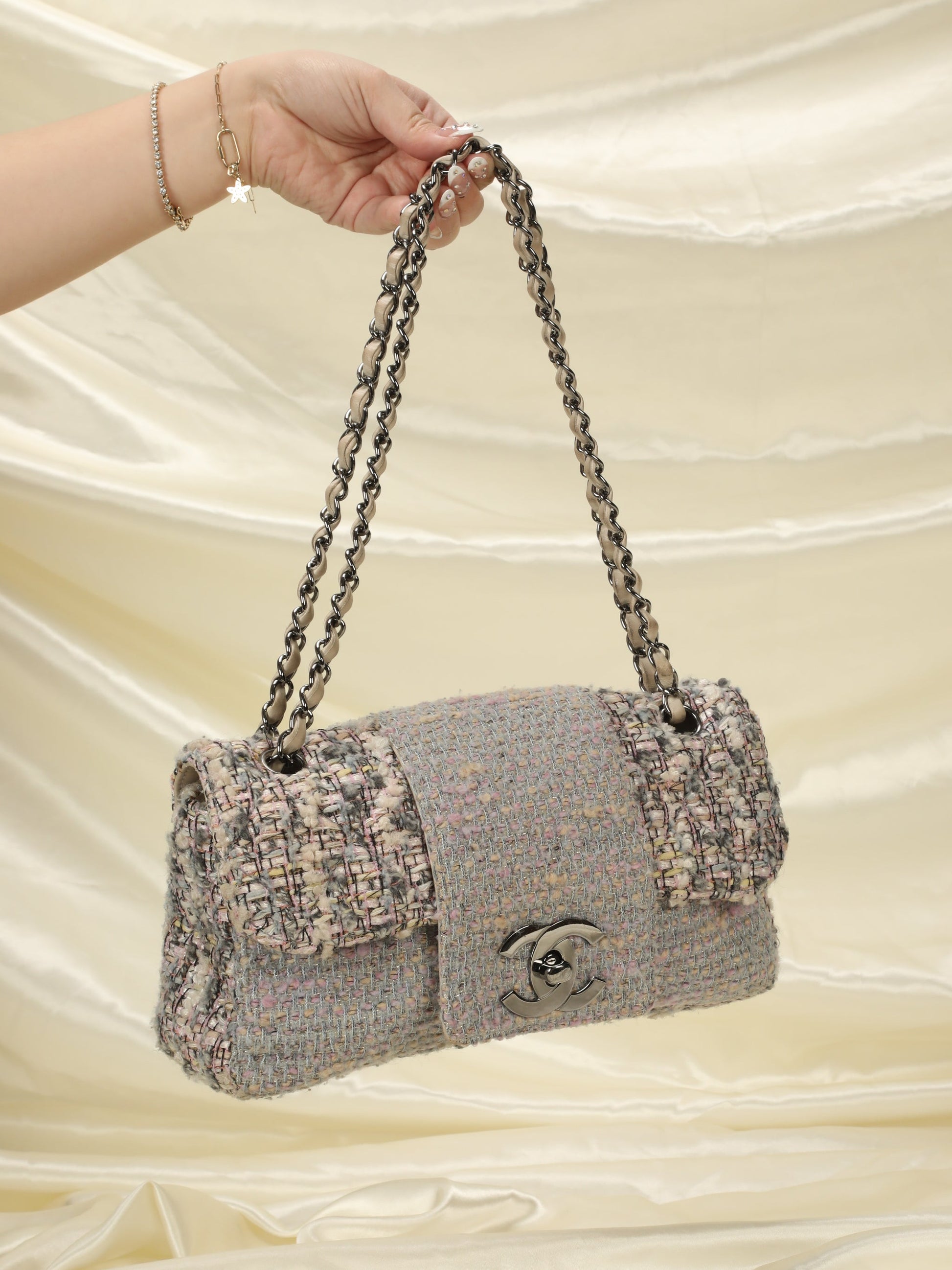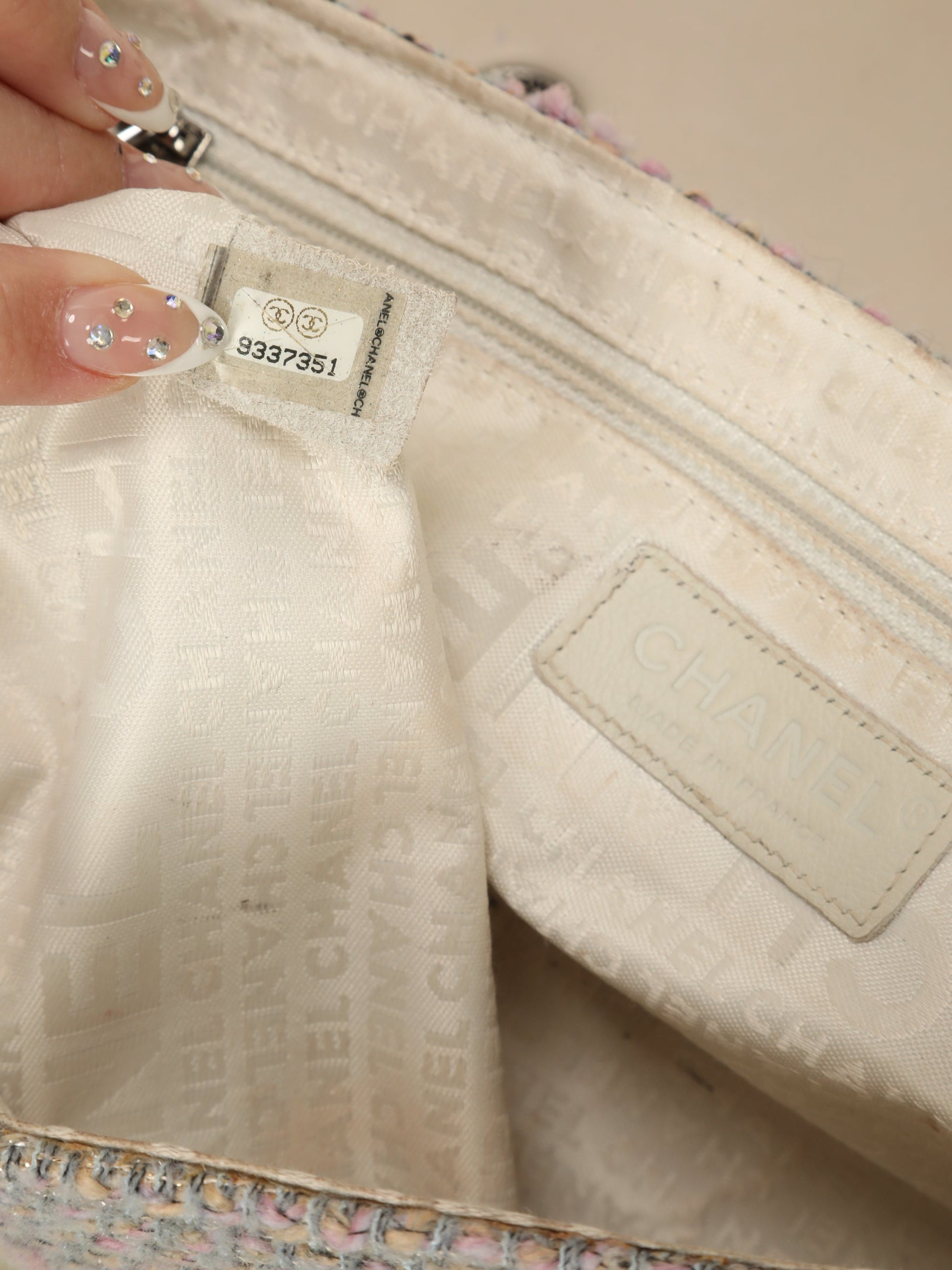 Chanel Collector's piece!! Crafted in a gorgeous?tweed overlay with?pastel hues and large Chanel logo in silver hardware, this piece is absolutely stunning. The classic Chanel chain comes with the cream-colored lambskin intertwined with the silver hardware. Do not miss out on this beauty! Currently online for 3500+!