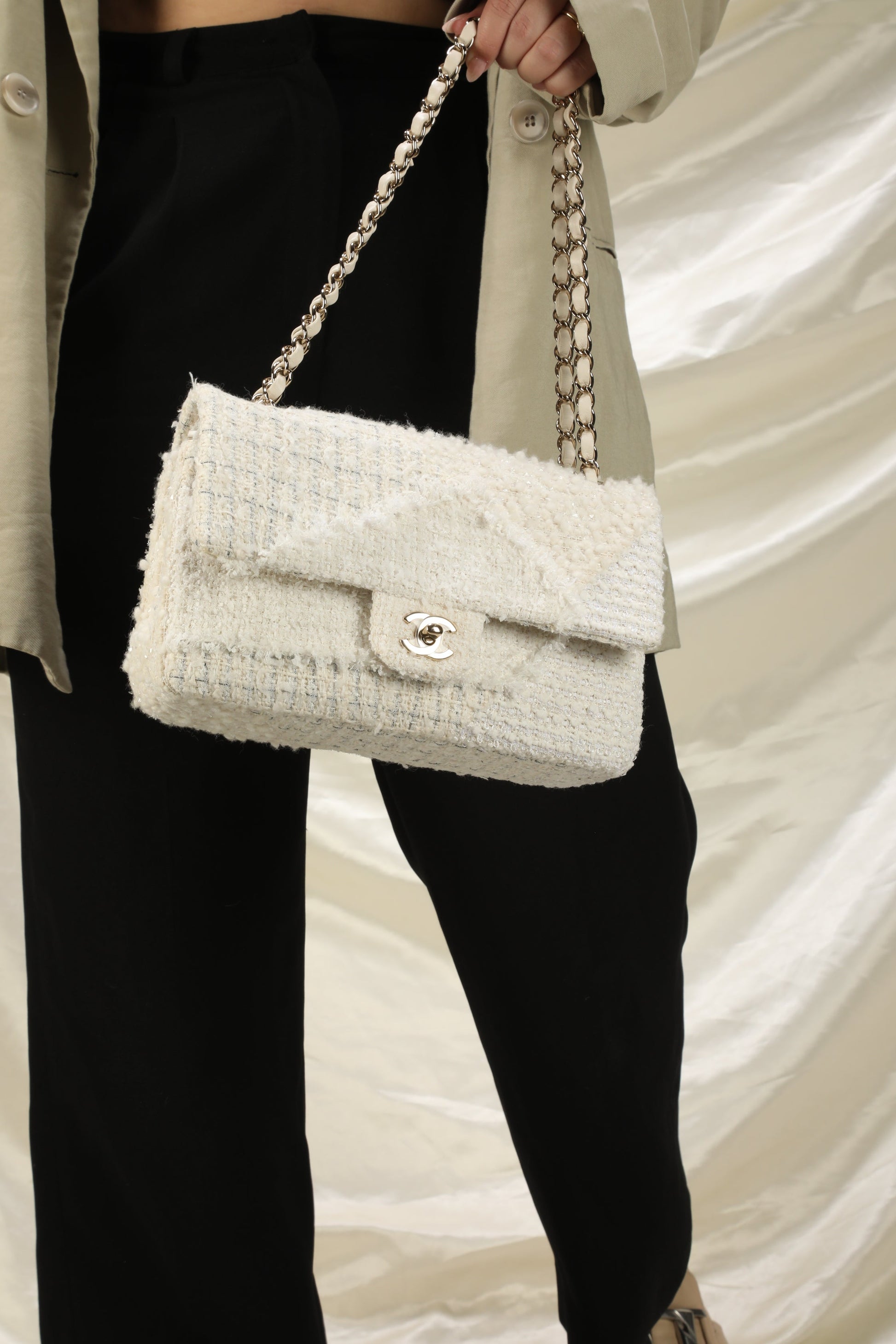 Bringing to the shop a Chanel medium turnlock crafted in Chanel's?gorgeous tweed and gold hardware. Chanel's famous lambskin?intertwined on the chain?create a beautiful contrast to the tweed body.