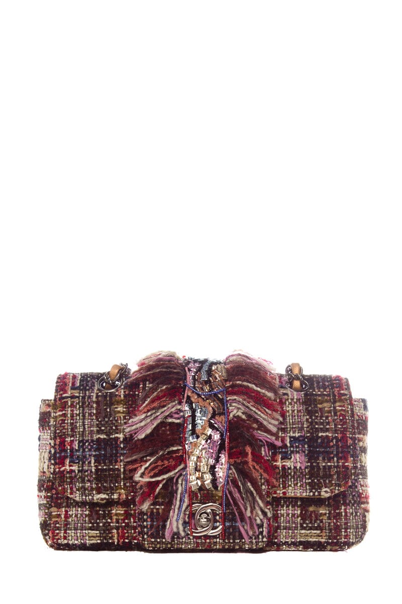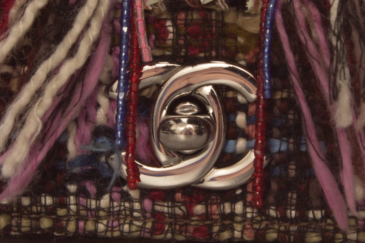 Chanel tweed pattern single flap shoulder bag featuring Maison Lesage fringe, interlocking 'CC' closure at front, beading embellishments at front, and gun-metal hardware. This item is in excellent condition.