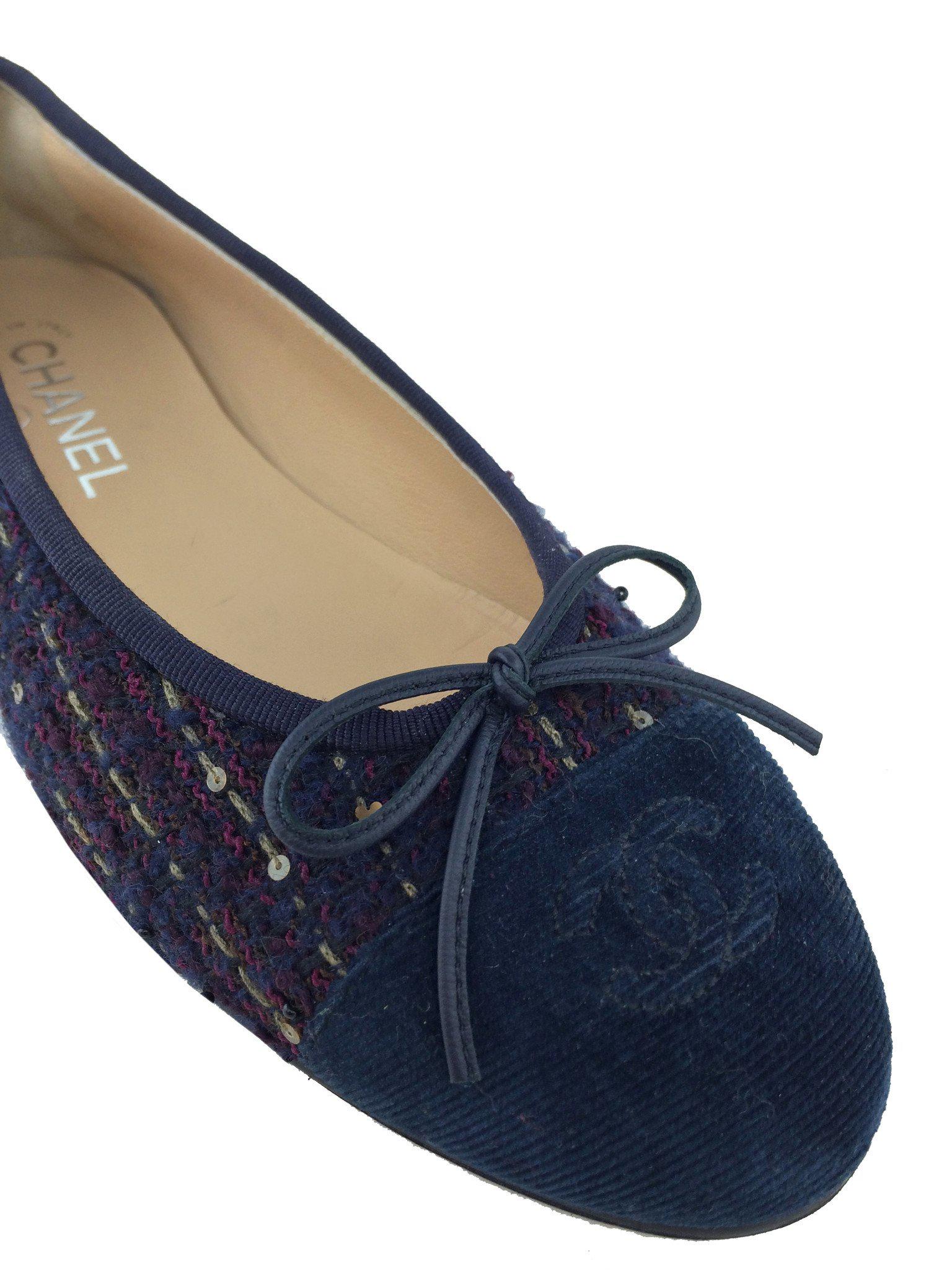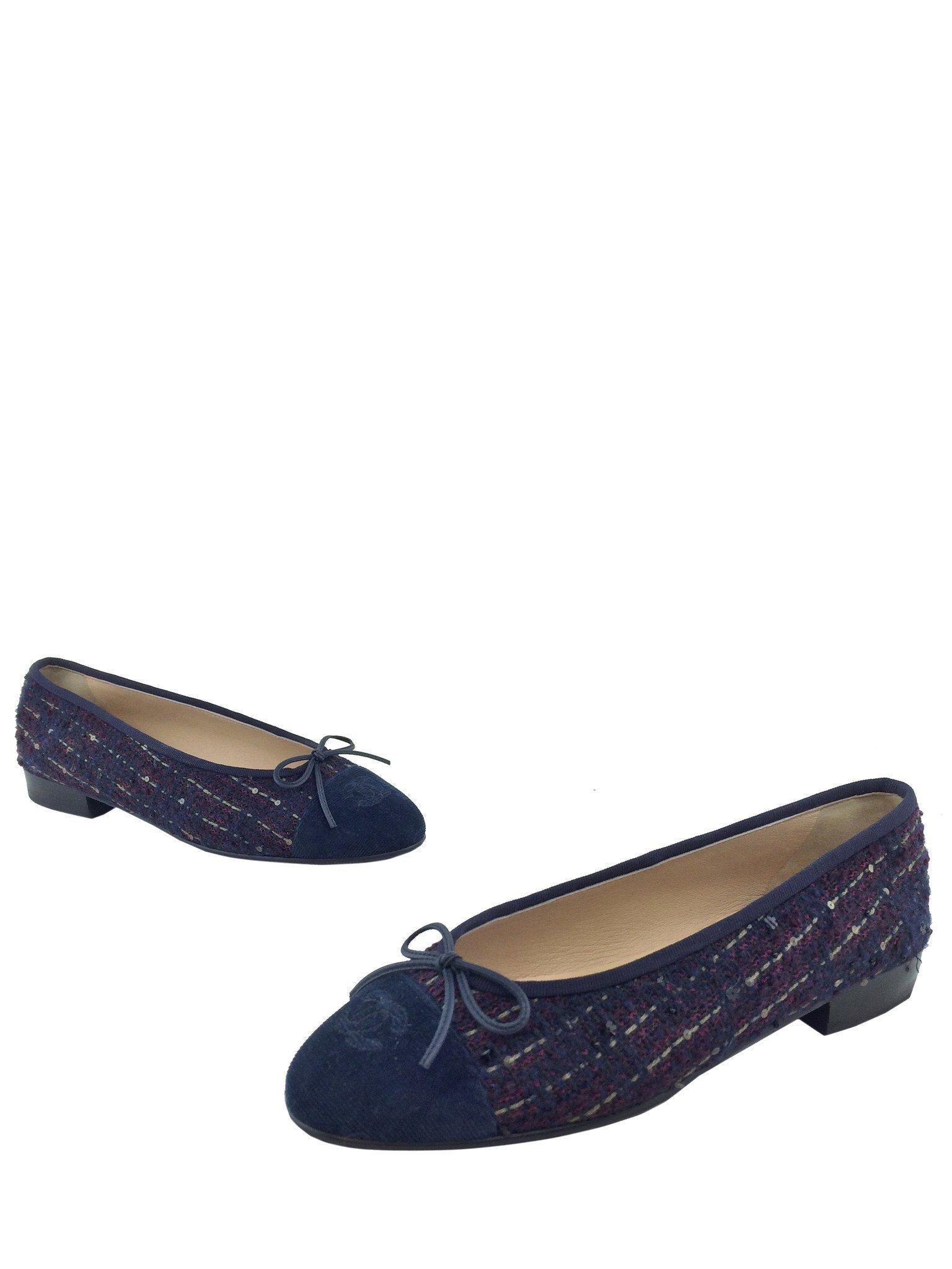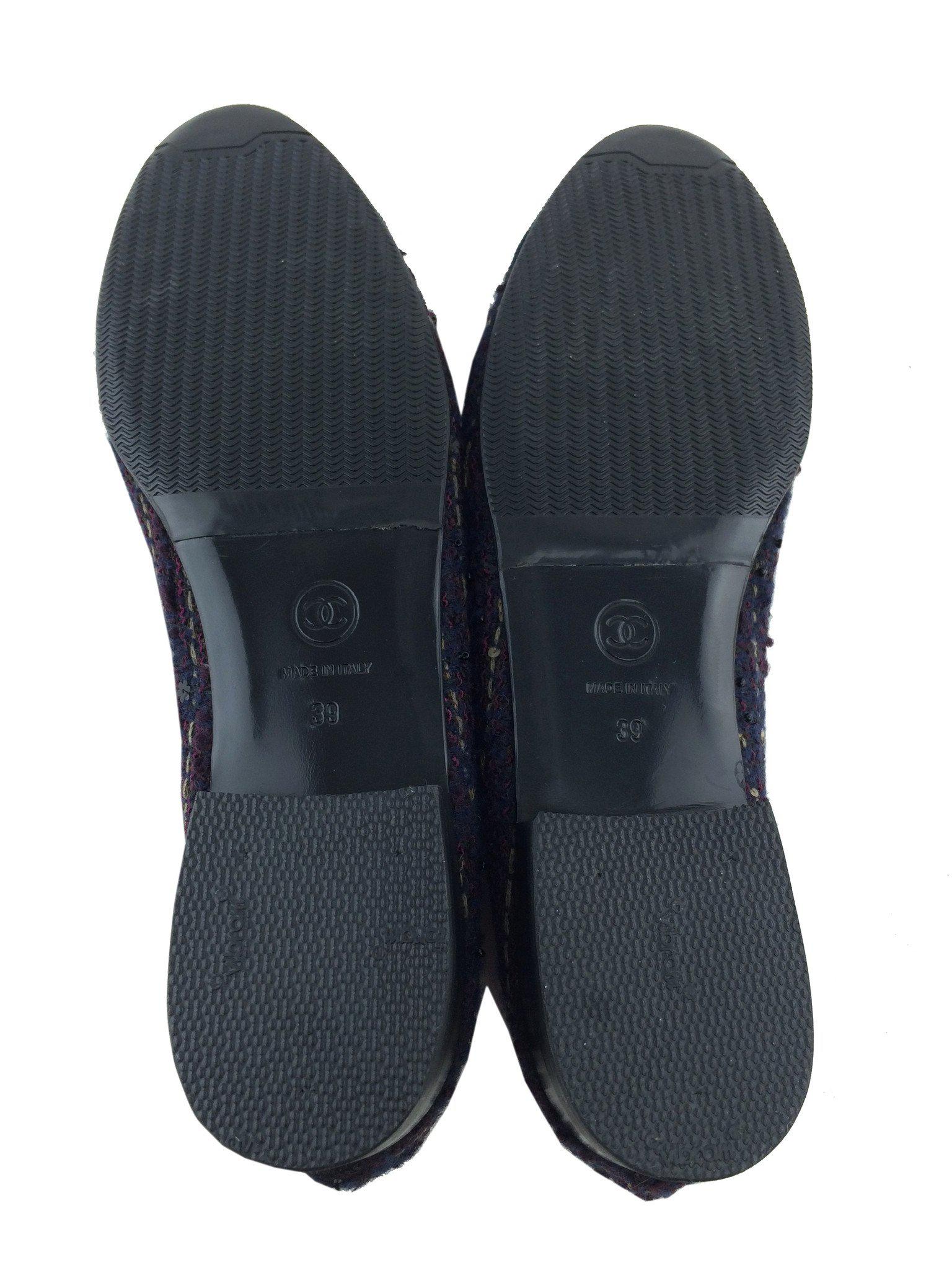 Chanel Tweed Sequin CC Cap Toe Ballerina Flats Size 9 (IT 49) crafted from navy and burgundy tweed with sequin detailing.Featuring awell-rounded CC logo cap toewith a bow tie accenton the vamp.