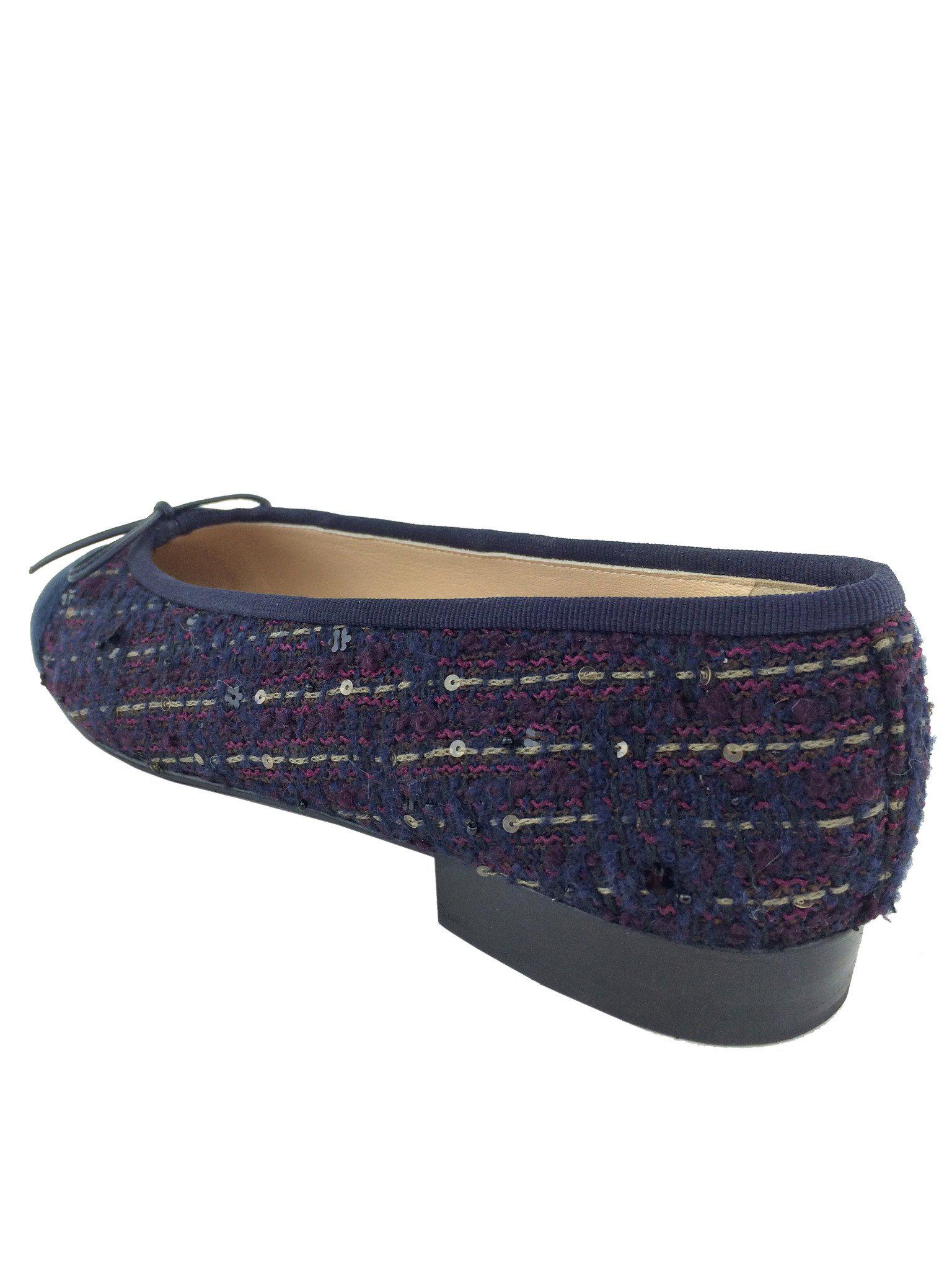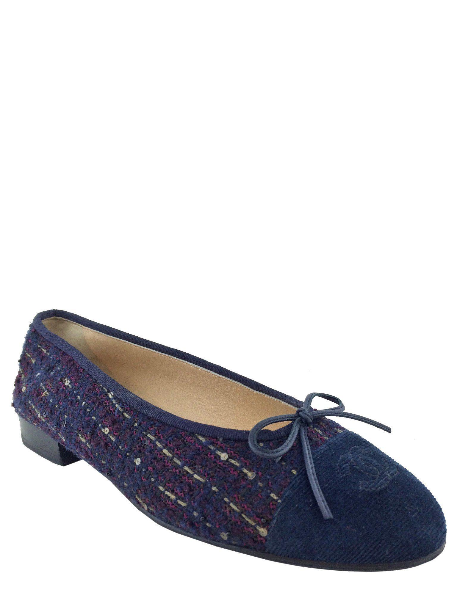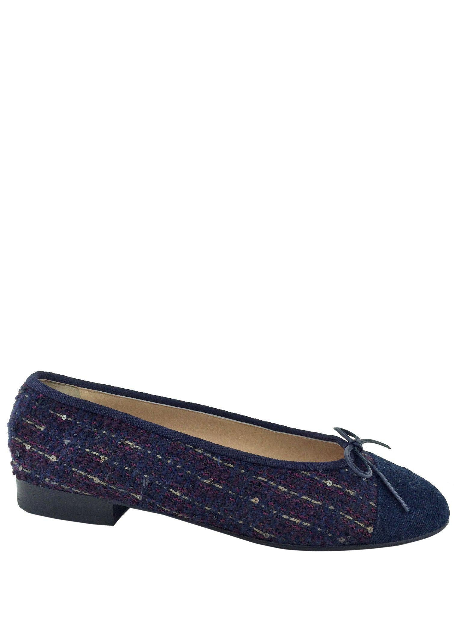 Chanel Tweed Sequin CC Cap Toe Ballerina Flats Size 9 (IT 49) crafted from navy and burgundy tweed with sequin detailing.Featuring awell-rounded CC logo cap toewith a bow tie accenton the vamp.