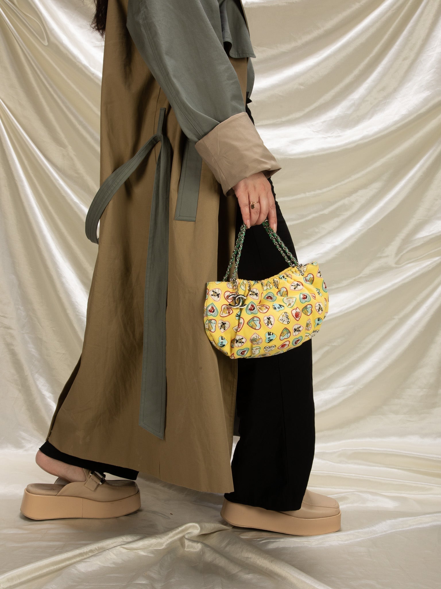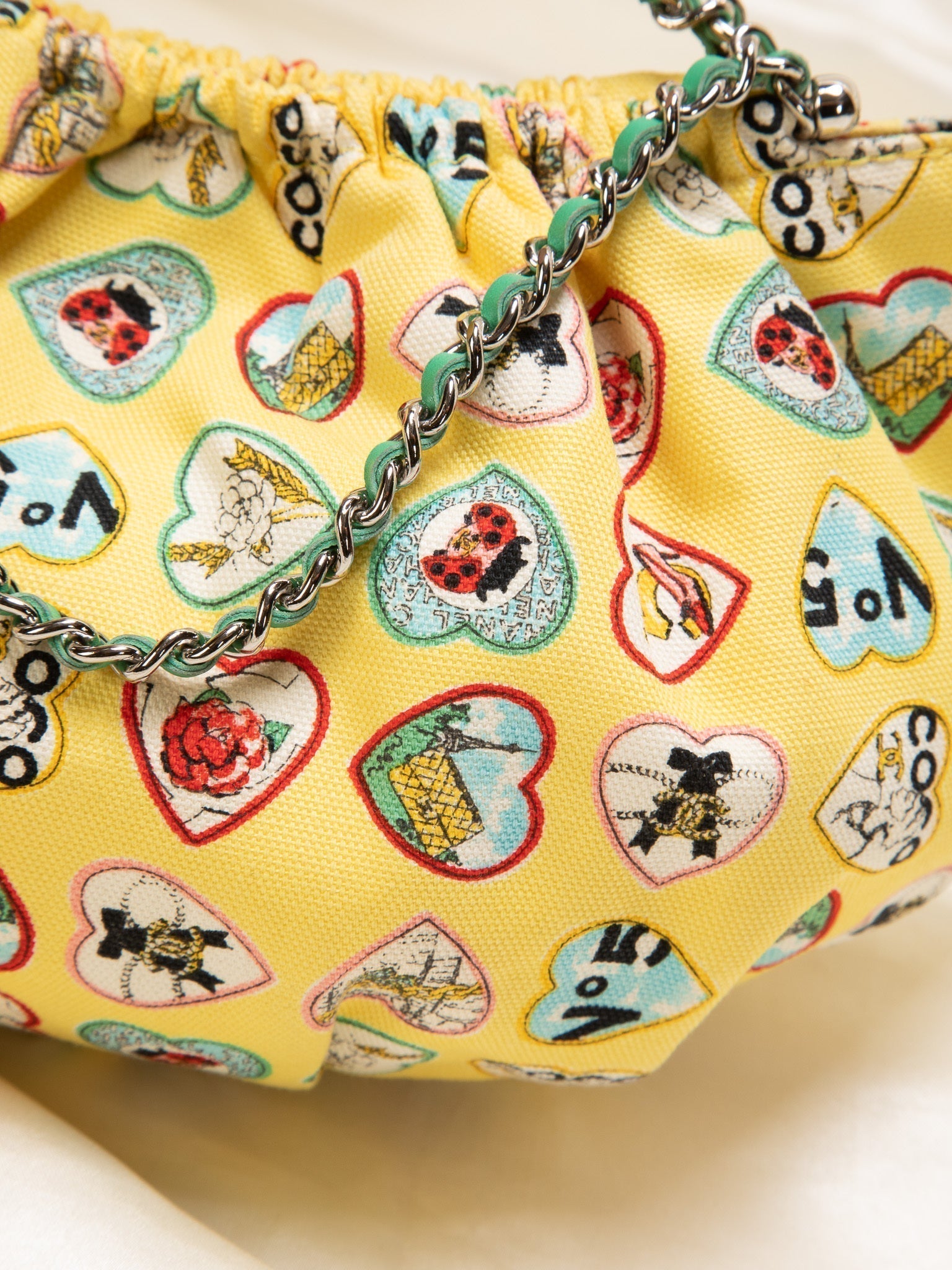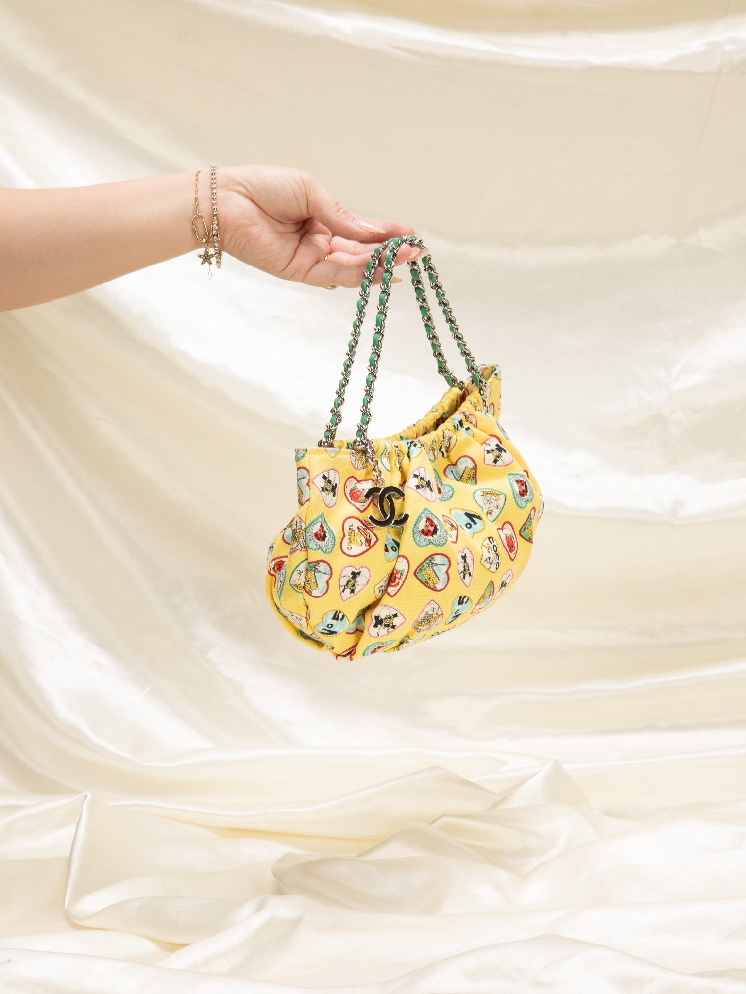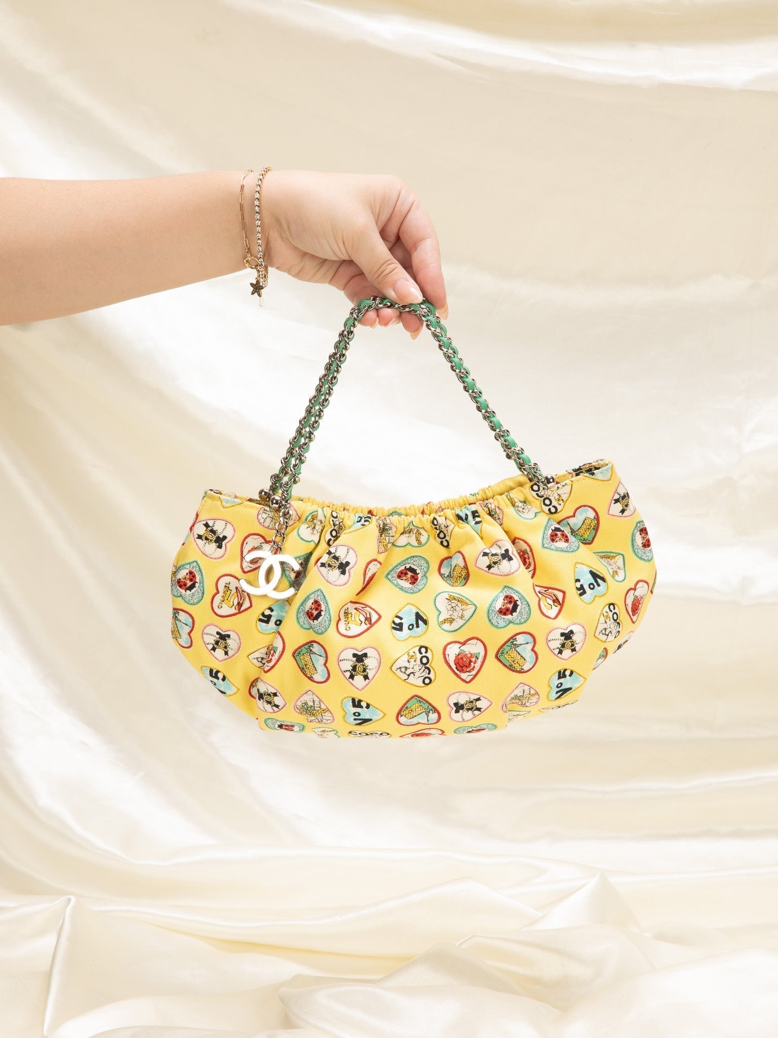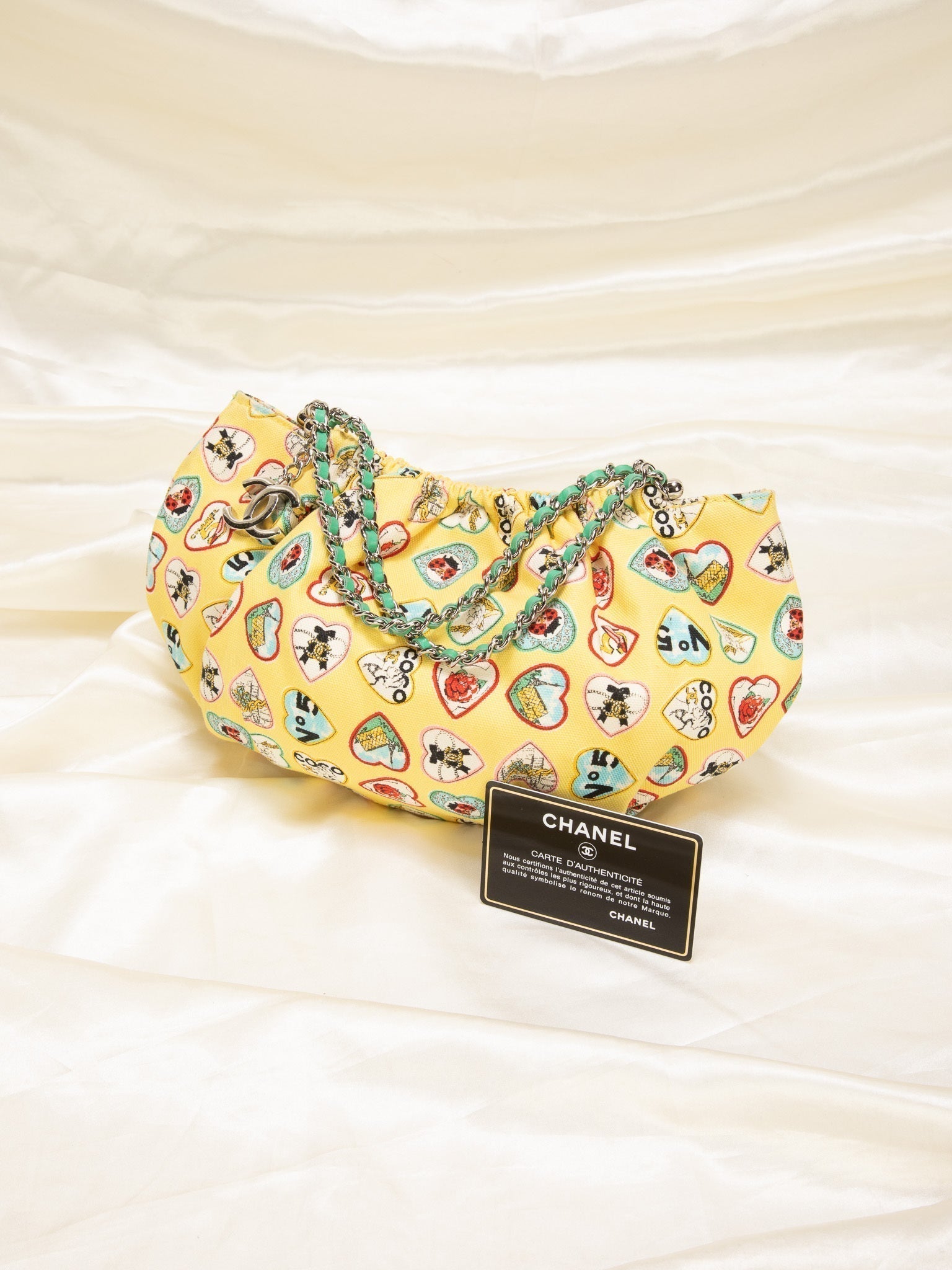 A collector??s Chanel in a bold?yellow canvas. Adorable Chanel "Coco heart" motifs adorn this bag with a large silver Chanel charm.?Crafted in the?2006. 2000+.