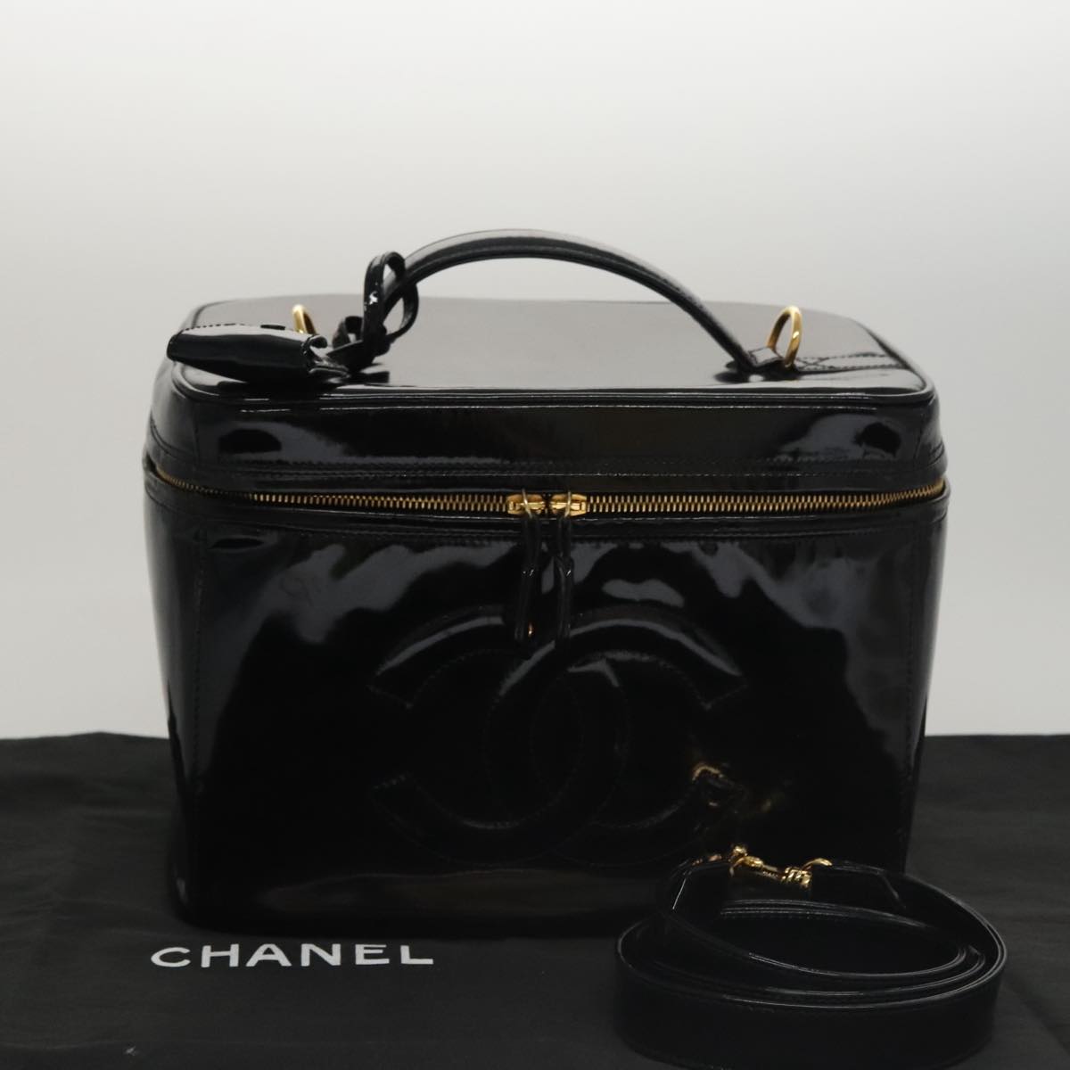 CHANEL Vanity Pouch Patent leather 2way Black Gold CC bs21681