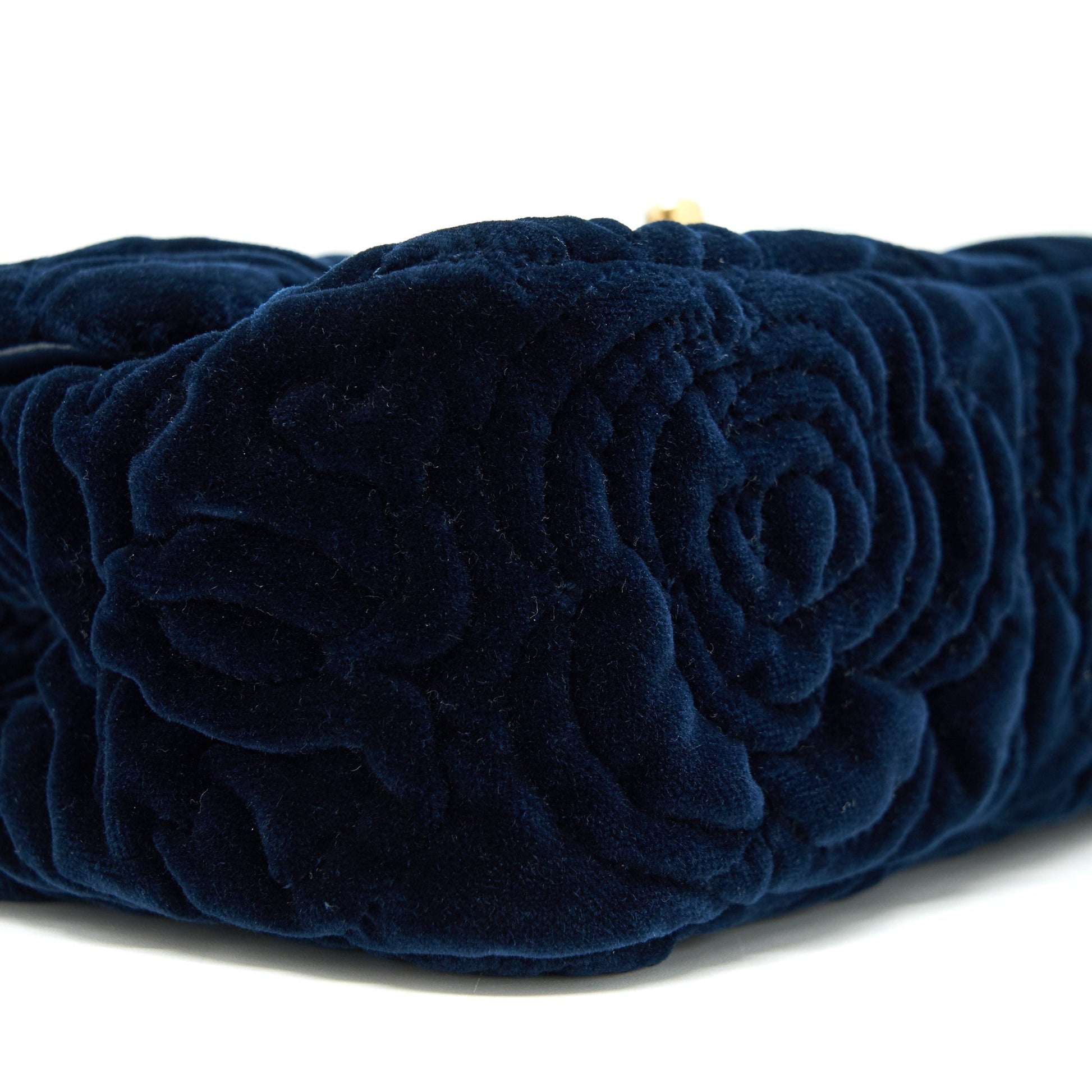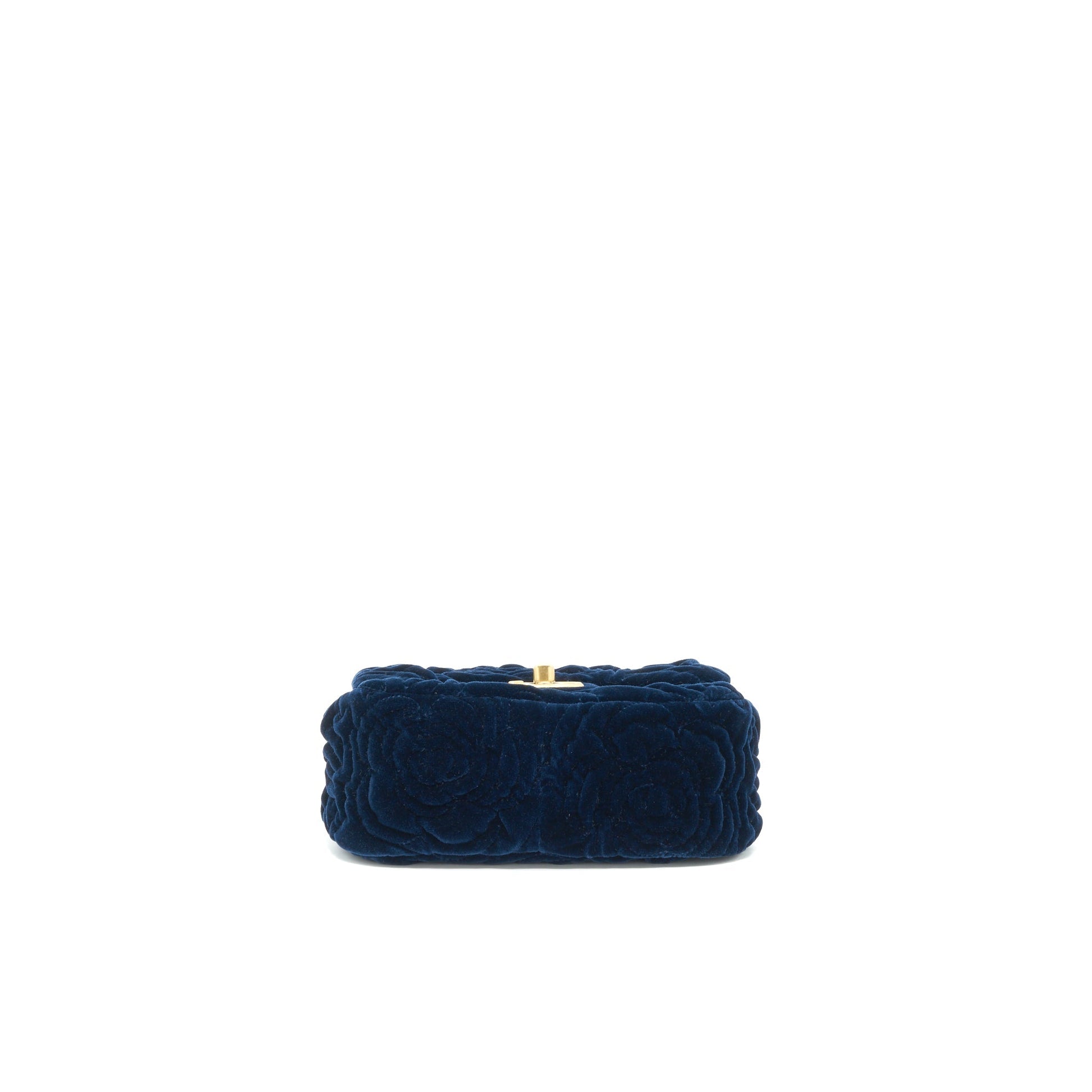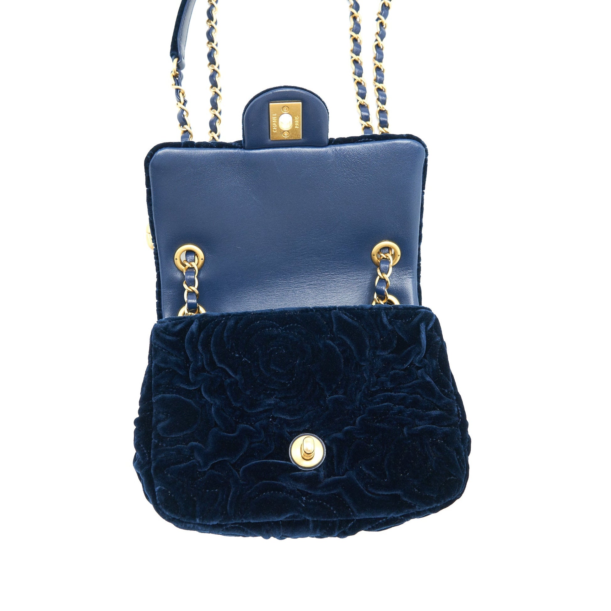 Chanel Velvet Camellia Embossed Mini Square Flap Bag Navy GHW (Microchip)