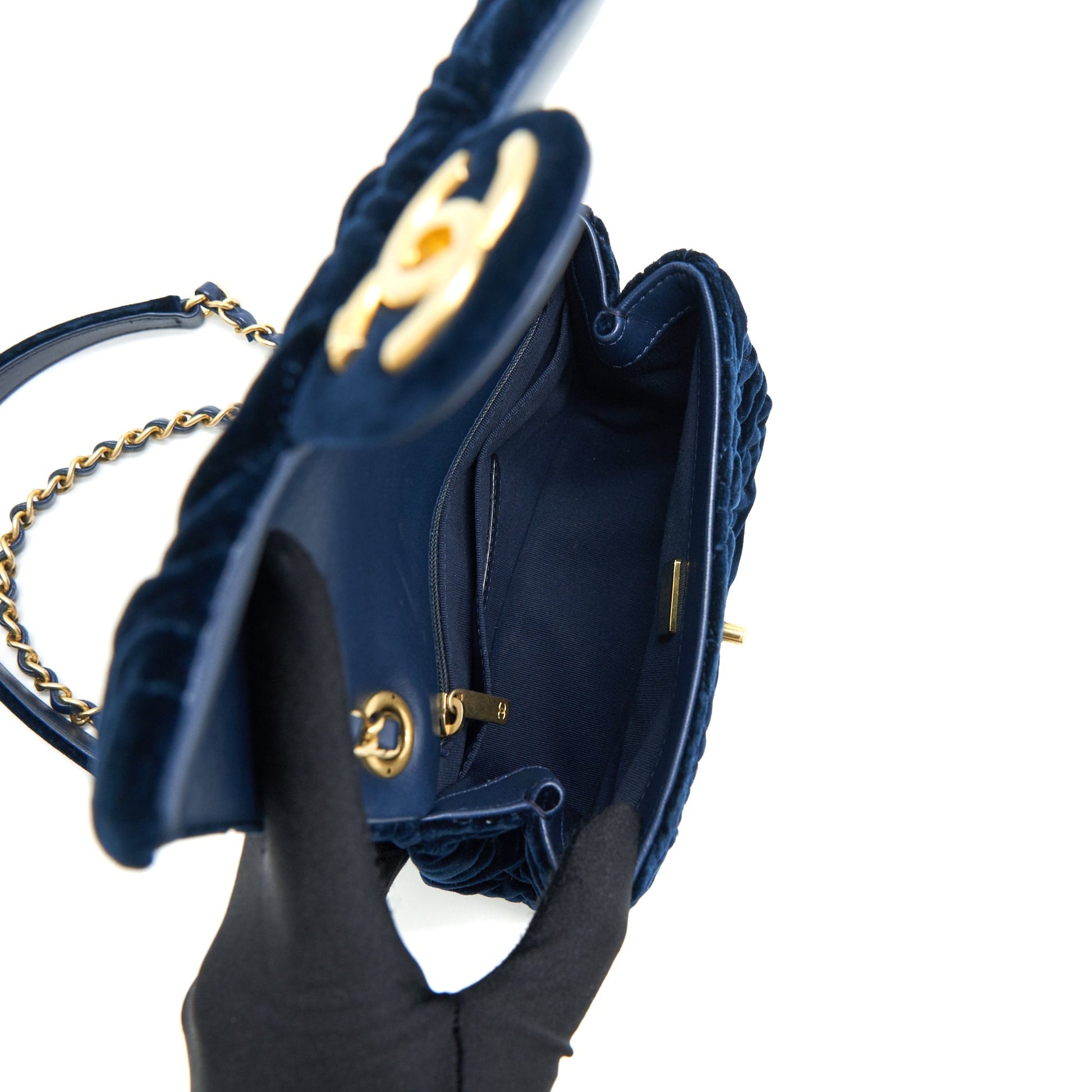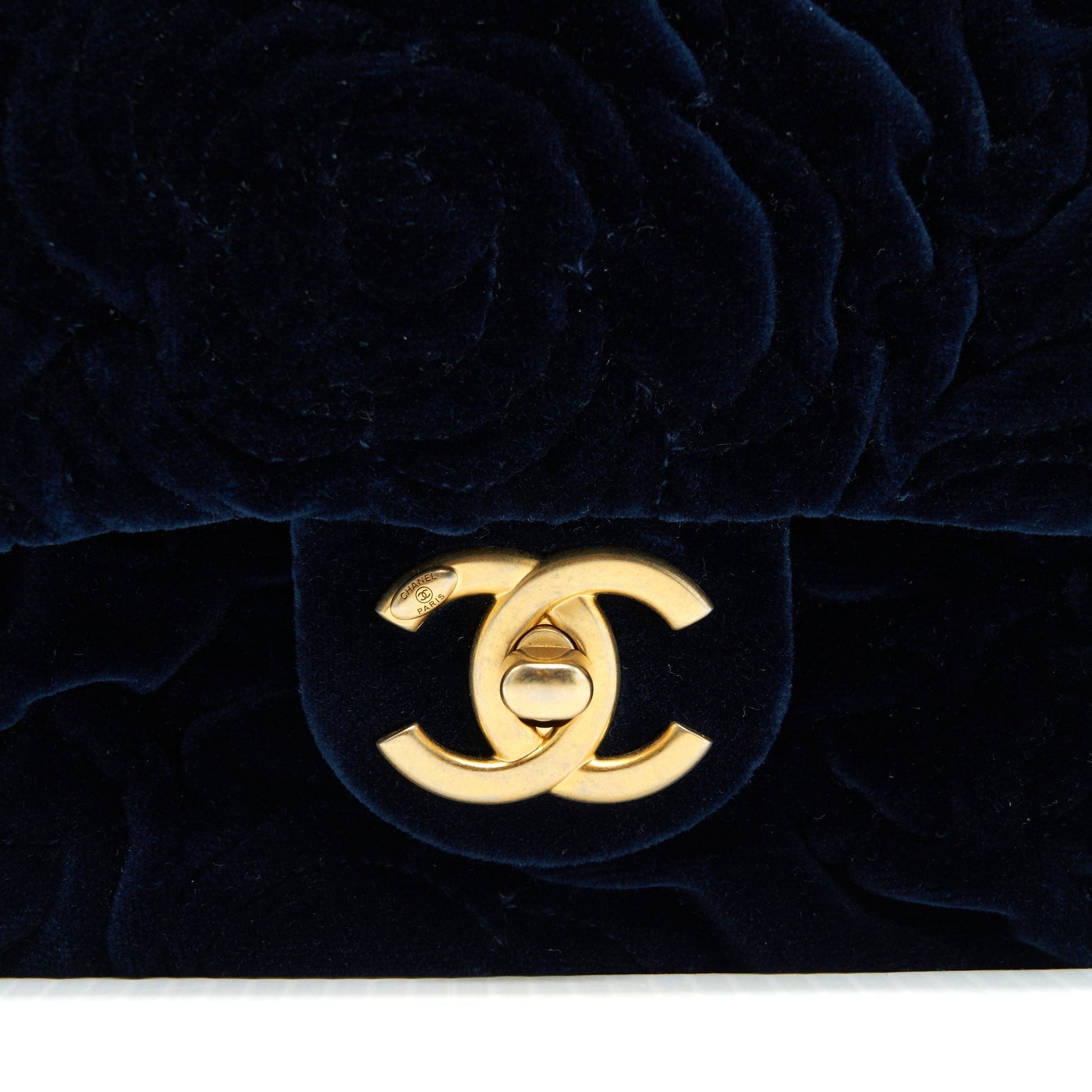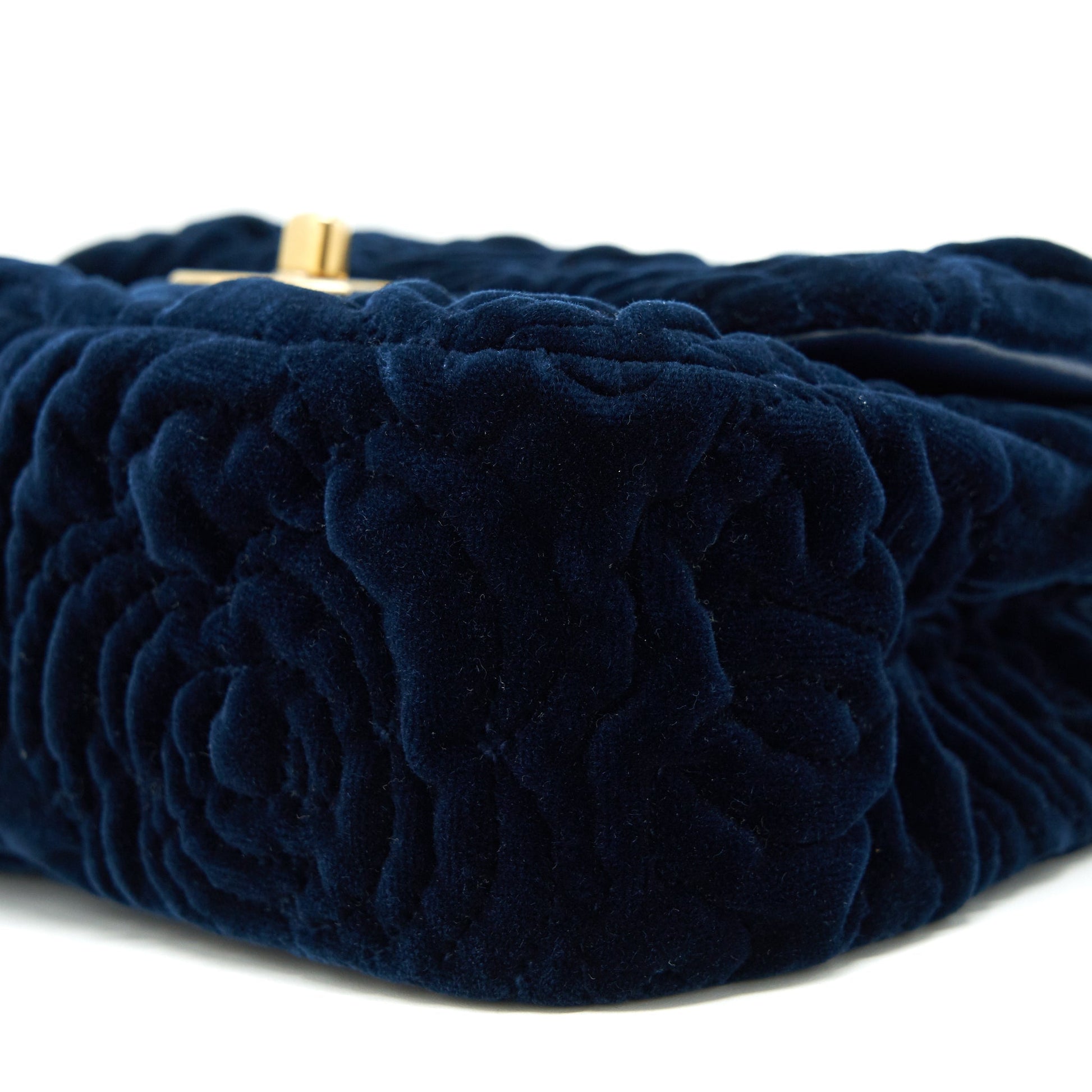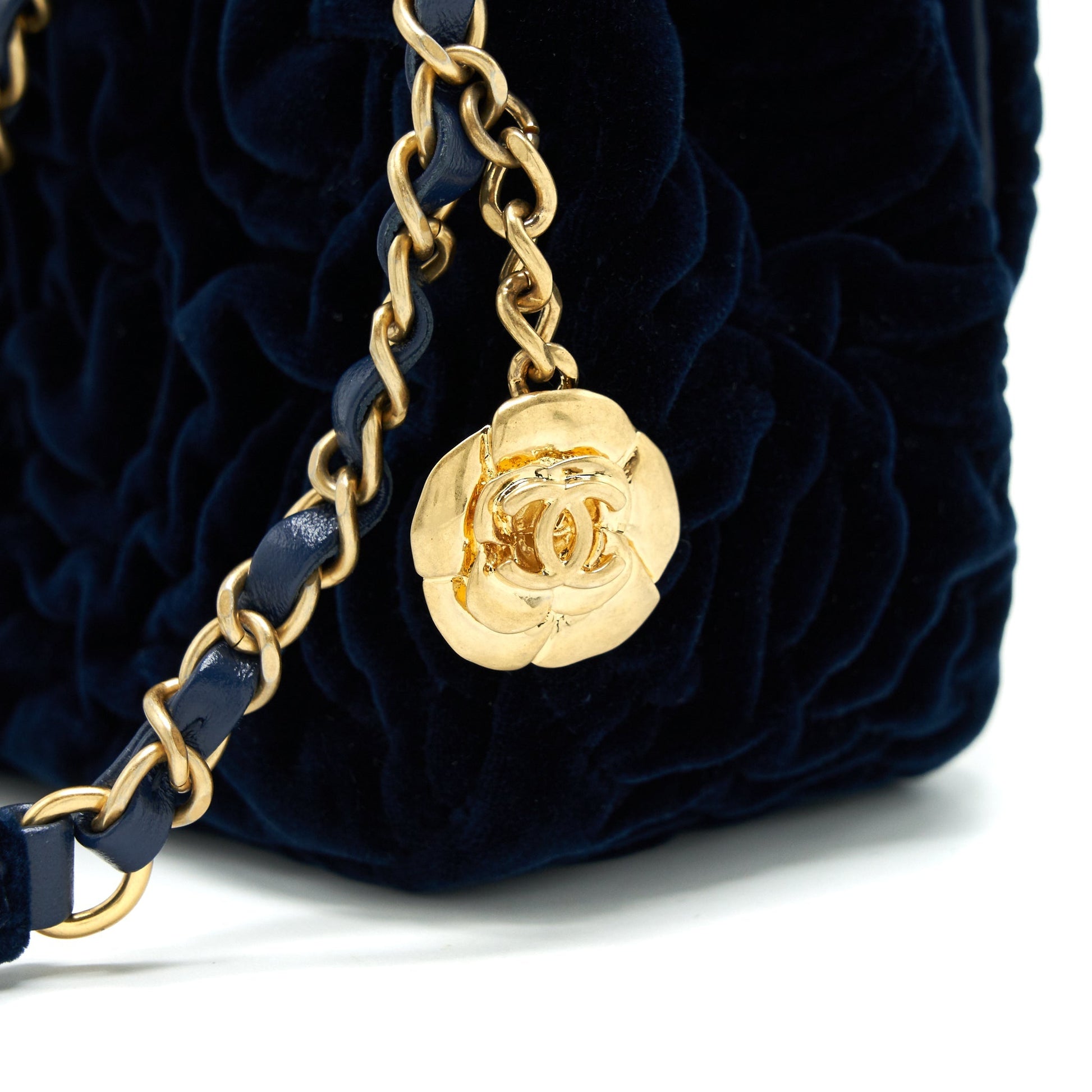 Chanel Velvet Camellia Embossed Mini Square Flap Bag Navy GHW (Microchip)