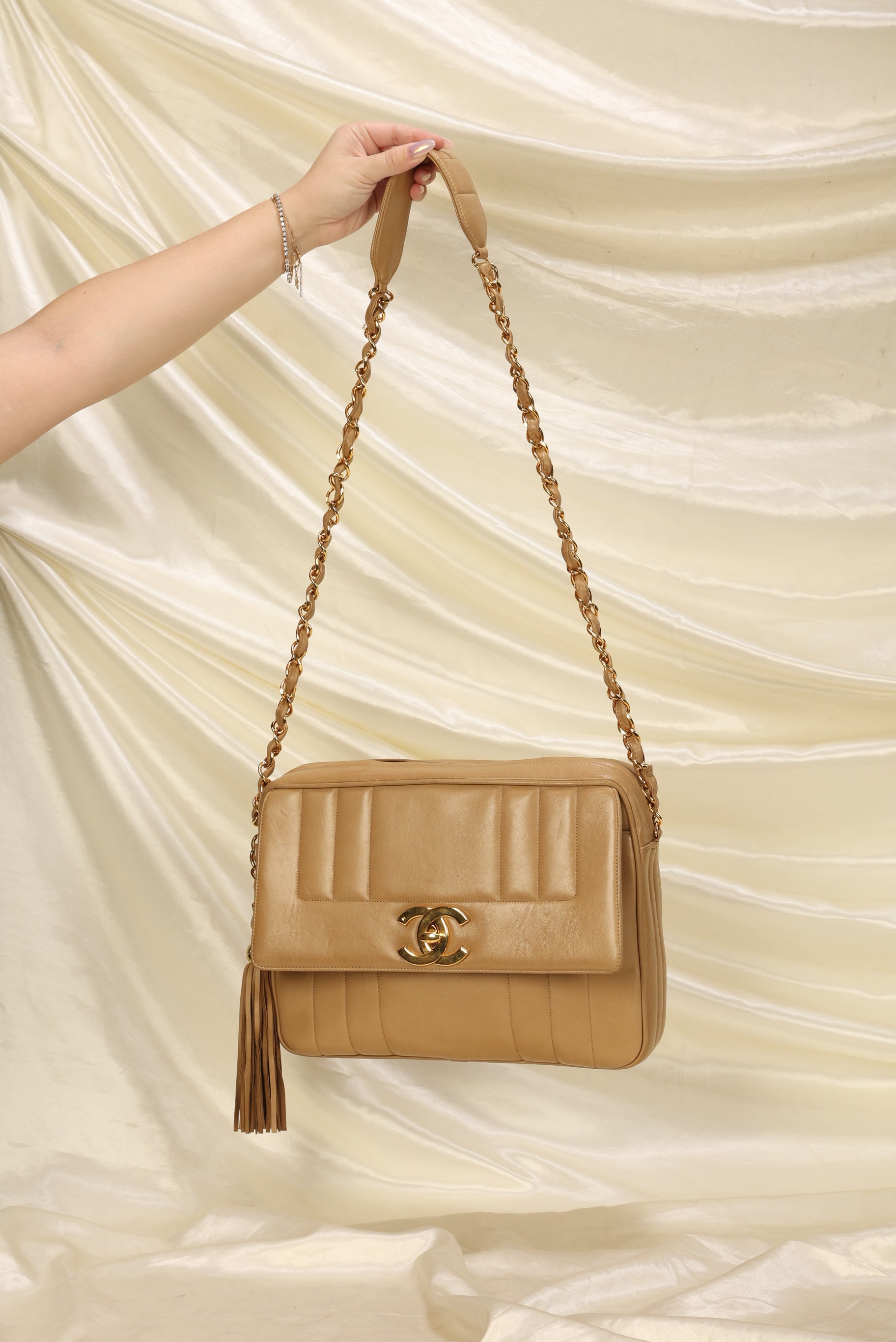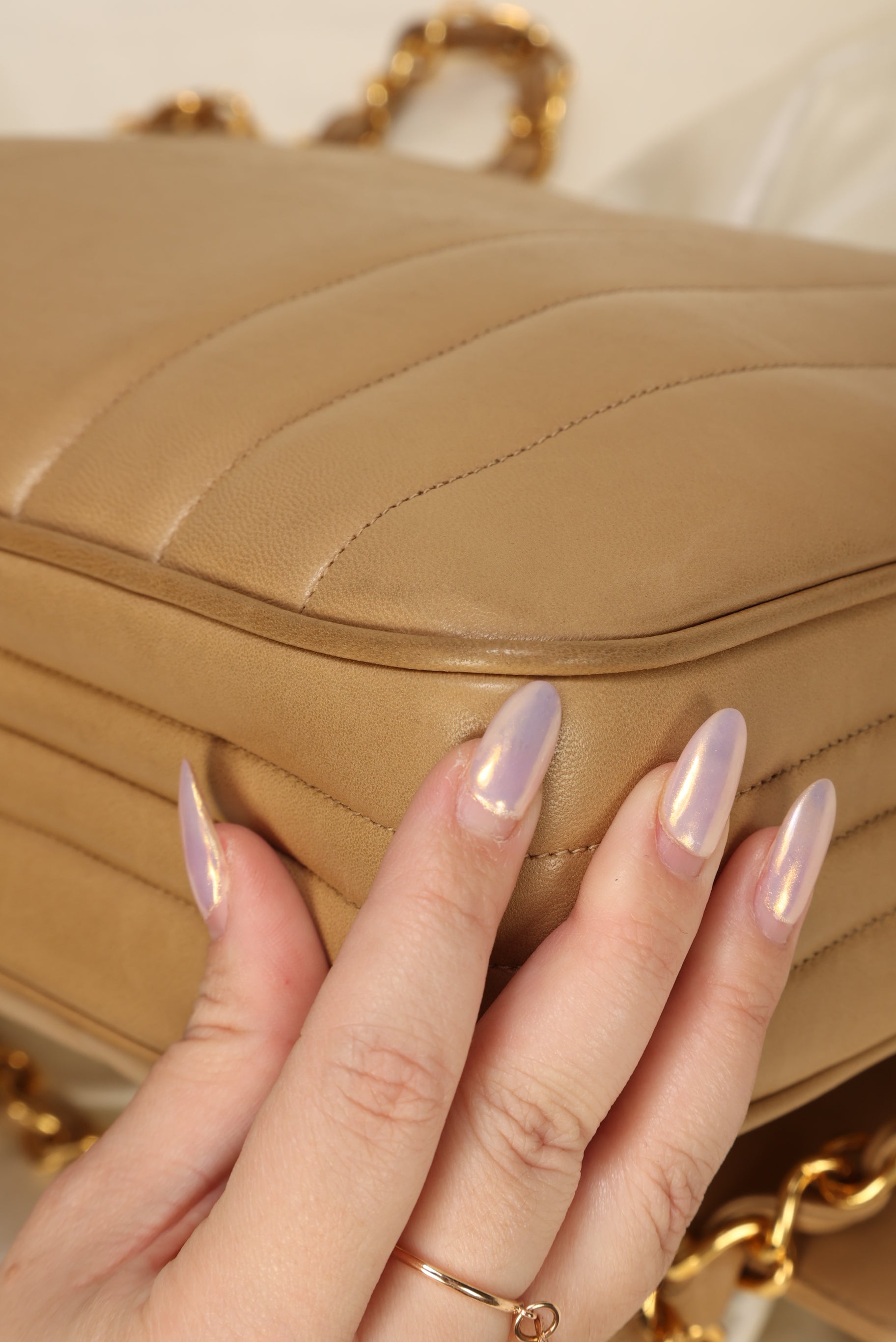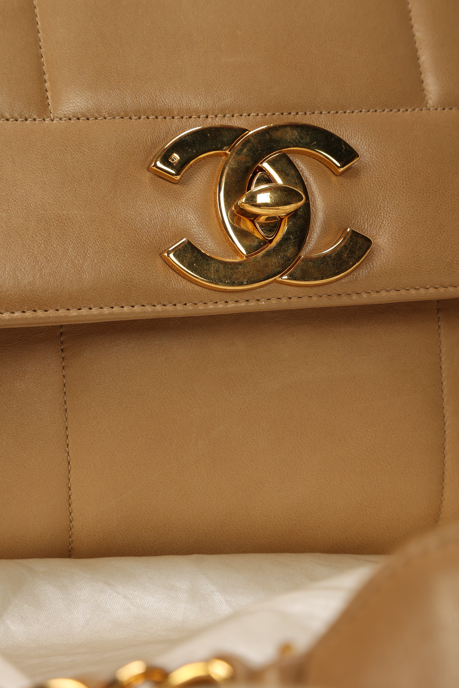 An extremely rare?Chanel gem, crafted in lambskin with vertical quilting and 24K gold plated hardware. Rare large Chanel logo adorns the flap of this bag. Jumbo size makes this a spacious bag with lots of room!