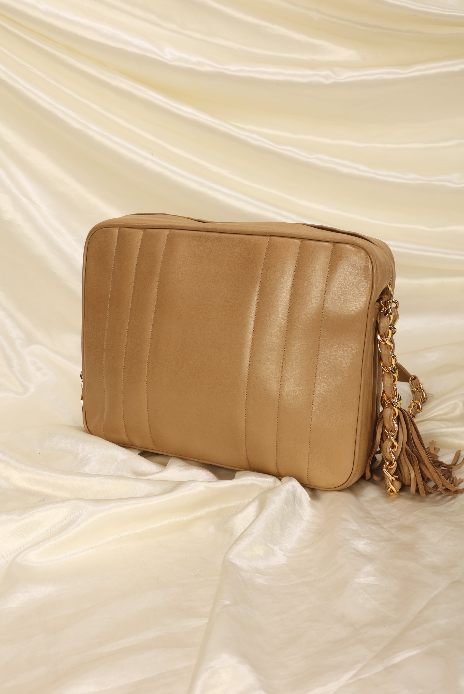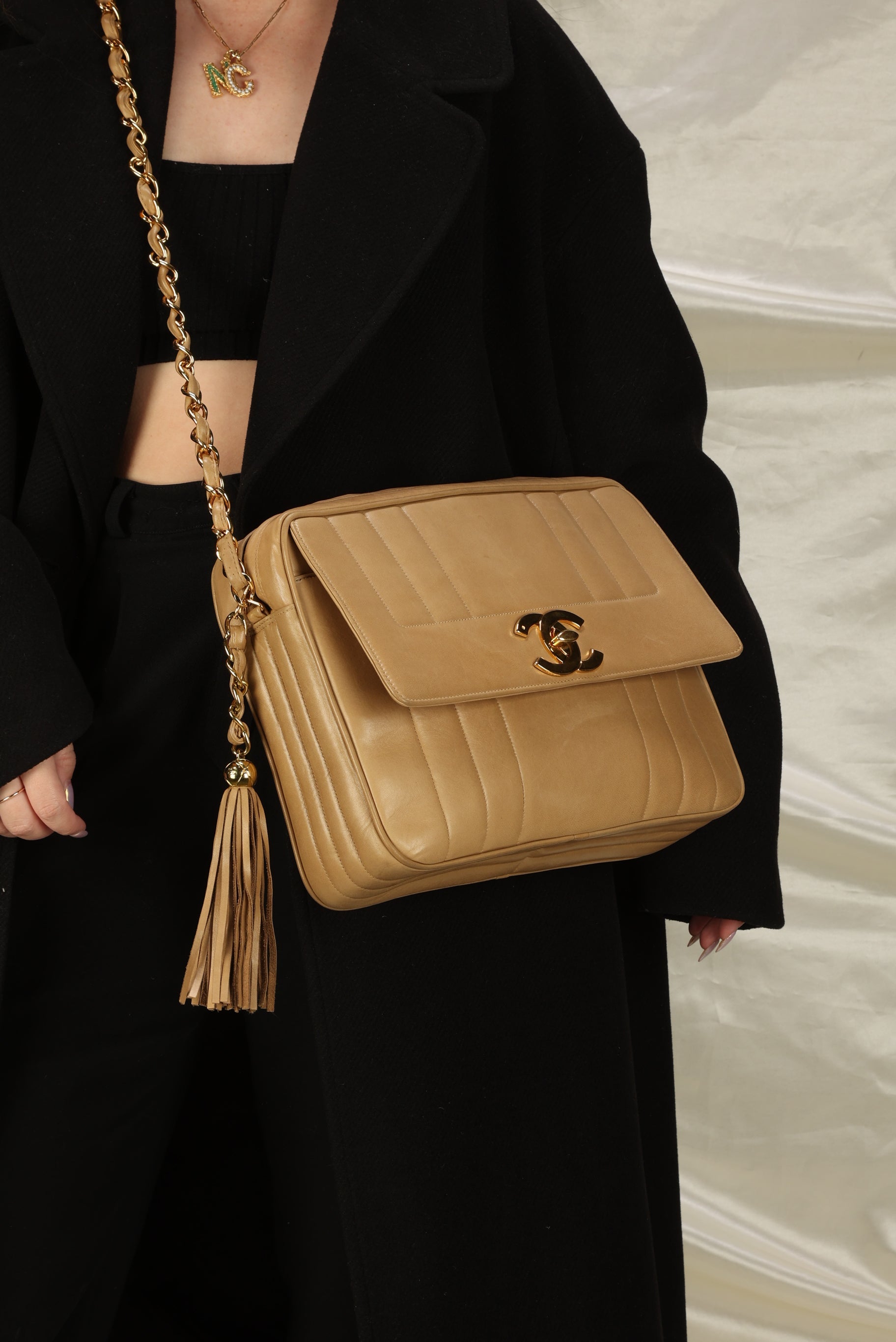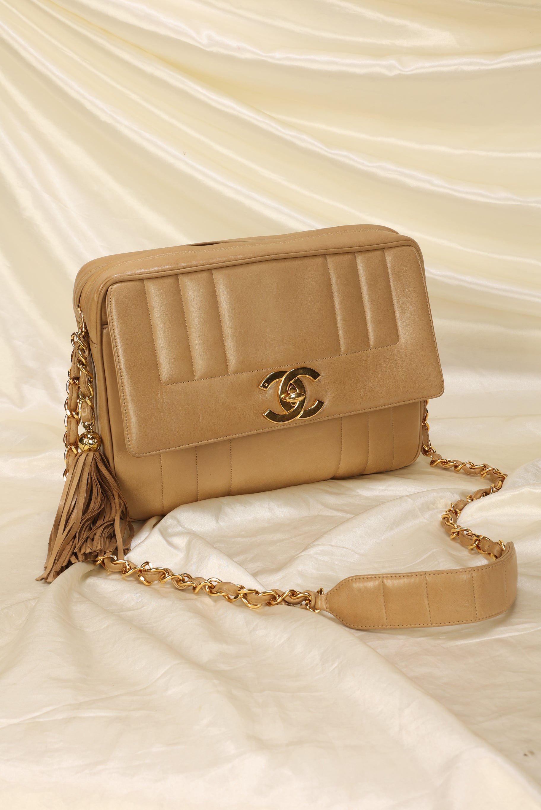An extremely rare?Chanel gem, crafted in lambskin with vertical quilting and 24K gold plated hardware. Rare large Chanel logo adorns the flap of this bag. Jumbo size makes this a spacious bag with lots of room!