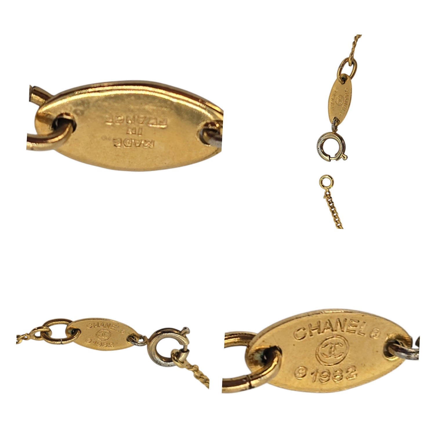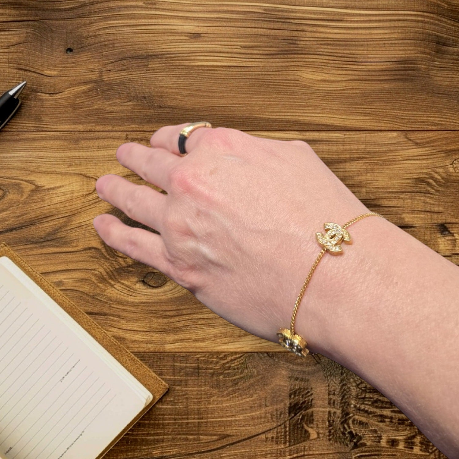 Indulge in the elegance and luxury of CHANEL with this Vintage 1982 Coco Mark CC Rhinestone Station Bracelet. Adorned with sparkling rhinestones and gold-tone accents, this piece will elevate any outfit, from casual to formal. The timeless style of Chanel shines through, making this bracelet a must-have for any fashion-forward individual. Includes Chanel Box.