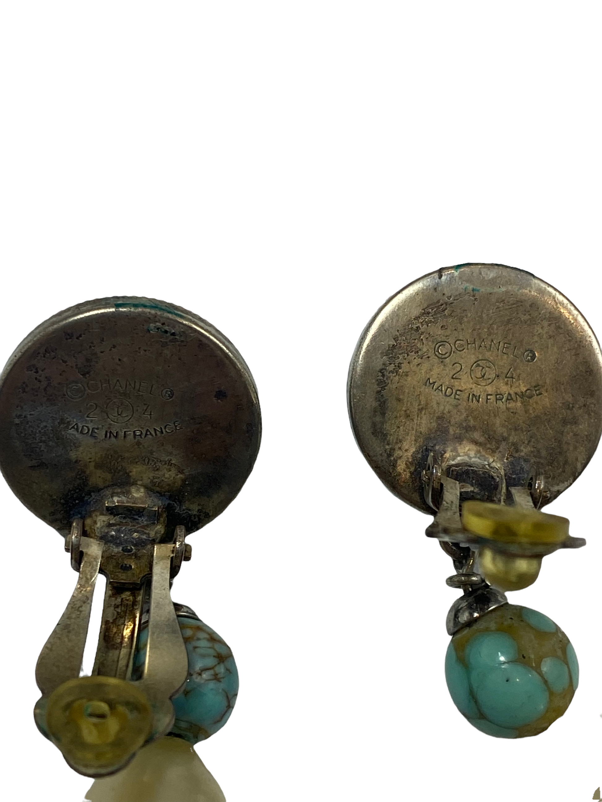 DESCRIPTION: Chanel pendant earrings with turquoise stone and white pearls, Chanel logo