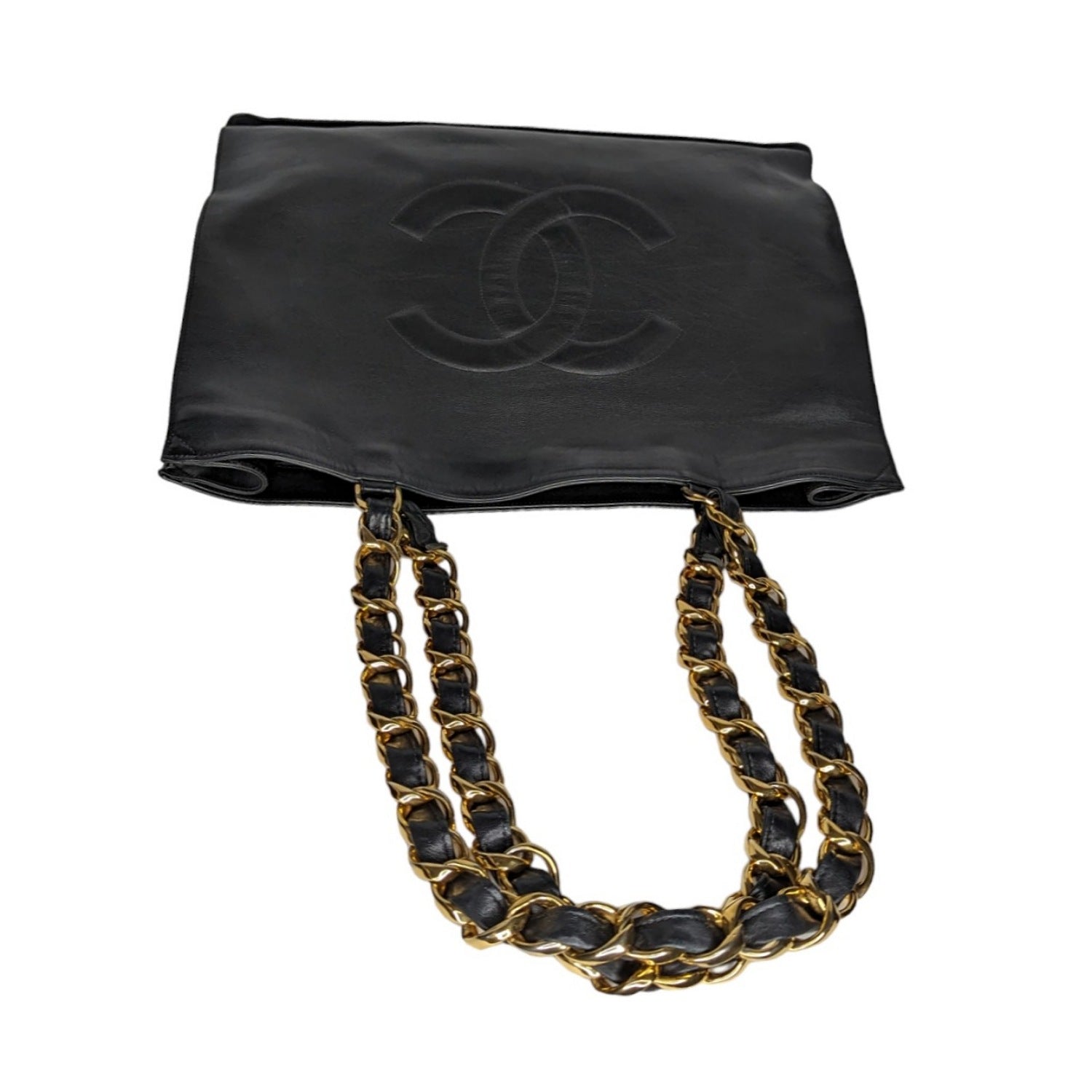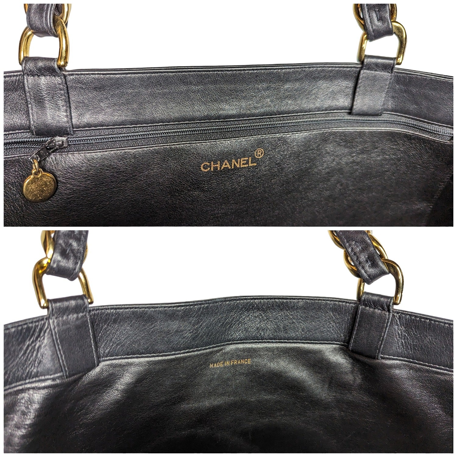 Chanel Vintage CC Chain Shopper Tote. This stunning tote, circa 90s, is crafted of luxuriously smooth Calfskin leather in black. The bag features a large, stitched CC quilted logo and leather threaded chain link straps. The top opens to a black leather interior with a zipper pocket. Made in France.