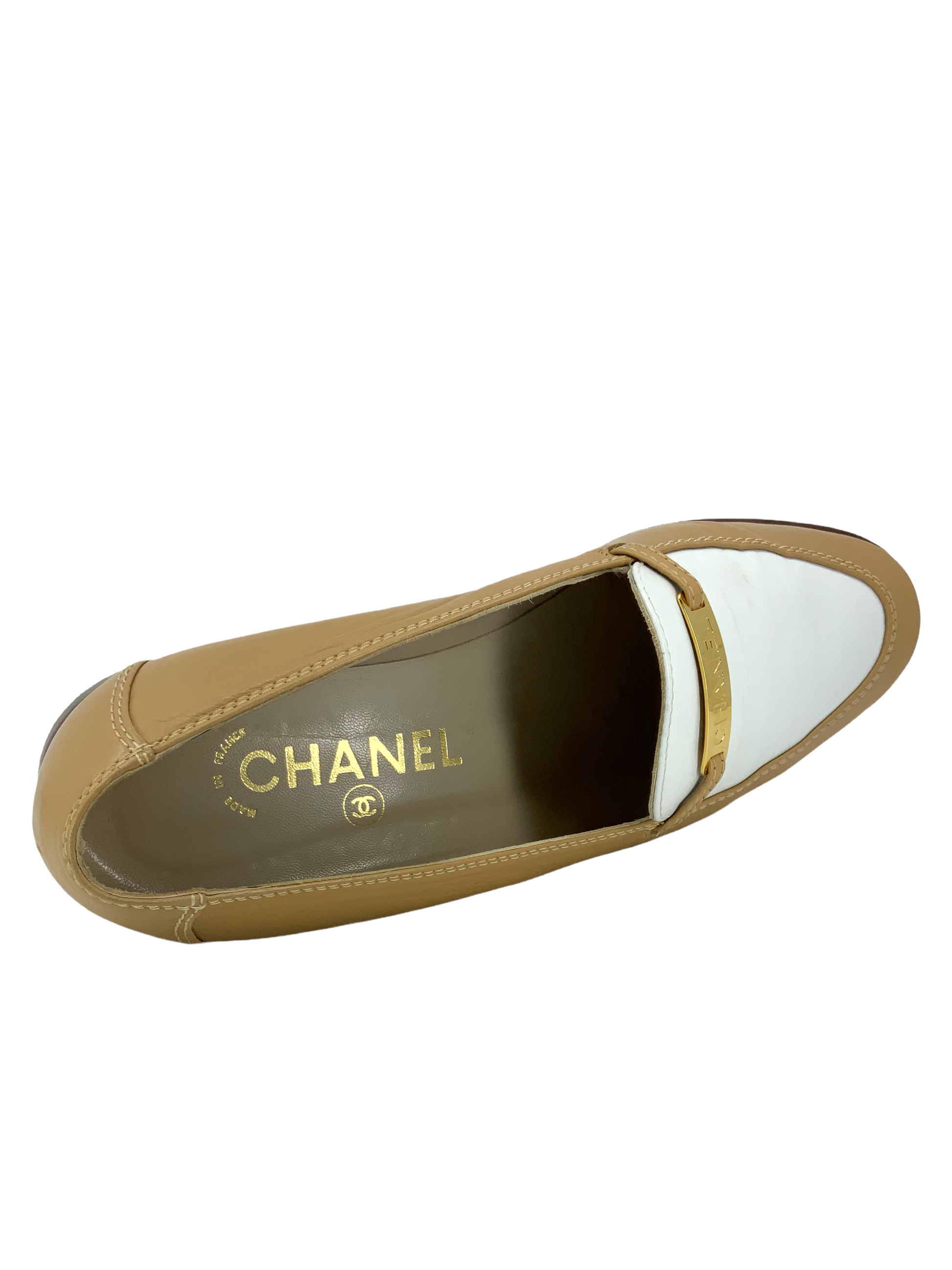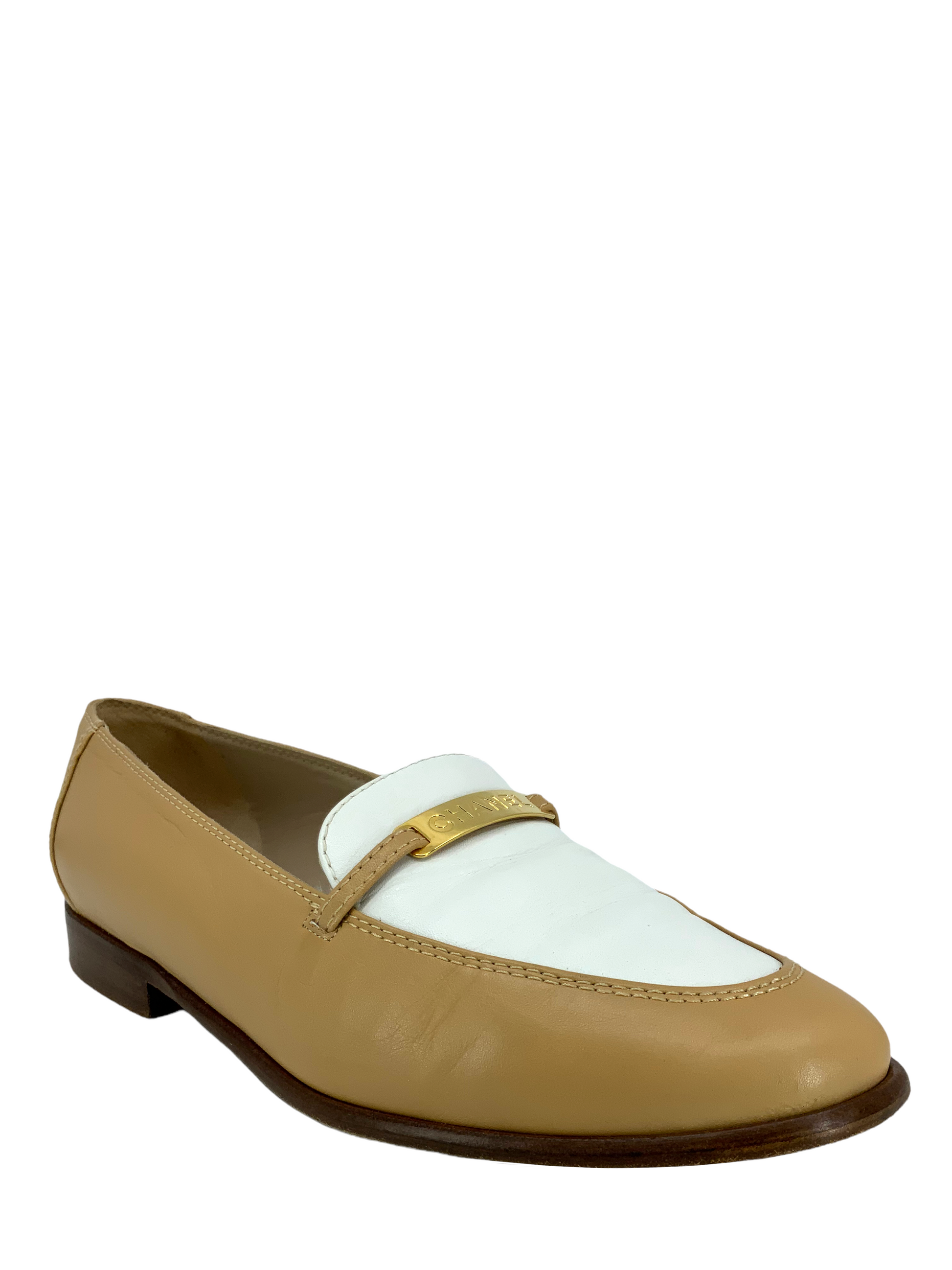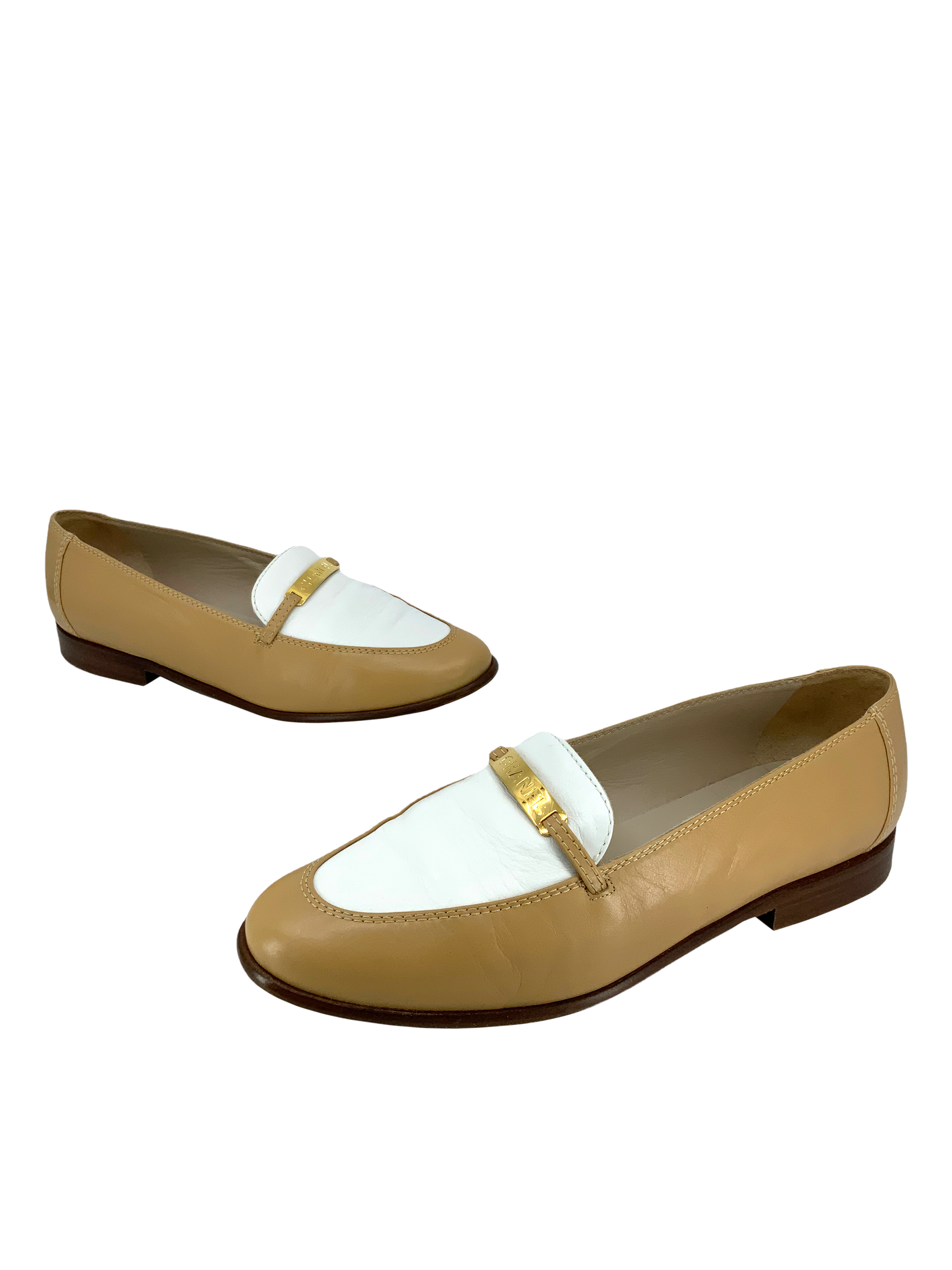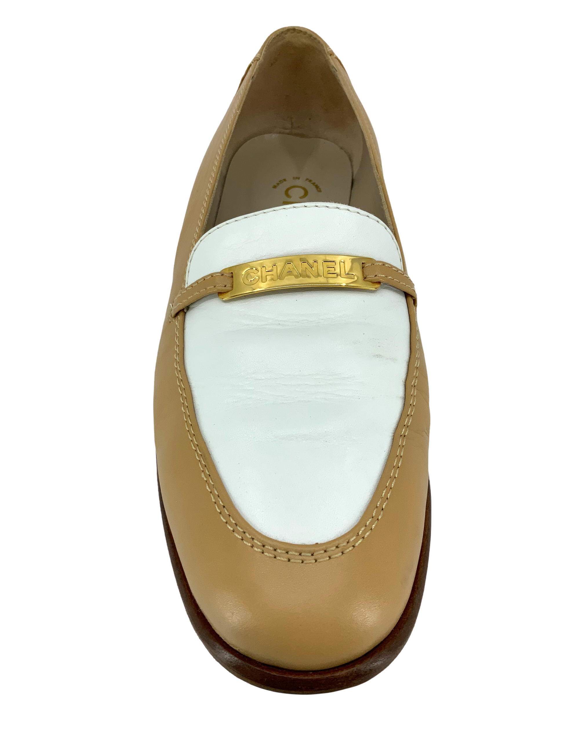 Add to your collection this pair of Chanel Vintage Calfskin Finition Main Loafers Size 7.5 | 37.5 crafted fromsupple beigeand white leather uppers with awell-rounded toe. Featuringa gold-tone metal logo accent on the vamp and alow stacked heel.