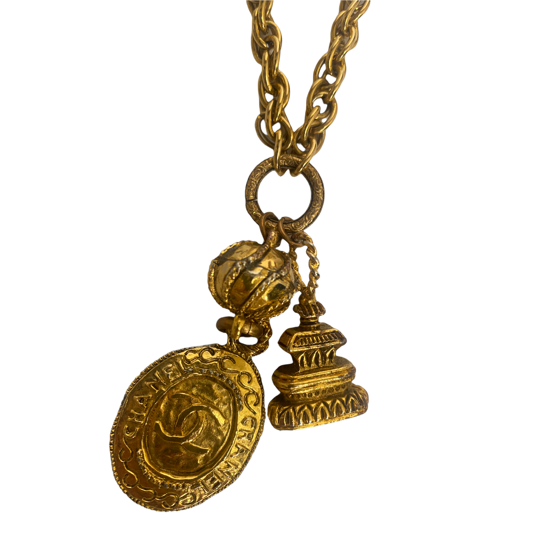 DESCRIPTION: Chanel vintage long necklace in golden metal embellished with a plaque of the house logo and a wax seal. Signed.