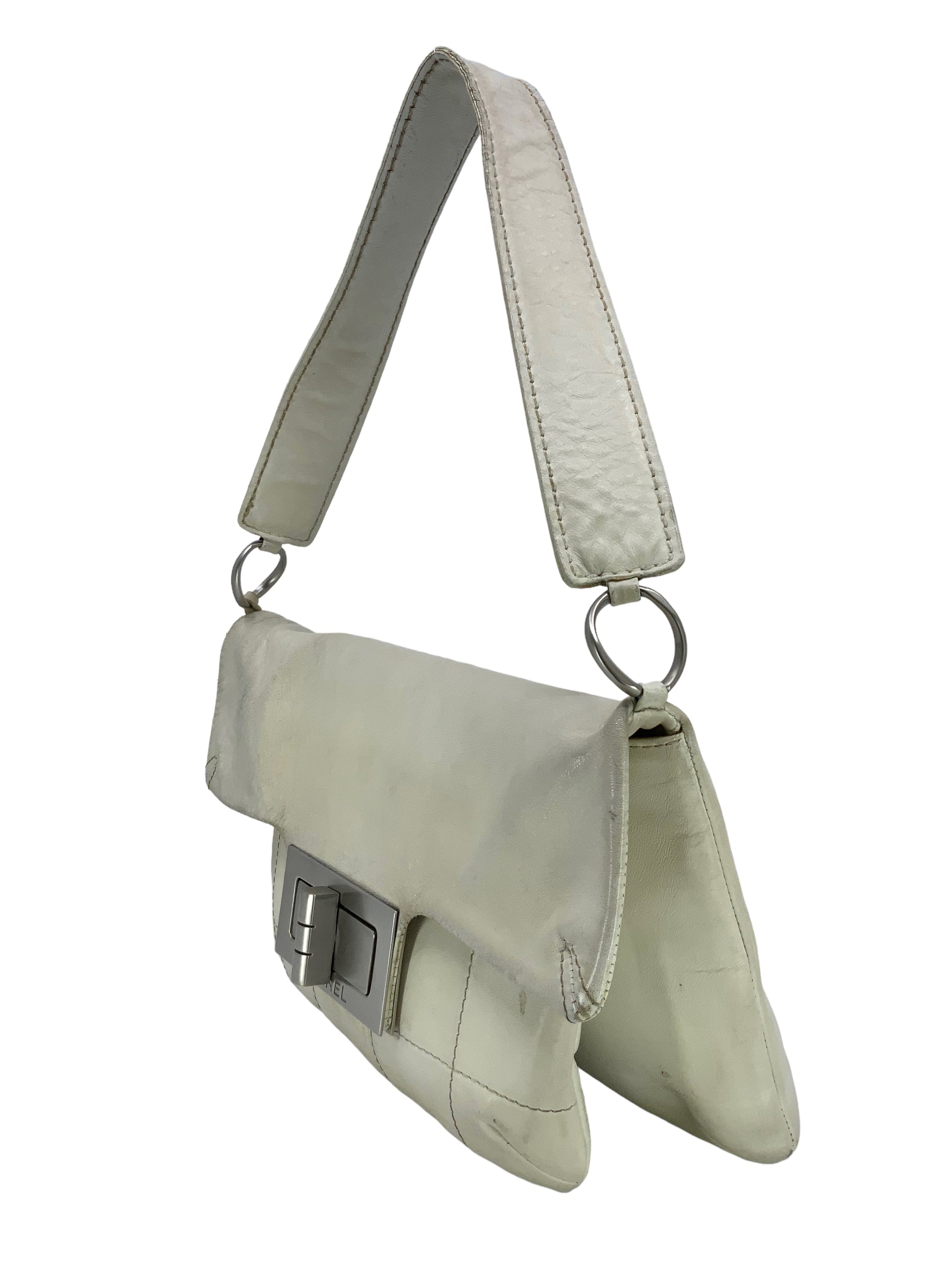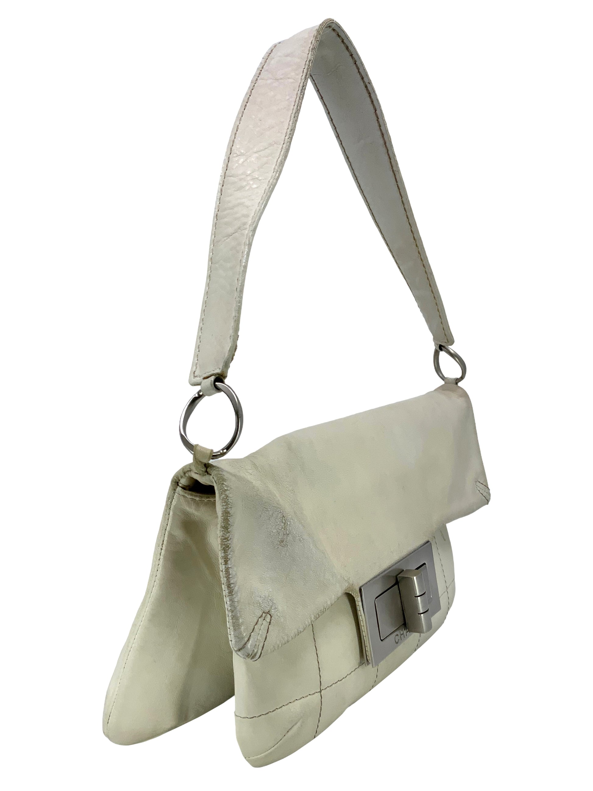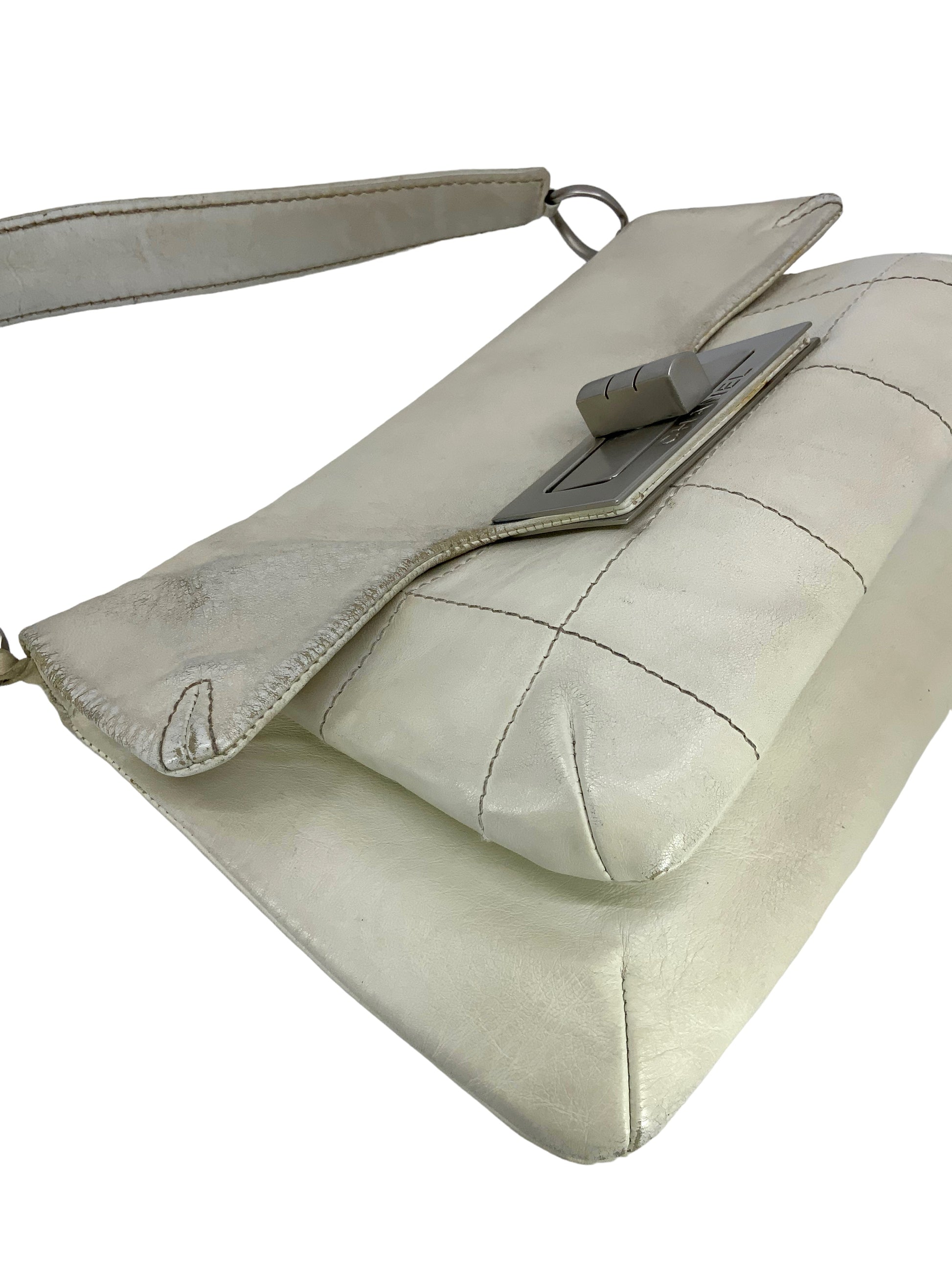 We the ity of this chic and sophisticated CHANEL Vintage Chocolate Bar Mademoiselle Turn Lock Flap Bag crafted from softsquare quilted cream leather and silver-tone hardware. This highly sought after and extremely rare bag features a single flat leather shoulder strap and a single frontal flap with an oversized signature logo-engraved Mademoiselle turn-lock closure.