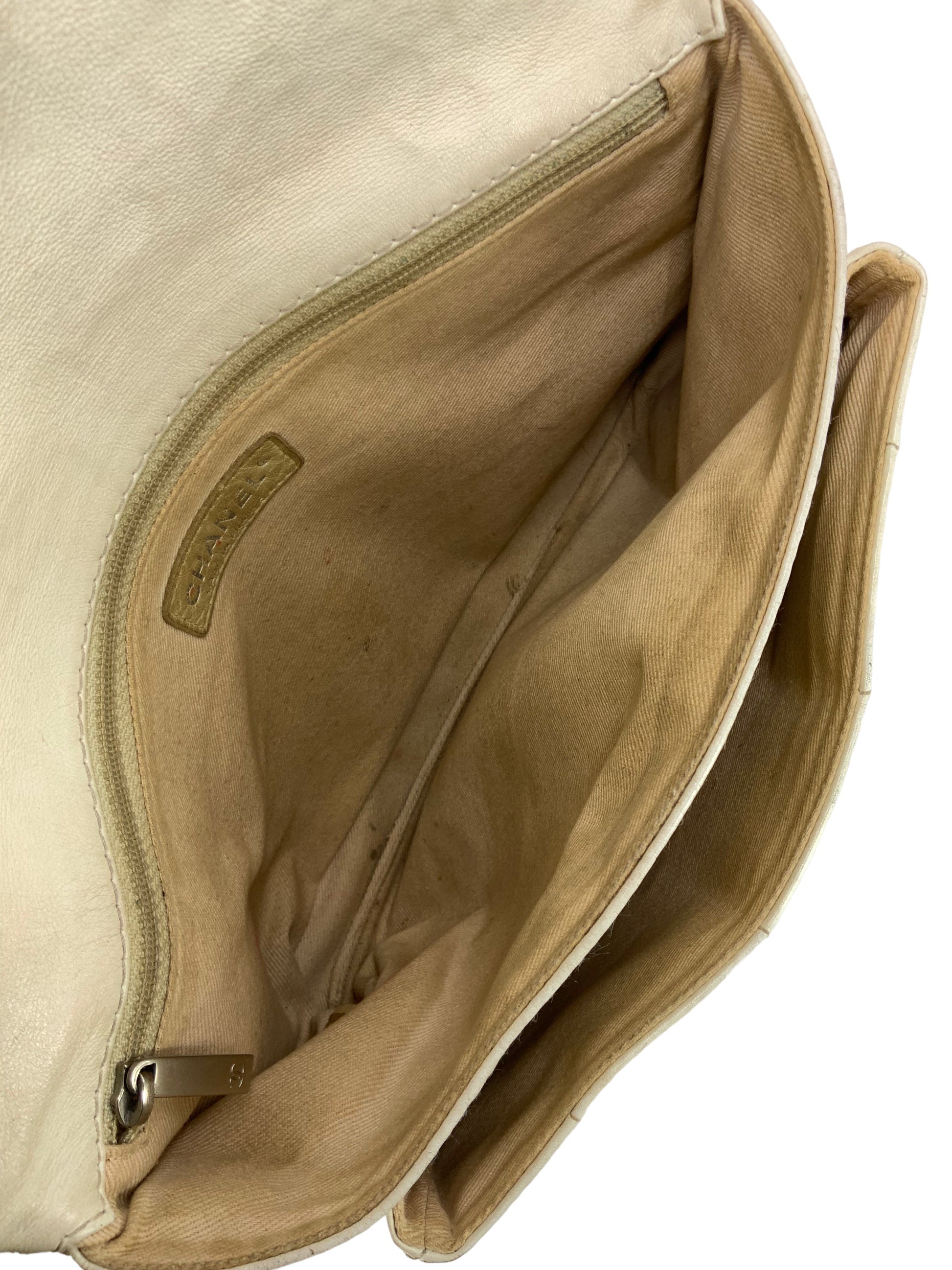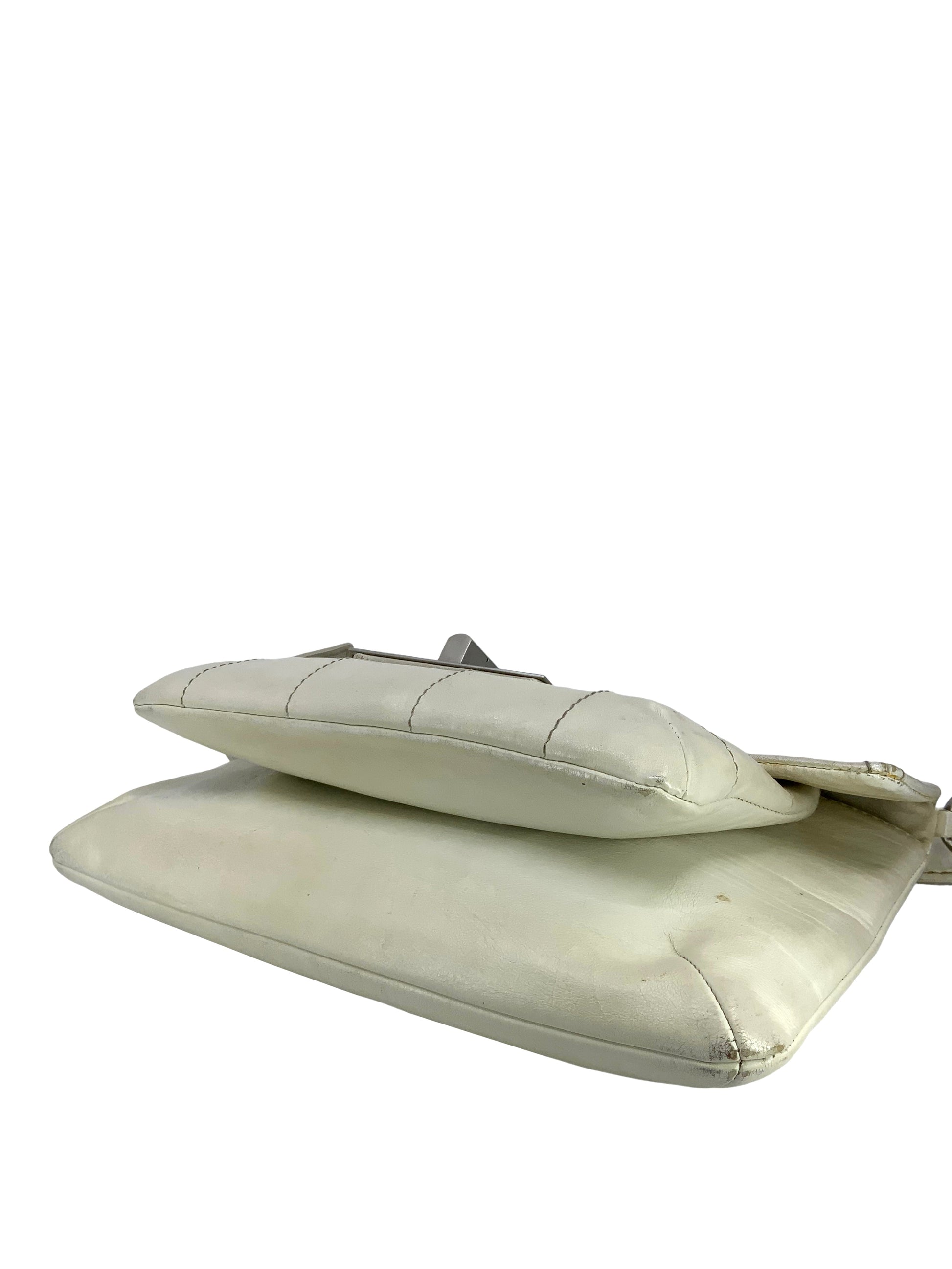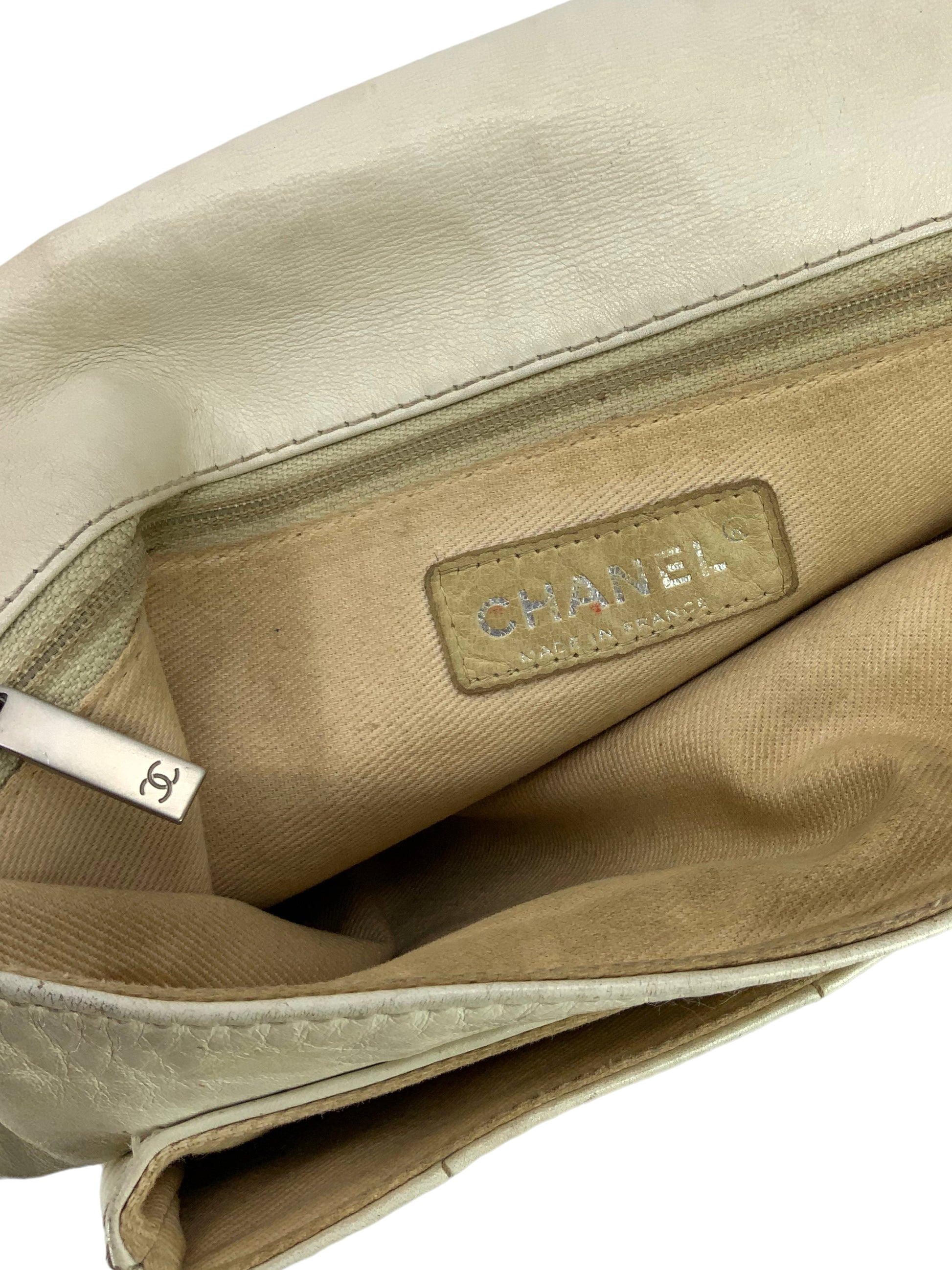 We the ity of this chic and sophisticated CHANEL Vintage Chocolate Bar Mademoiselle Turn Lock Flap Bag crafted from softsquare quilted cream leather and silver-tone hardware. This highly sought after and extremely rare bag features a single flat leather shoulder strap and a single frontal flap with an oversized signature logo-engraved Mademoiselle turn-lock closure.