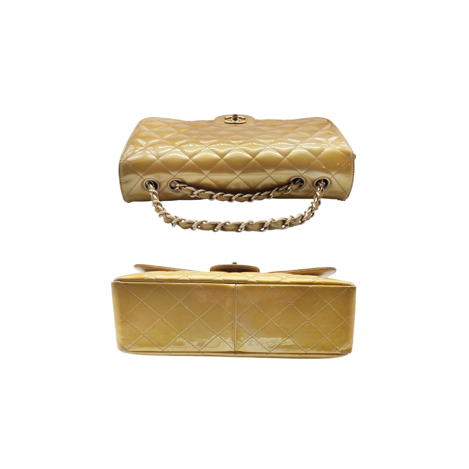 This Chanel Patent Quilted Jumbo Single Flap is crafted of fine diamond-quilted glossy patent leather. The bag features leather threaded gold chain shoulder straps and a facing half flap with a light gold Chanel CC turn lock. This opens to a matte beige leather interior with zipper and patch pockets. Comes with an Entrupy for peace of mind.
