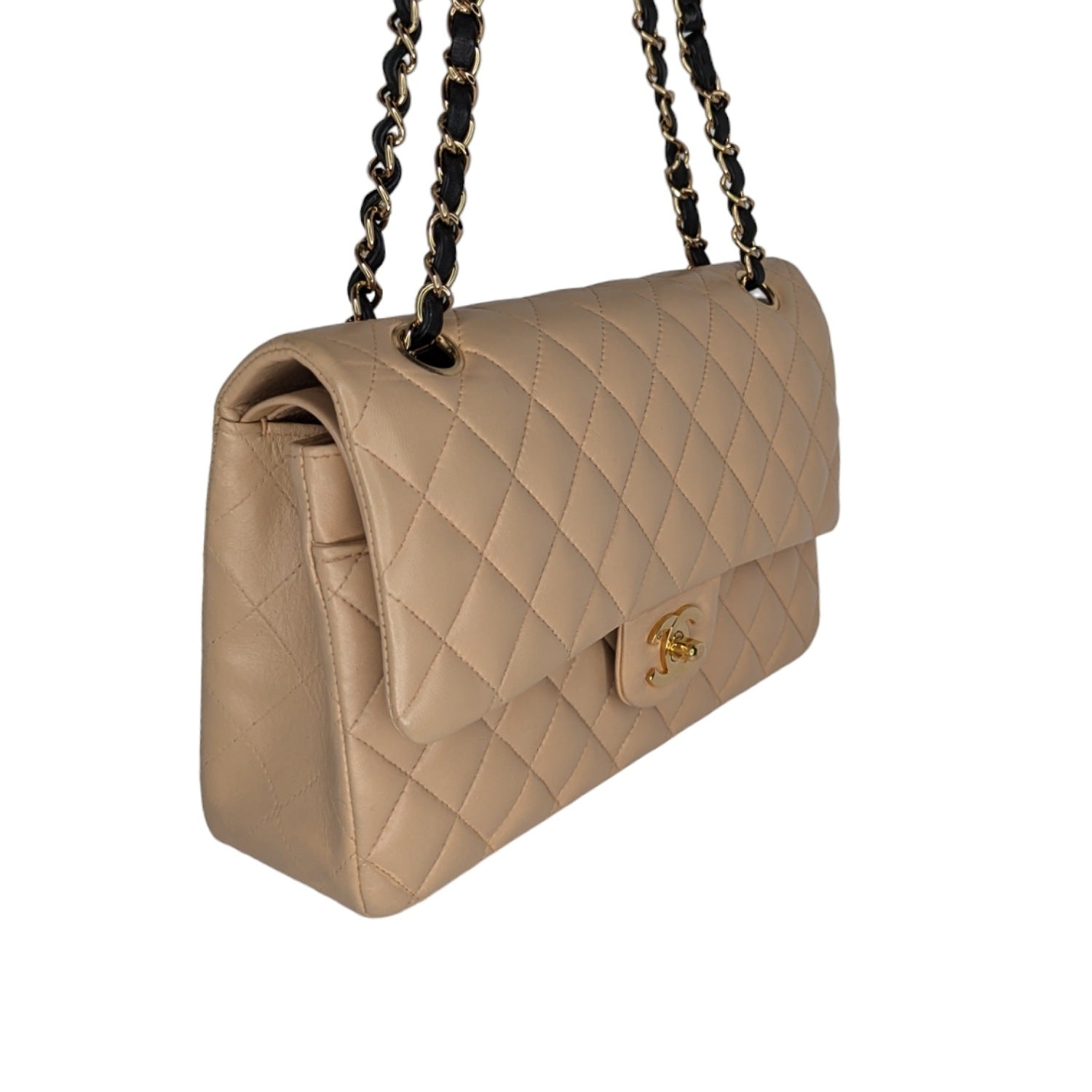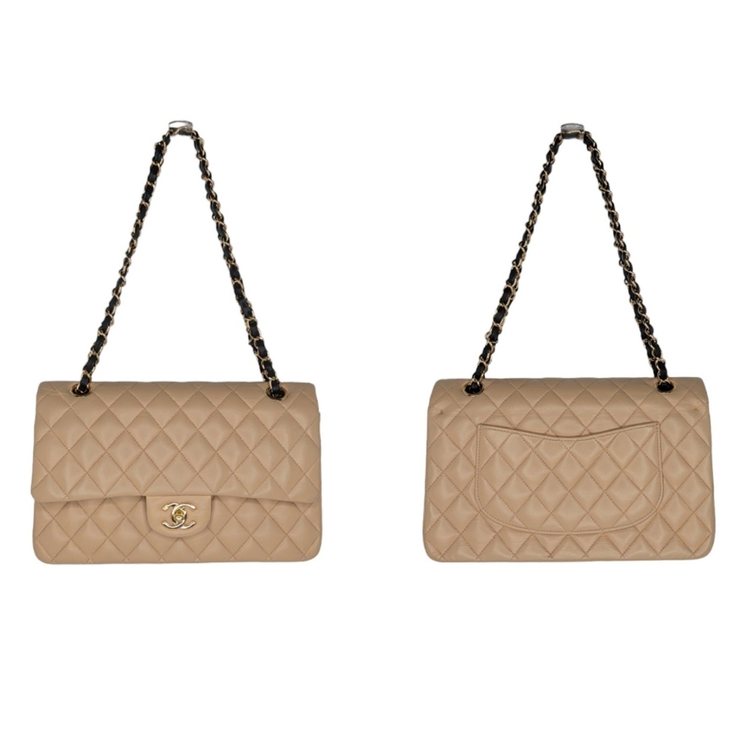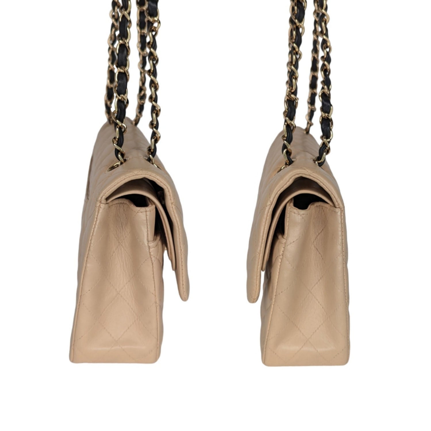 From the 2005 Collection by Karl Lagerfeld; Chanel Classic Lambskin Quilted Medium Double Flap. This stylish vintage flap bag is finely crafted of diamond quilted lambskin leather in beige. The bag features a gold chain and black leather threaded shoulder strap and 24K gold-plated Chanel CC logo turn-lock on the flap. This opens to a spacious matching leather interior with plenty compartments and patch pockets. 10,800.